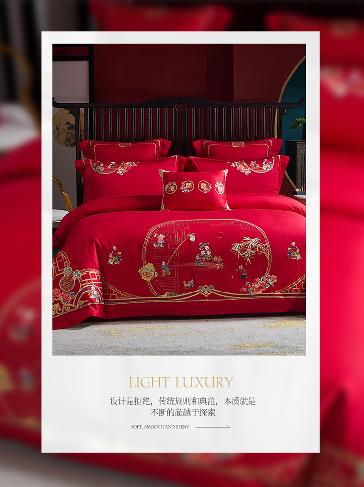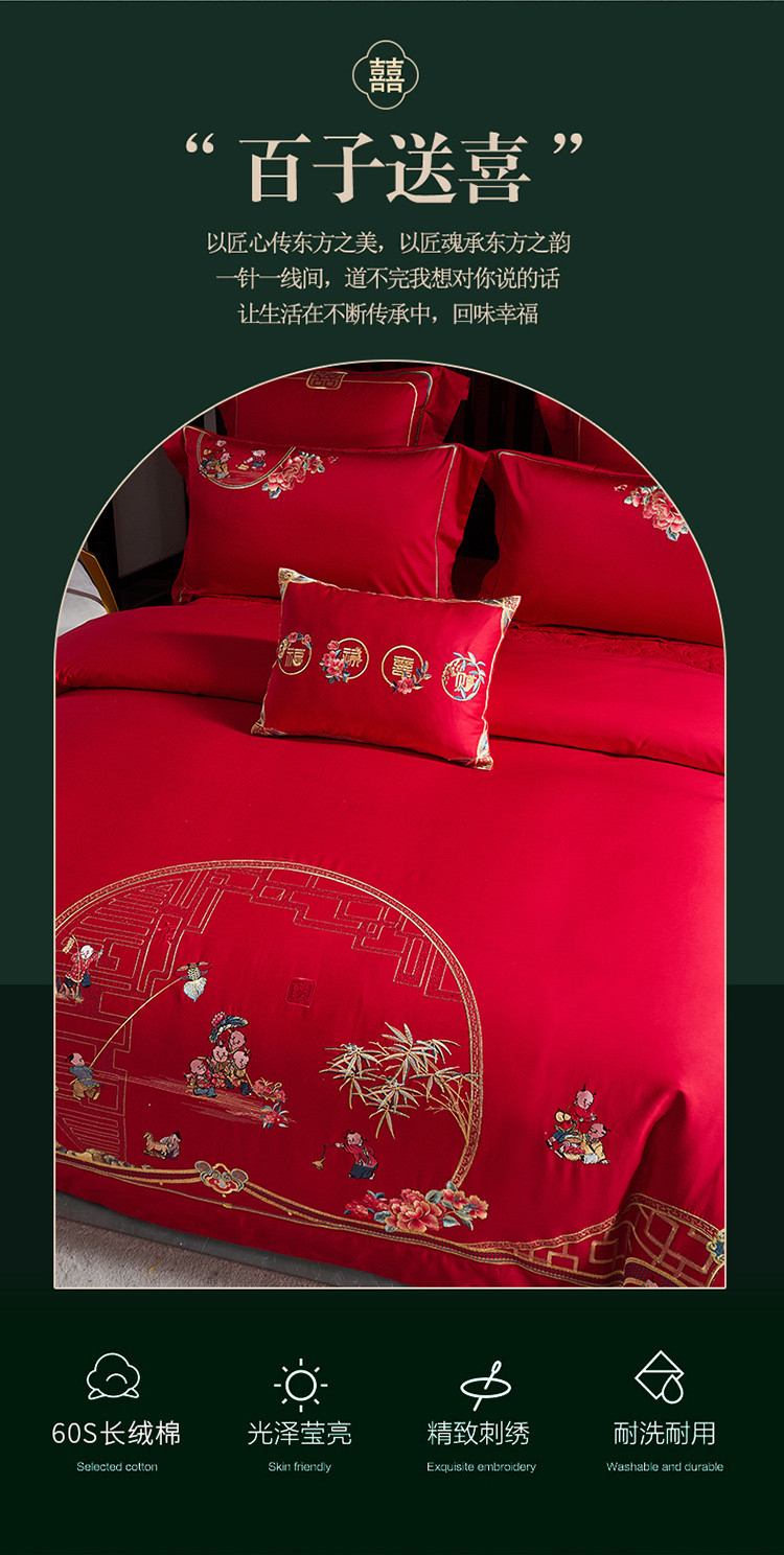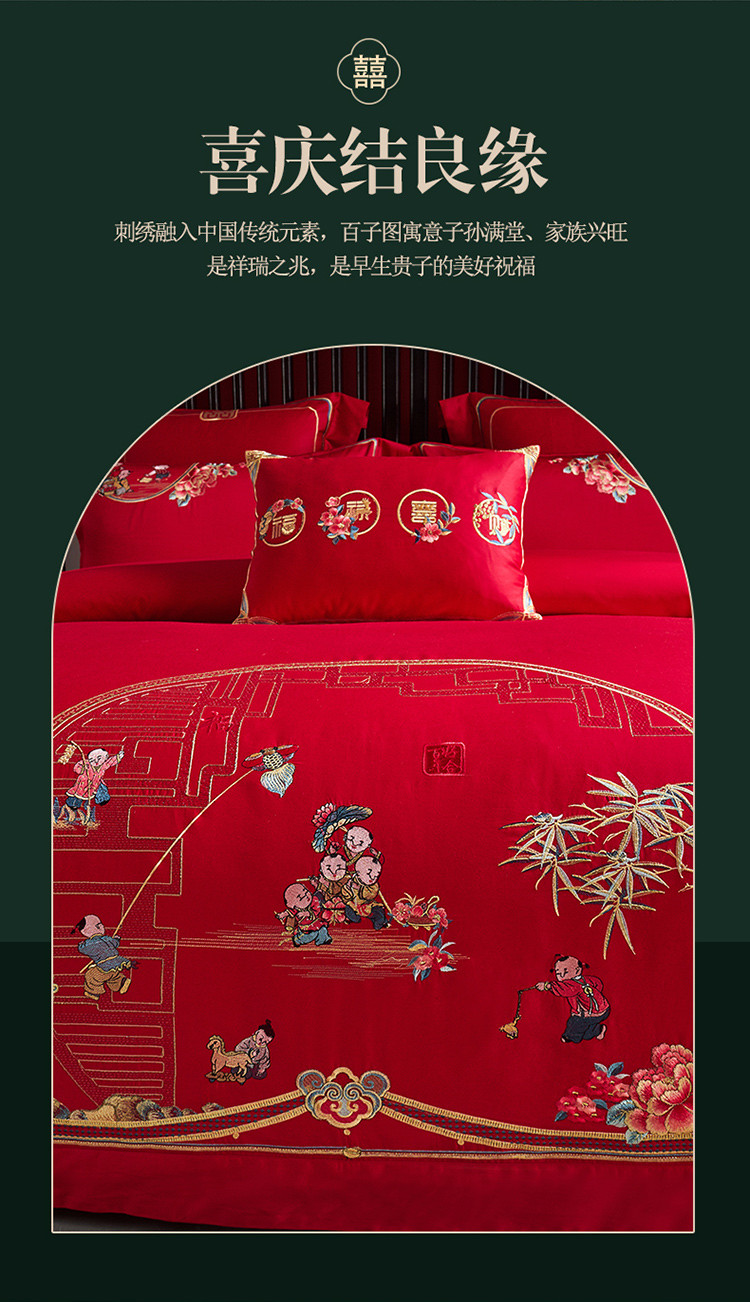 当前位置: 91家纺网 > 商品网购 > 床品套件 > 四件套 > 全棉普通四件套 > 高大尚 2022新款60s长绒棉时尚婚庆套件-百子送喜