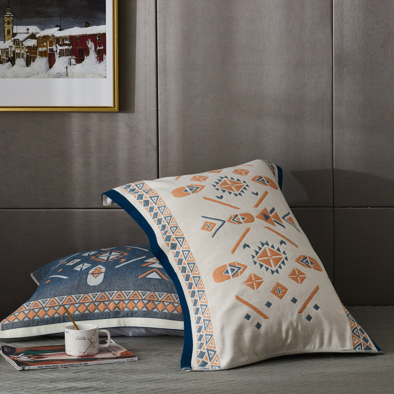 • 91家纺网 家纺一手货源 找家纺 朴尔  2022年新款波西米亚风全棉四层纱布枕巾一对装 莫斯蓝