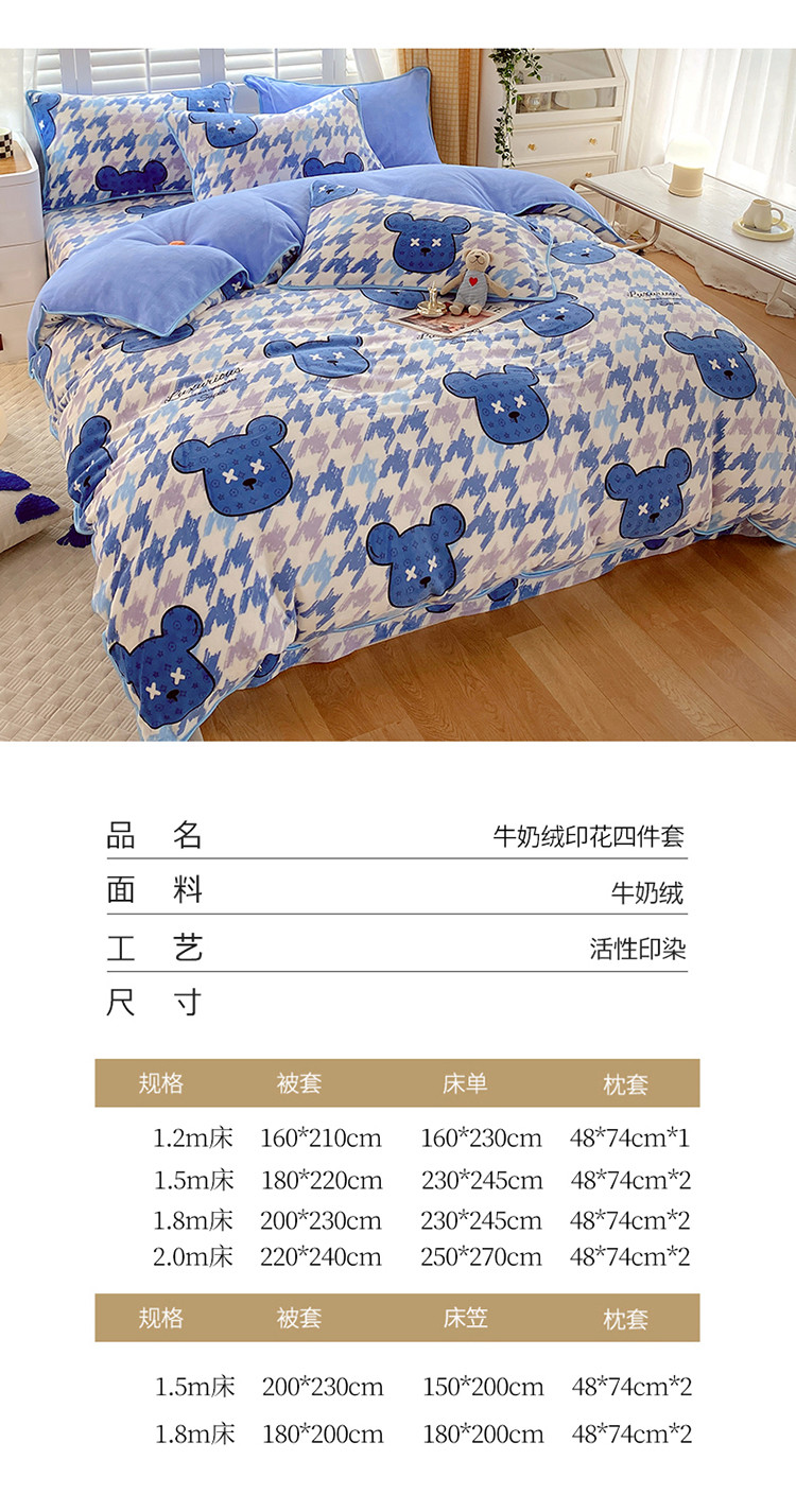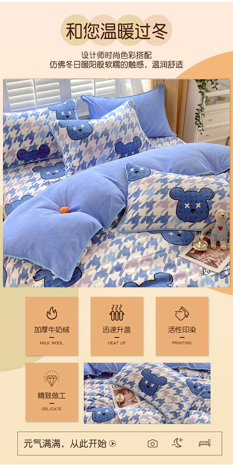 商品名称:金鑫汇 2022新款牛奶绒四件套系列-单枕套 幸运熊-兰