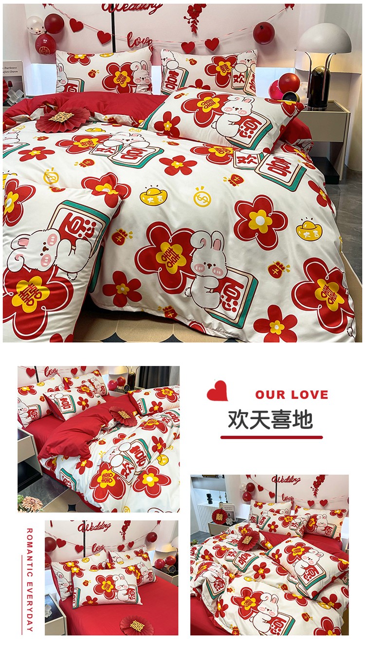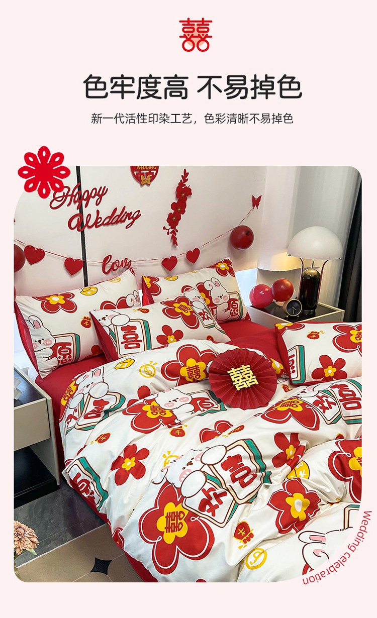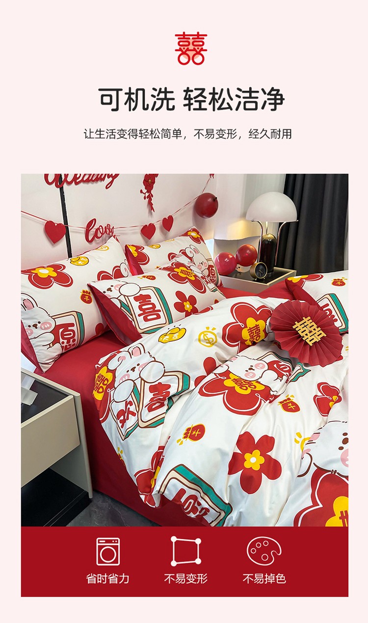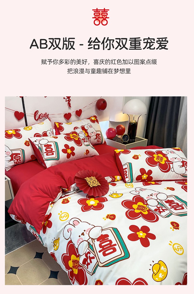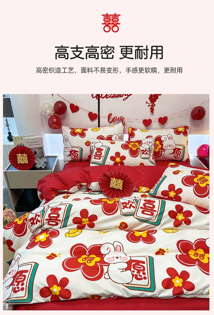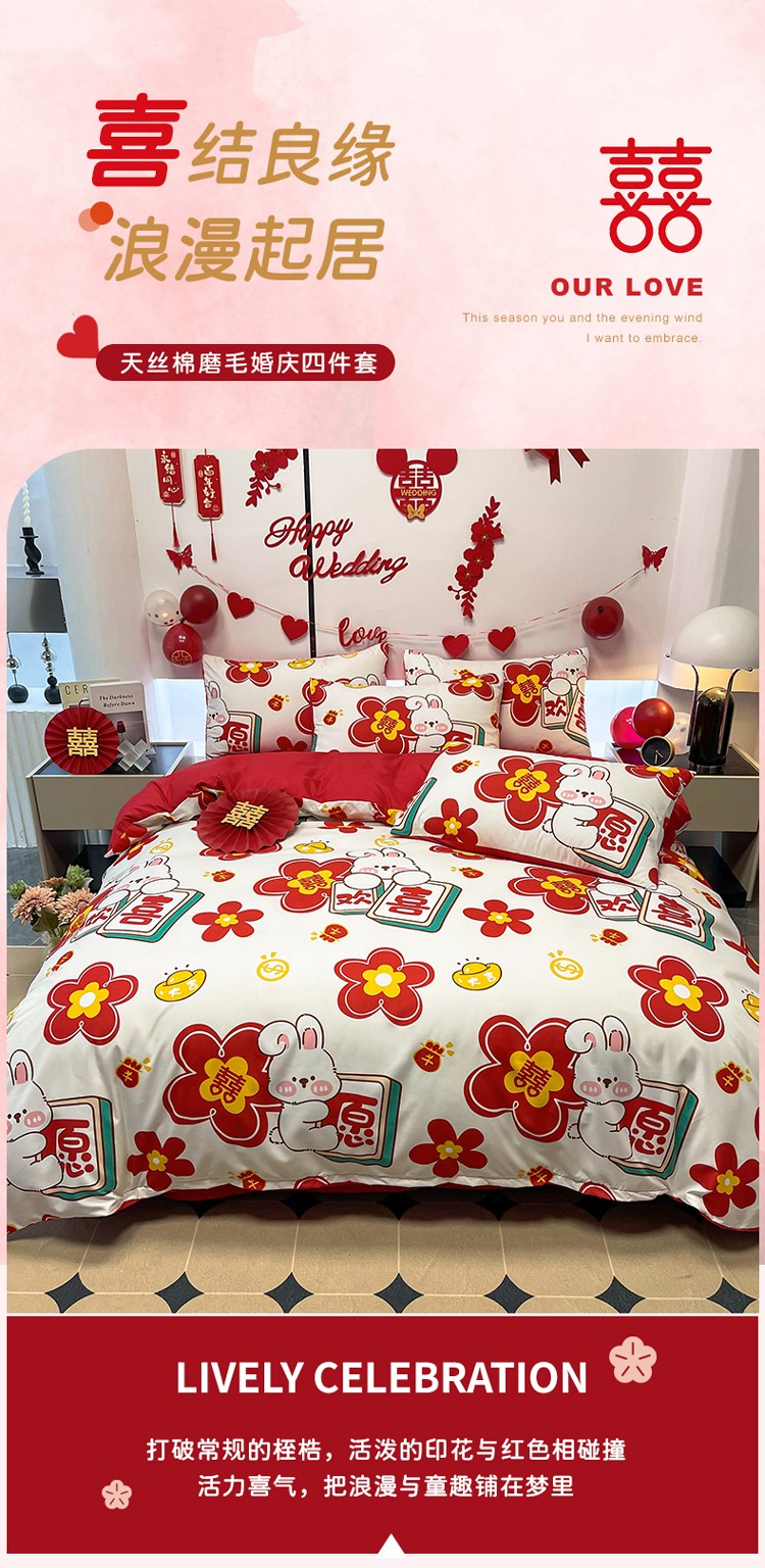宏源 2022年新款大红时尚磨毛婚庆四件套 欢天喜地