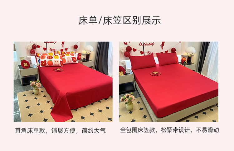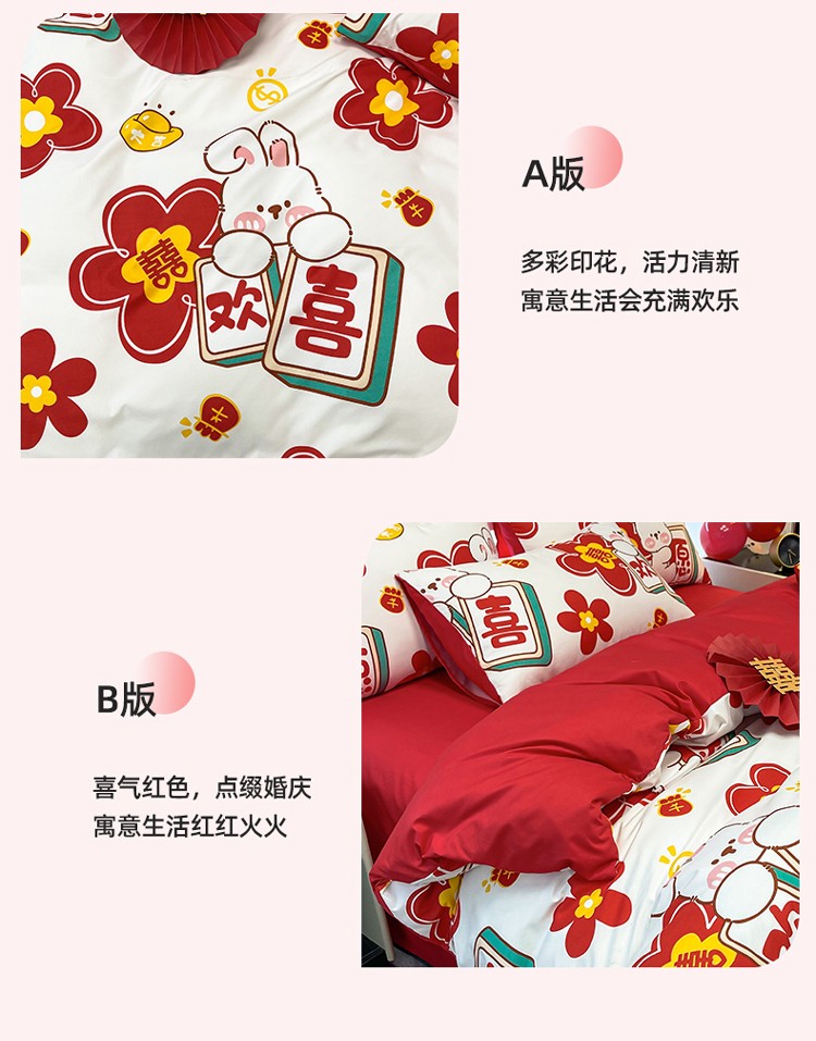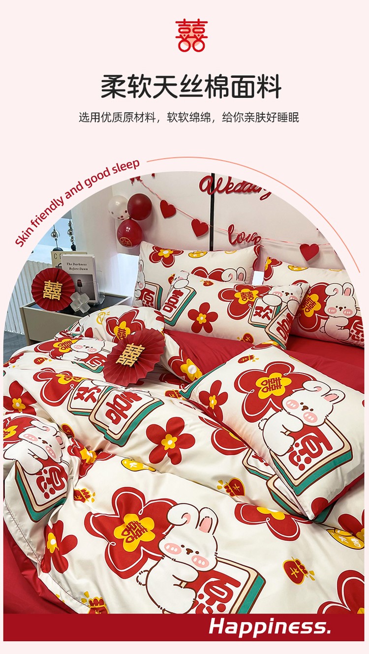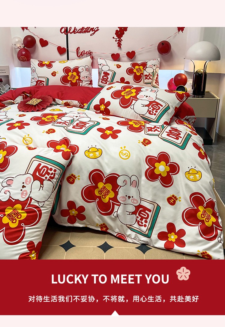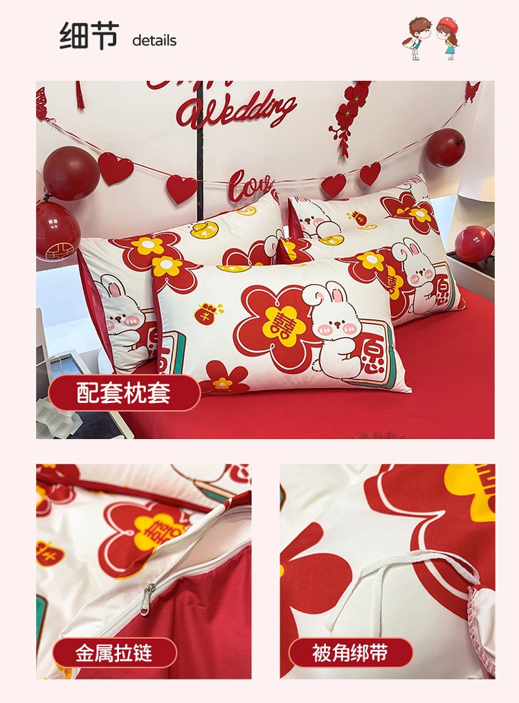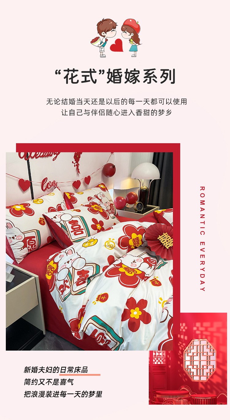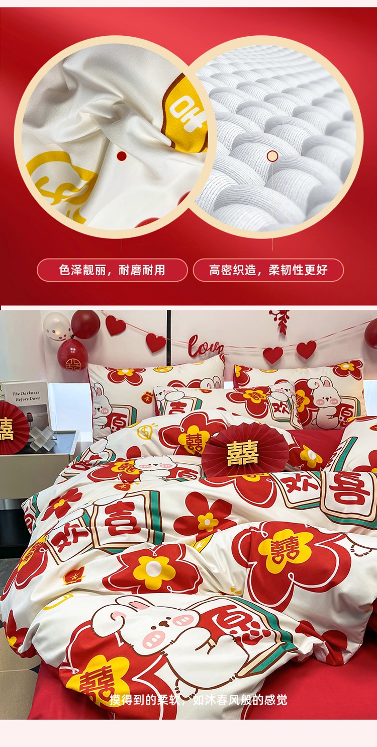 宏源 2022年新款大红时尚磨毛婚庆四件套 欢天喜地