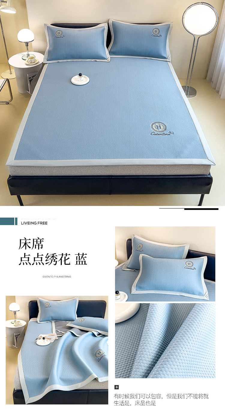 凉感丝床席点点刺绣三件套 床席 点点绣花 蓝