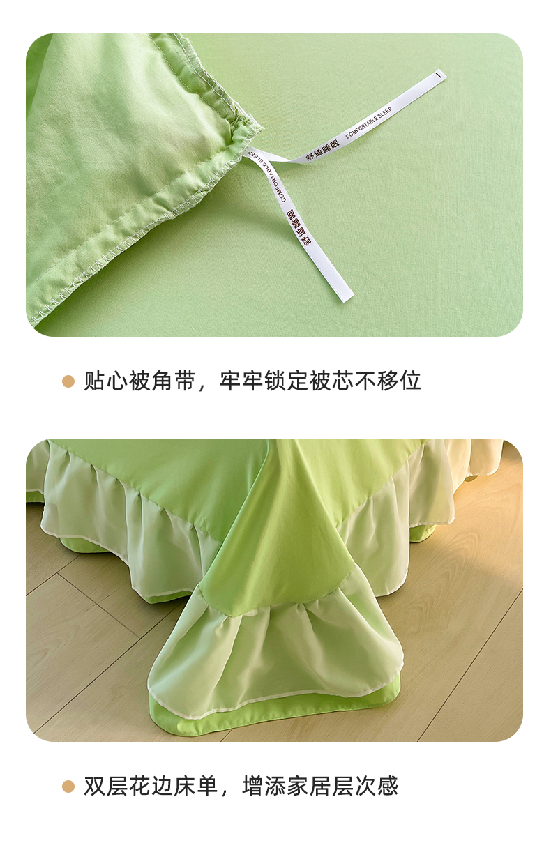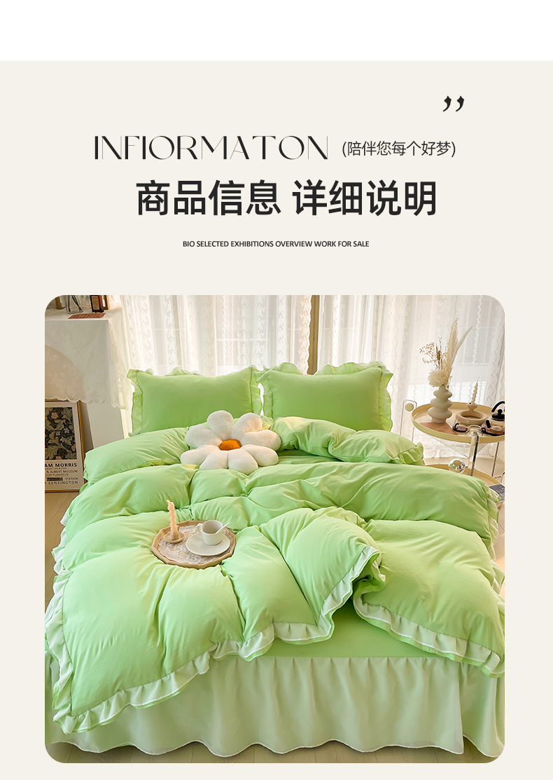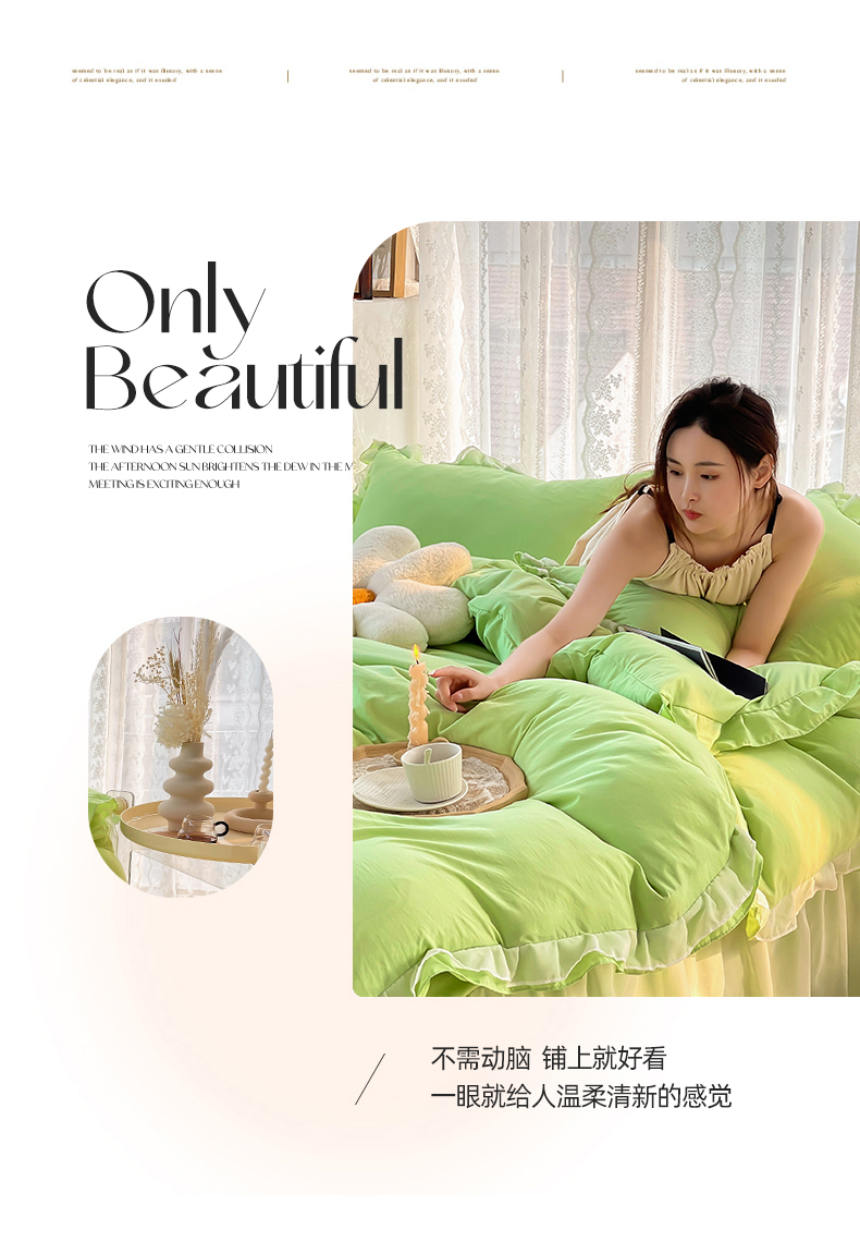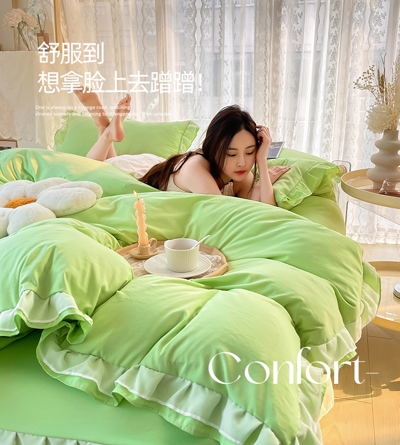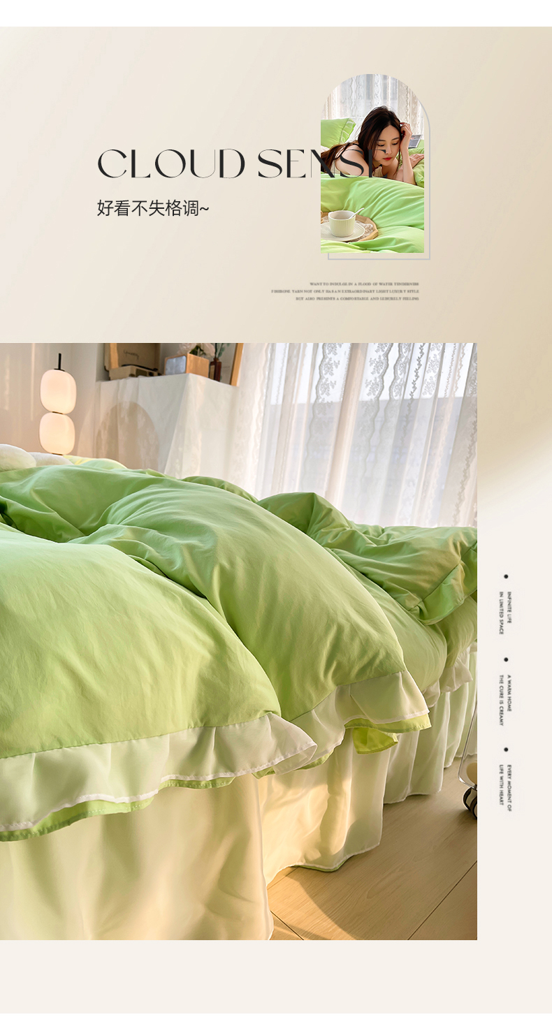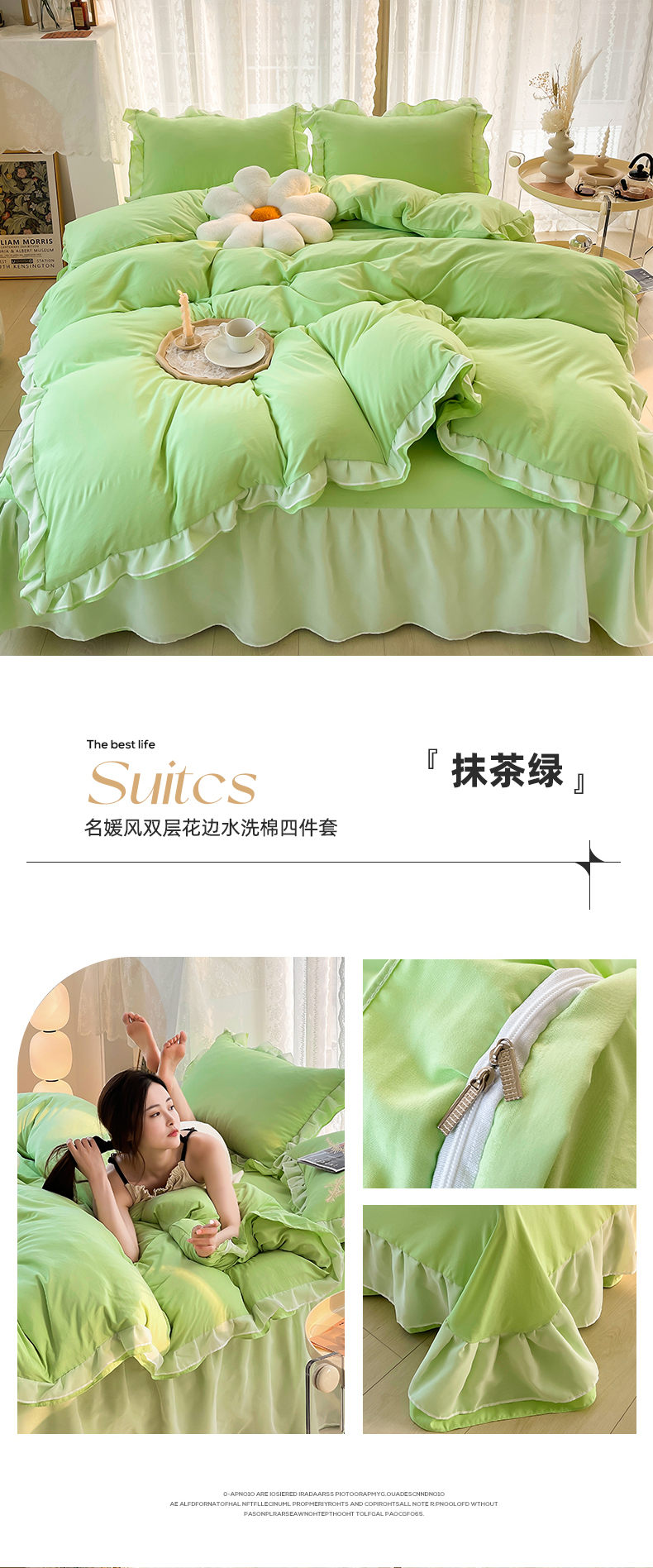 当前位置: 91家纺网 > 商品网购 > 床品套件 > 四件套 > 水洗棉四件套 > 简爱 2025新款水洗棉雪纺双层花边四件套 抹茶绿
