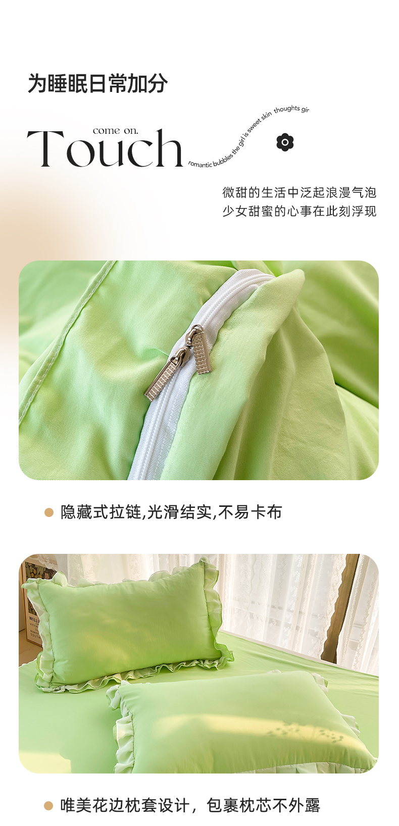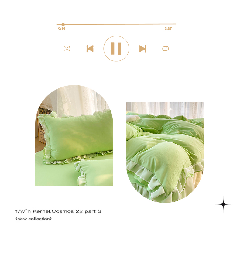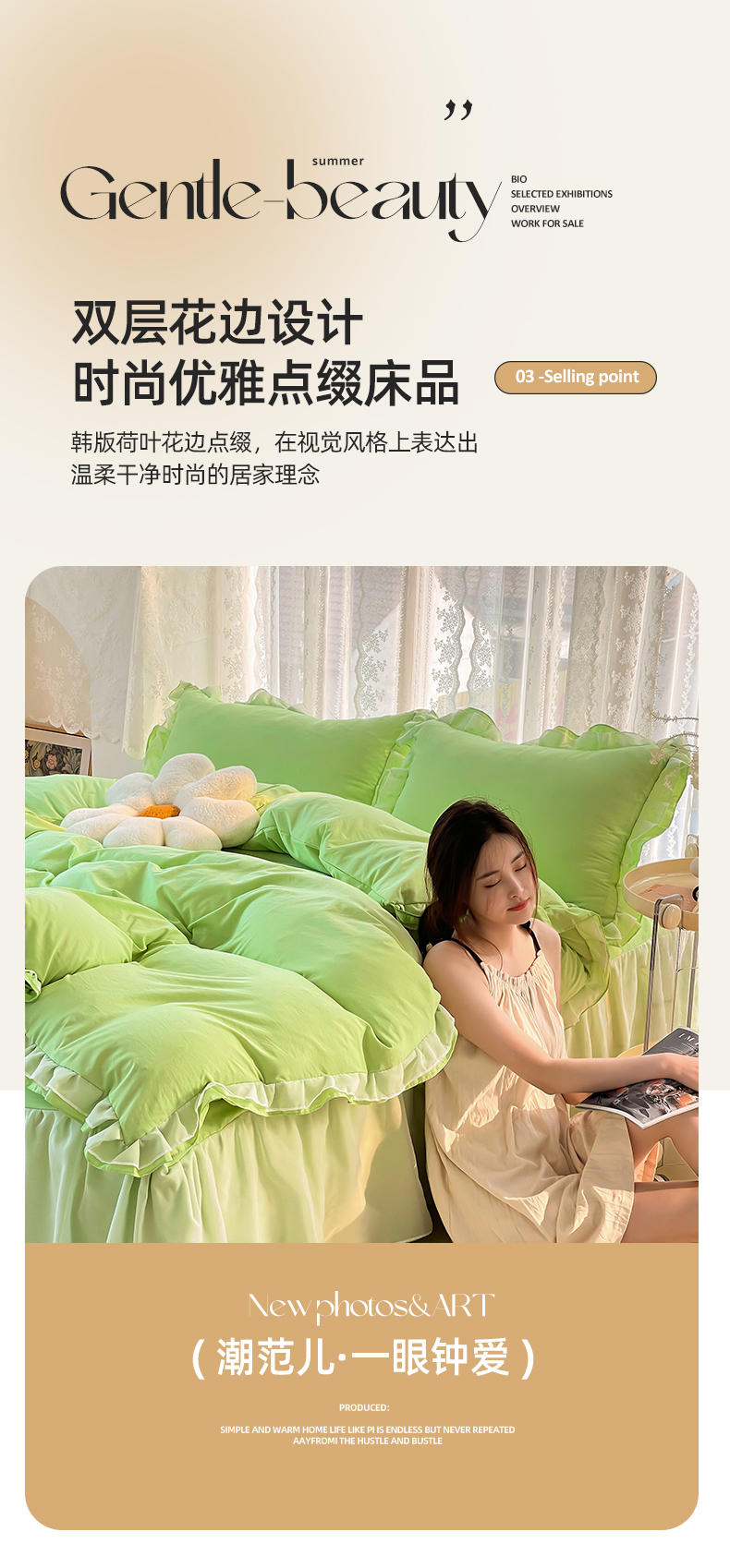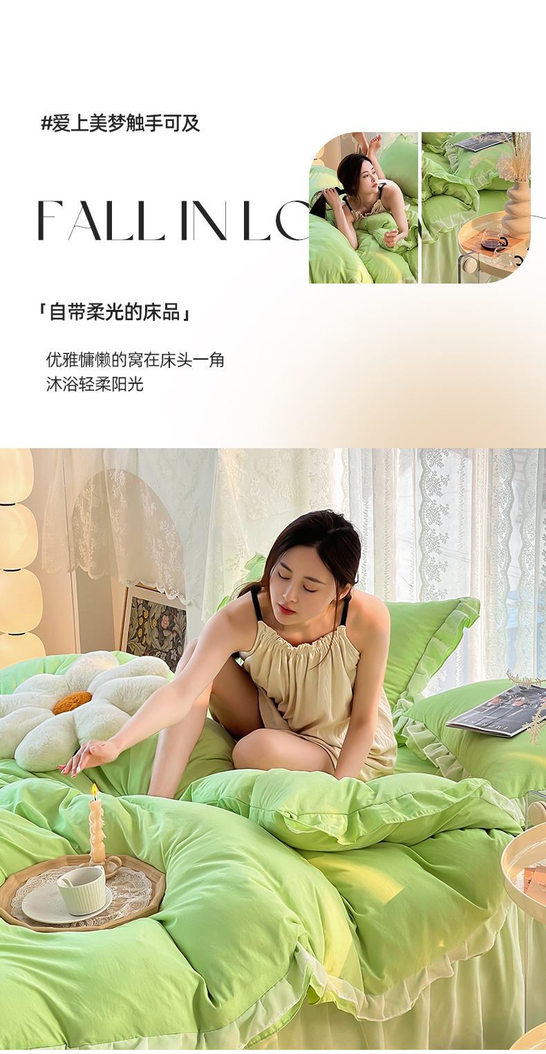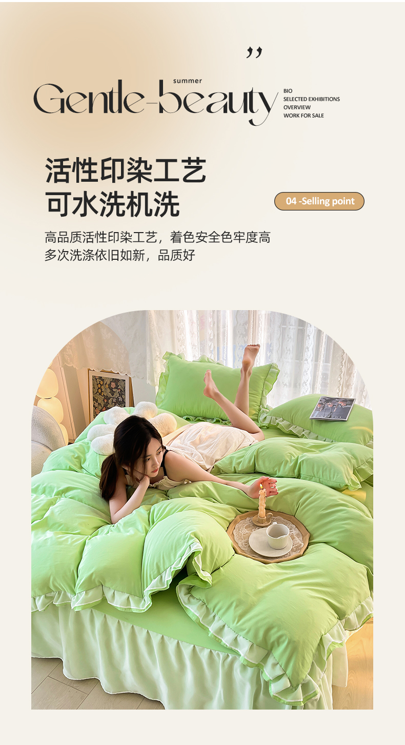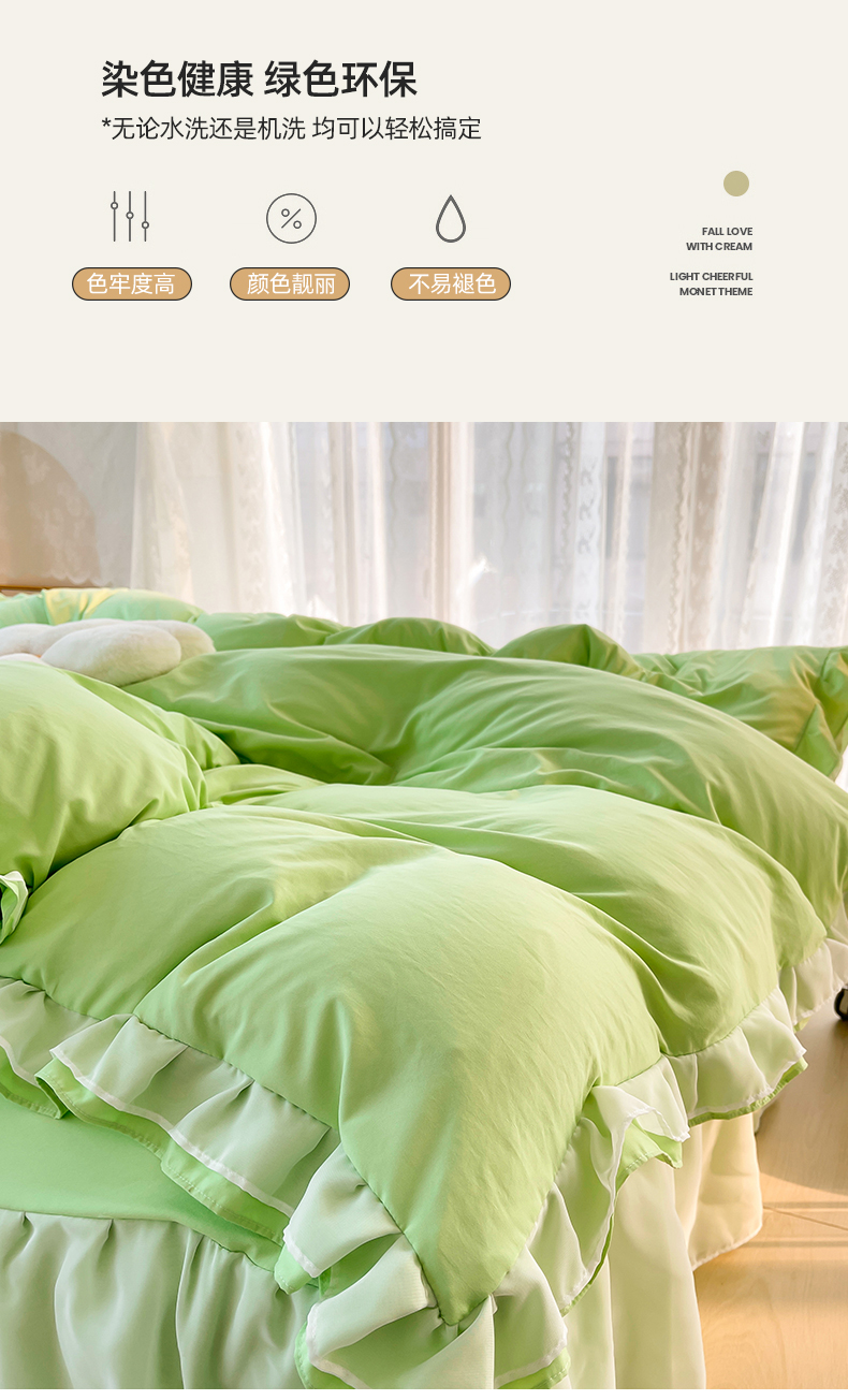 当前位置: 91家纺网 > 商品网购 > 床品套件 > 四件套 > 水洗棉四件套 > 简爱 2025新款水洗棉雪纺双层花边四件套 抹茶绿