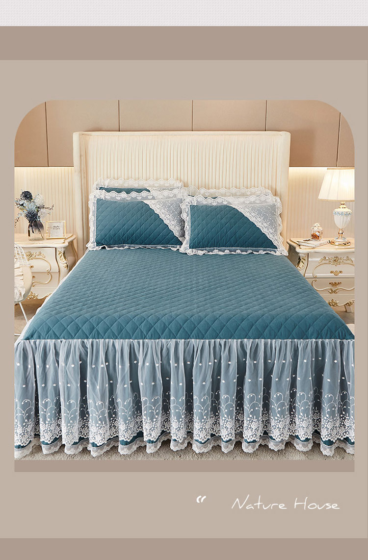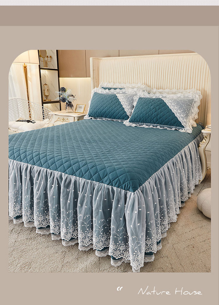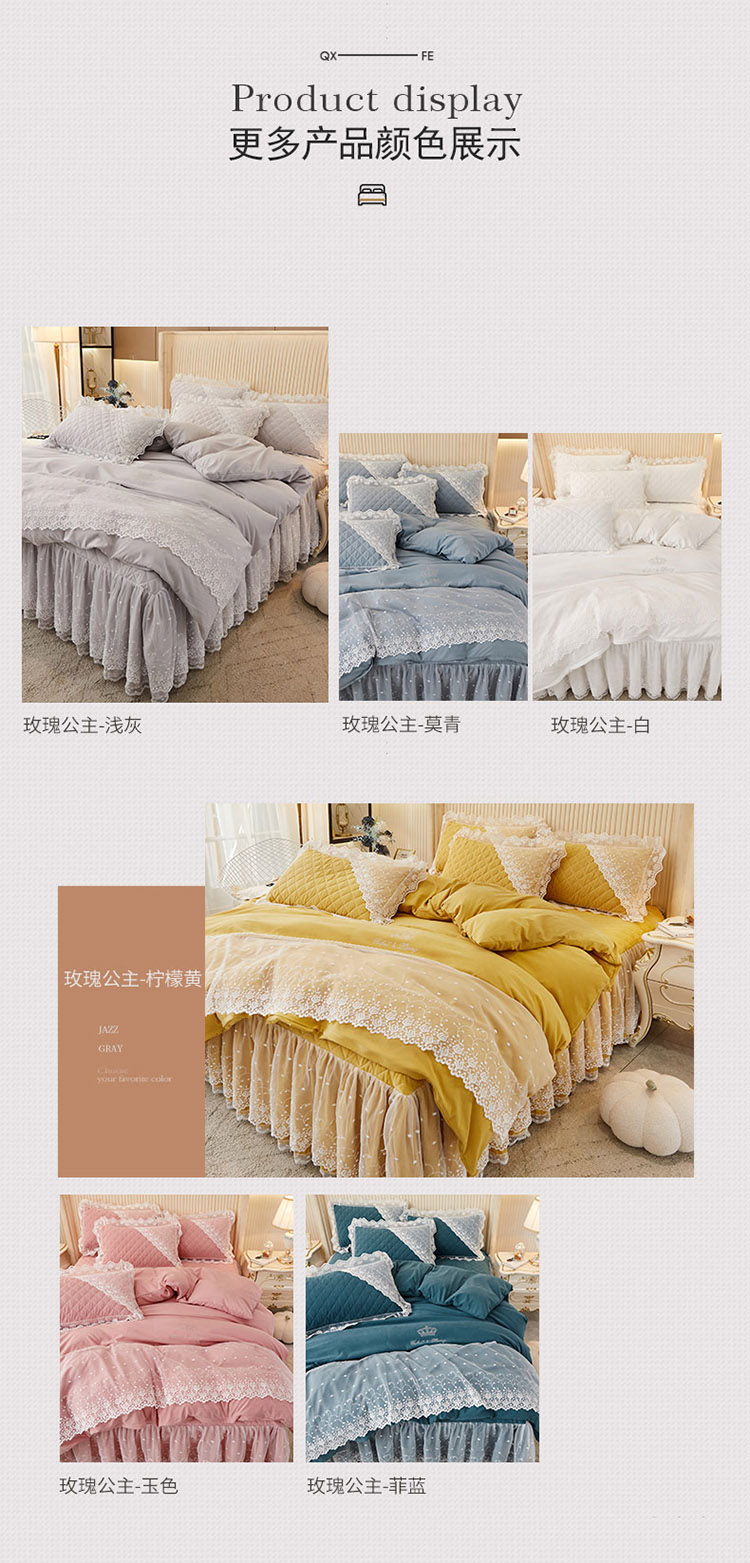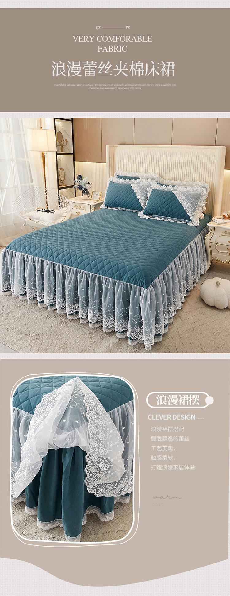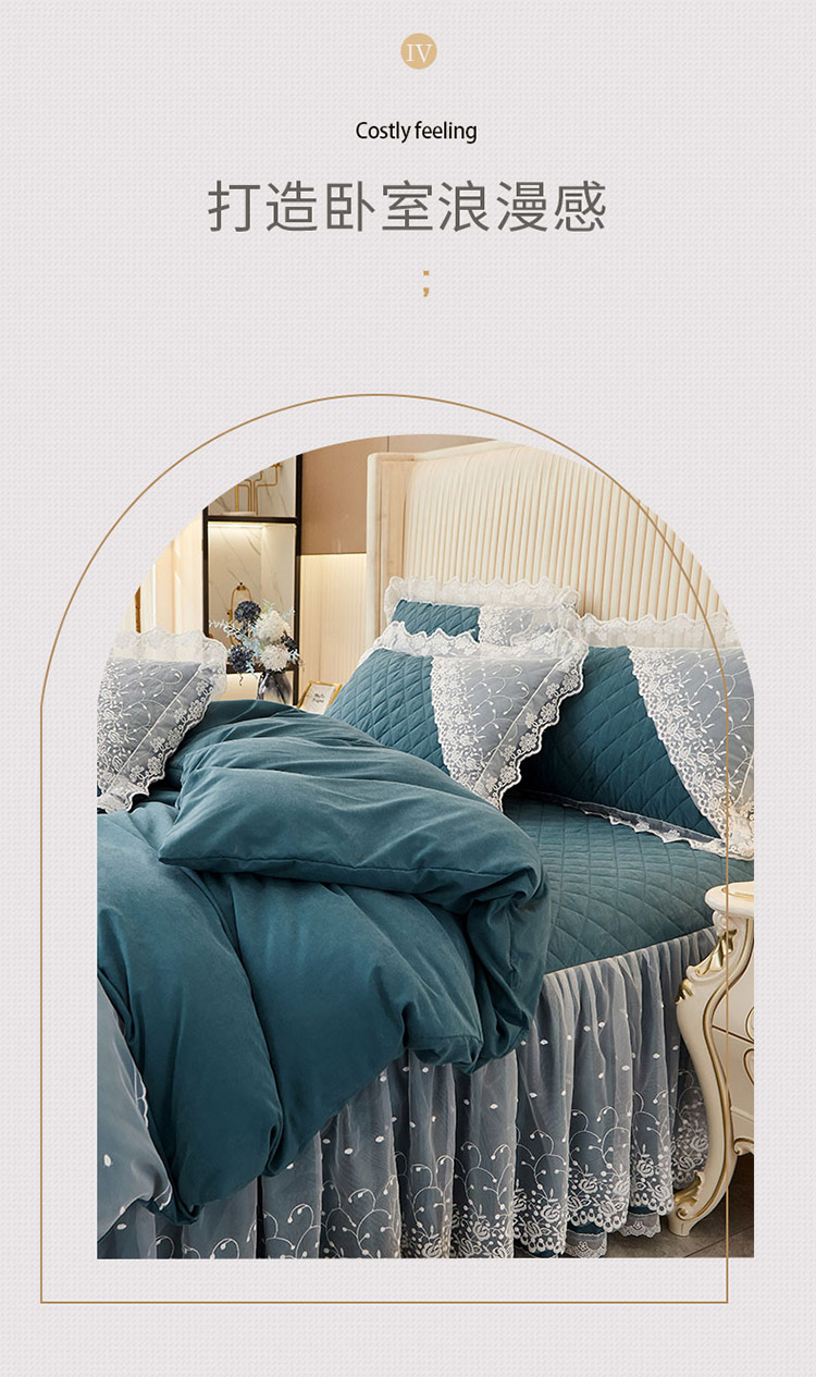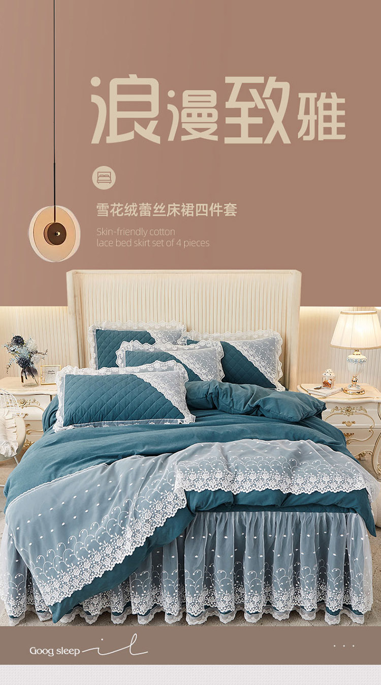 当前位置: 91家纺网 > 商品网购 > 床品套件 > 四件套 > 磨绒四件套 > 恋尚 2023新款纯色雪花绒夹棉蕾丝床裙四件套(四季款) 玫瑰公主-菲蓝