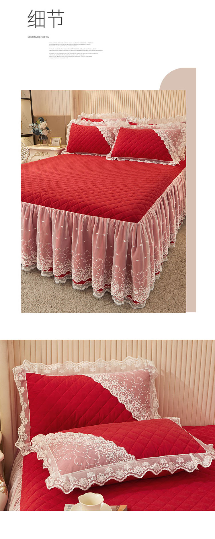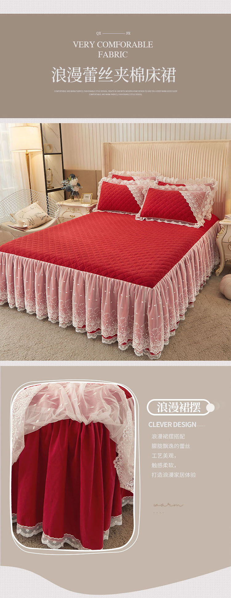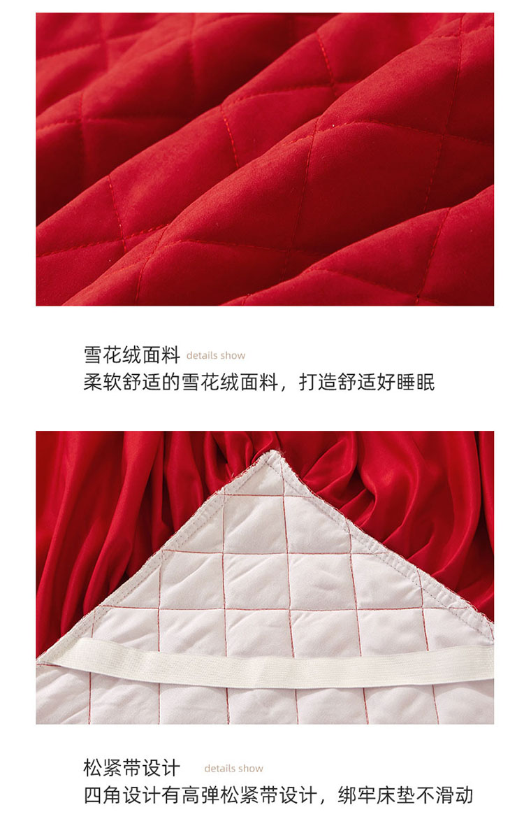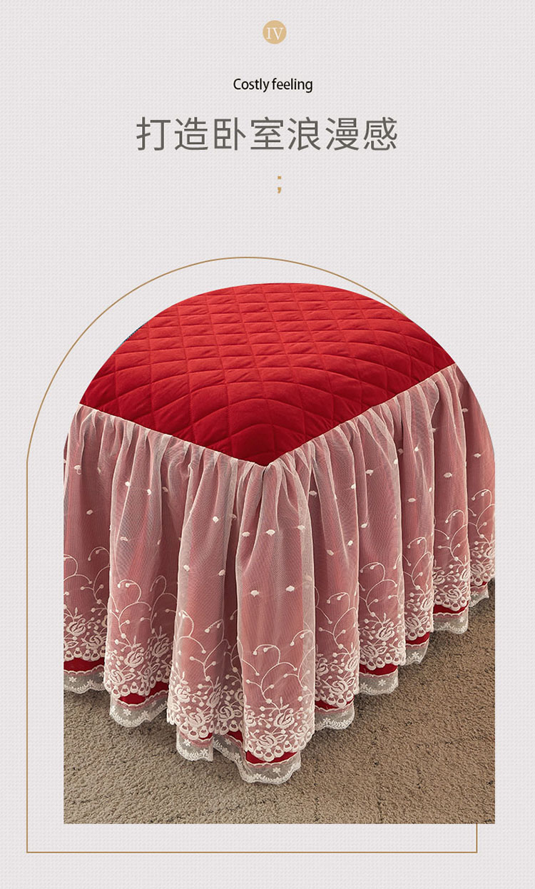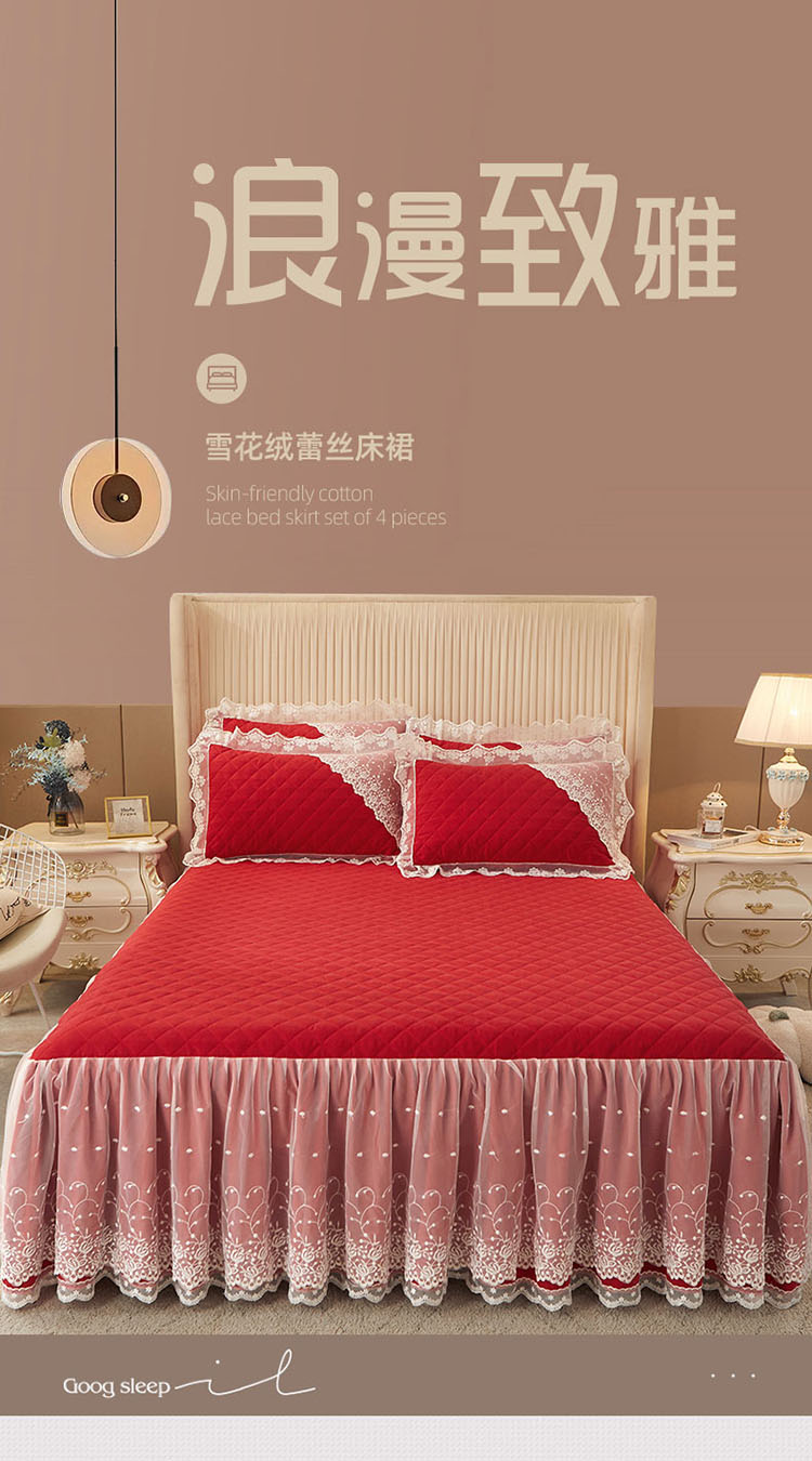 • 91家纺网 家纺一手货源 找家纺 恋尚 2023新款纯色雪花绒夹棉蕾丝床裙三件套(四季款) 玫瑰公主-玛雅红