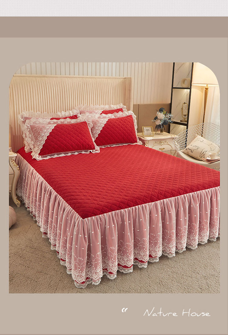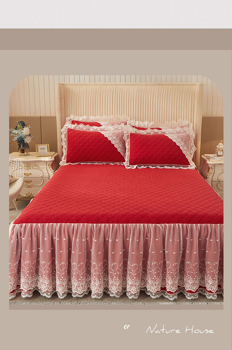 恋尚 2023新款纯色雪花绒夹棉蕾丝床裙三件套(四季款) 玫瑰公主-玛雅红
