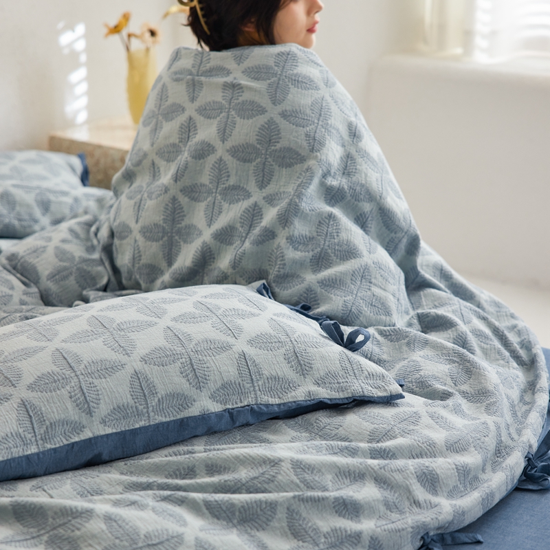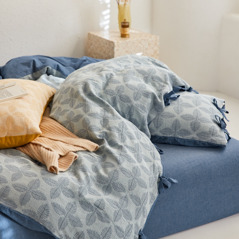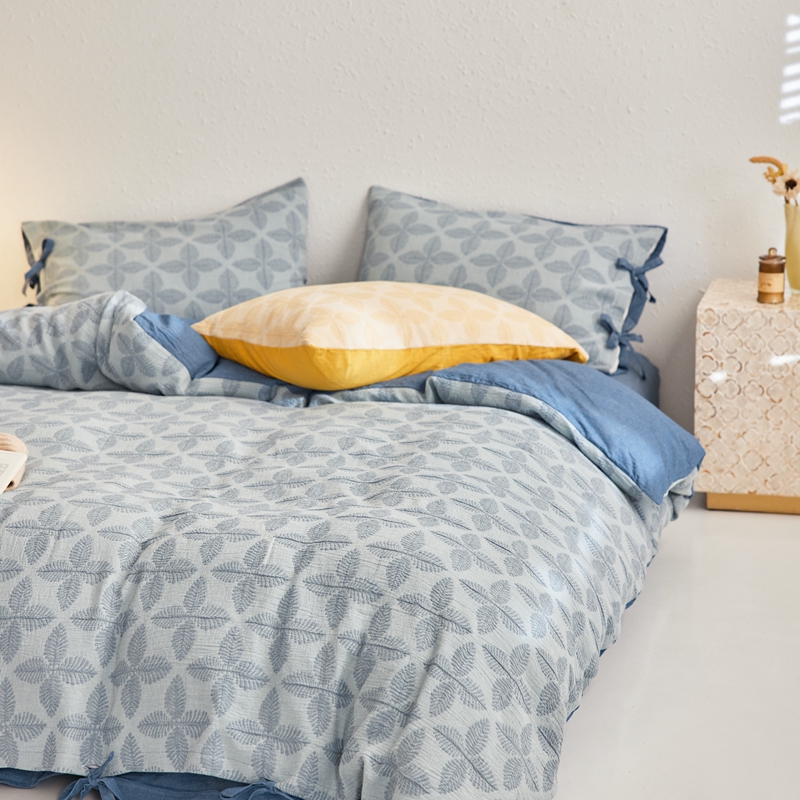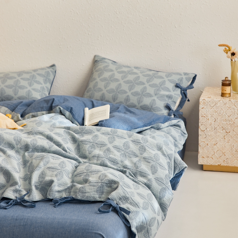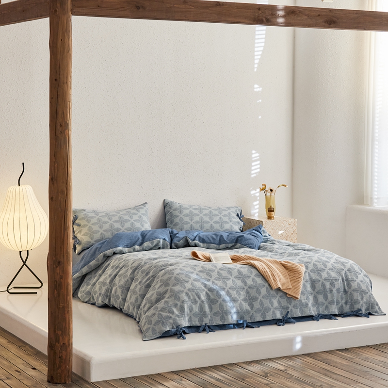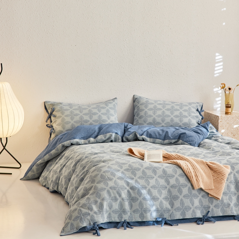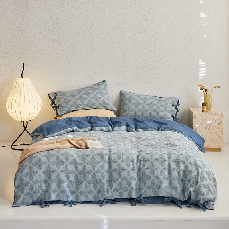 安莱生活 2023年新款高端双层纱栀子花色织大提花蝴蝶结工艺款四件套 幸运草-深蓝
