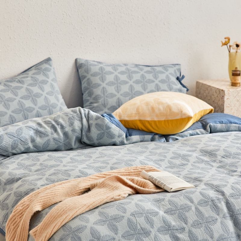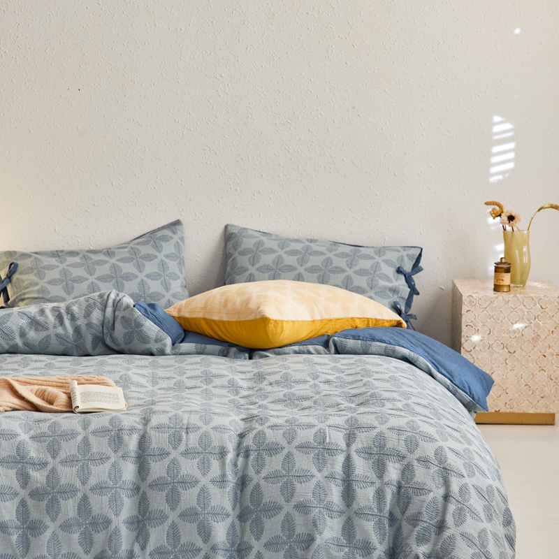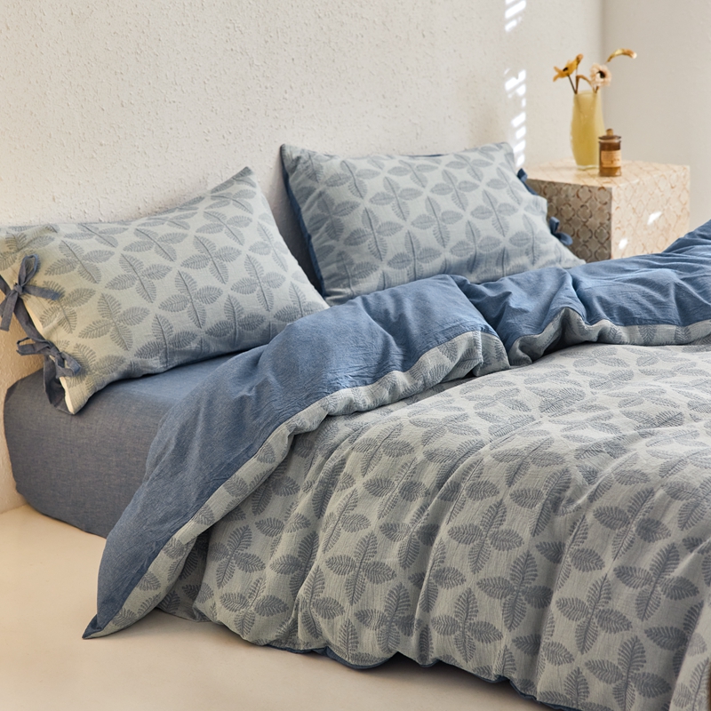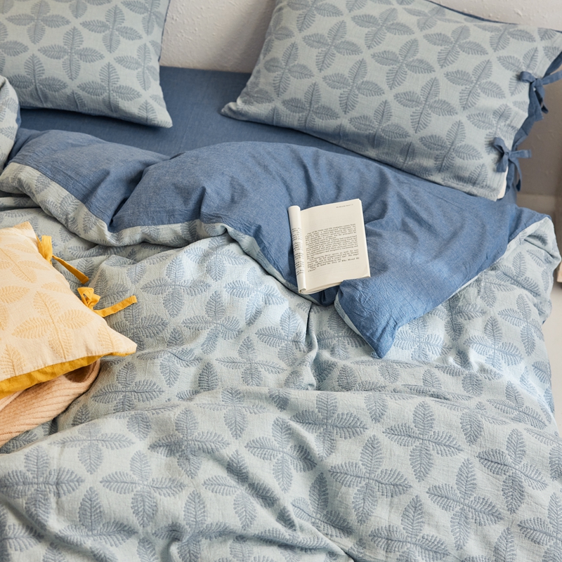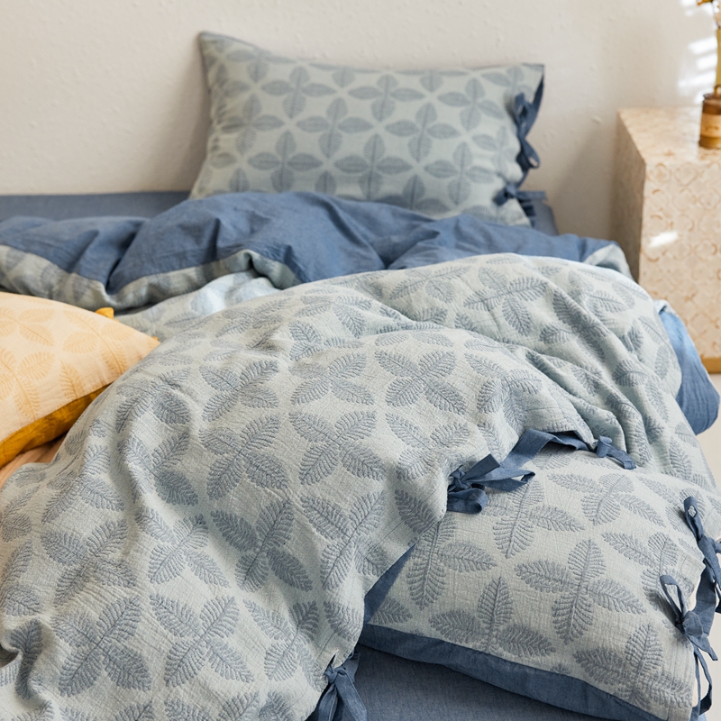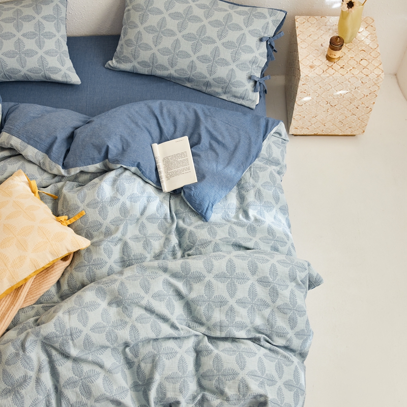 安莱生活 2023年新款高端双层纱栀子花色织大提花蝴蝶结工艺款四件套 幸运草-深蓝