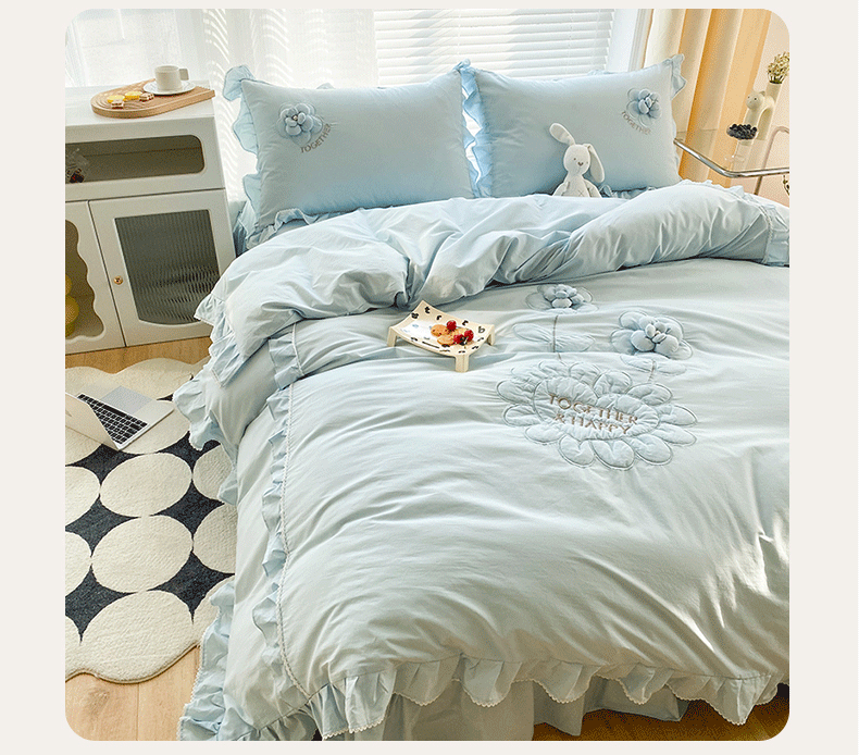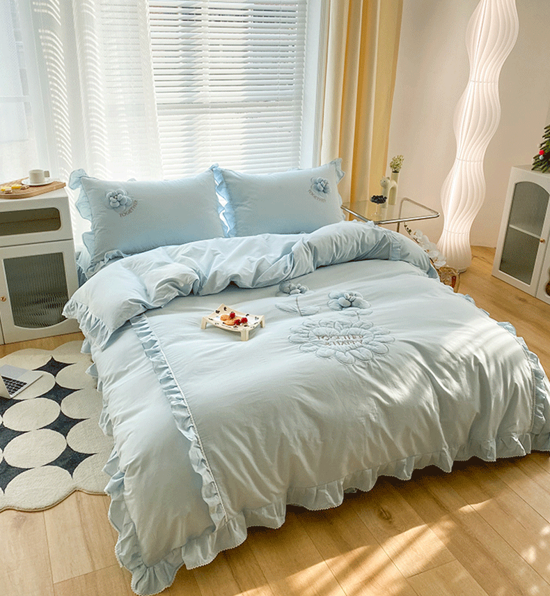 乐嘉盈2025新款全棉水洗棉立体提花贴布绣四件套 晴空蓝