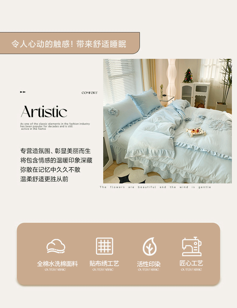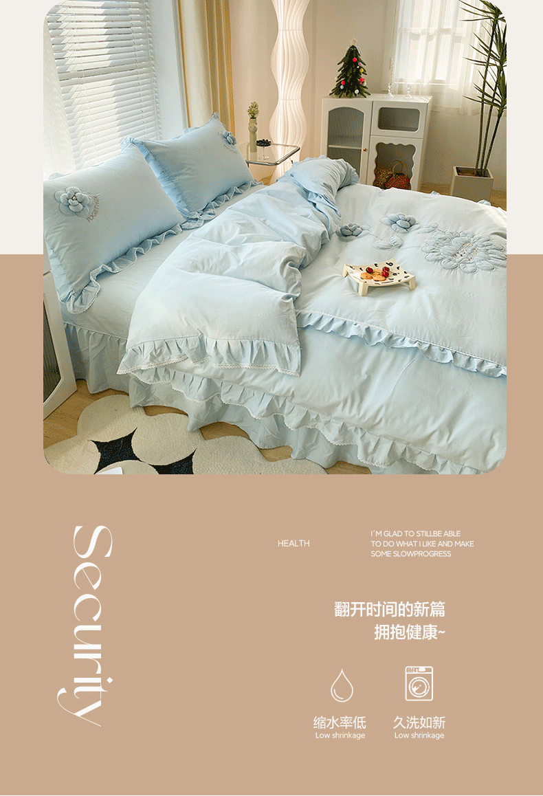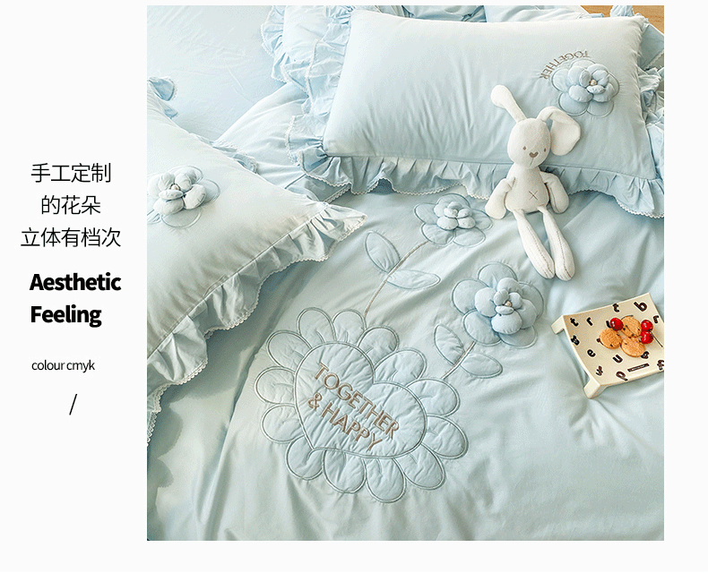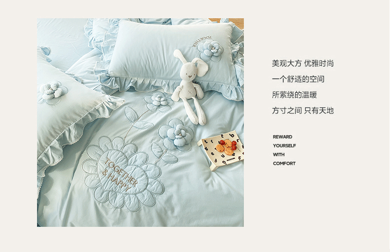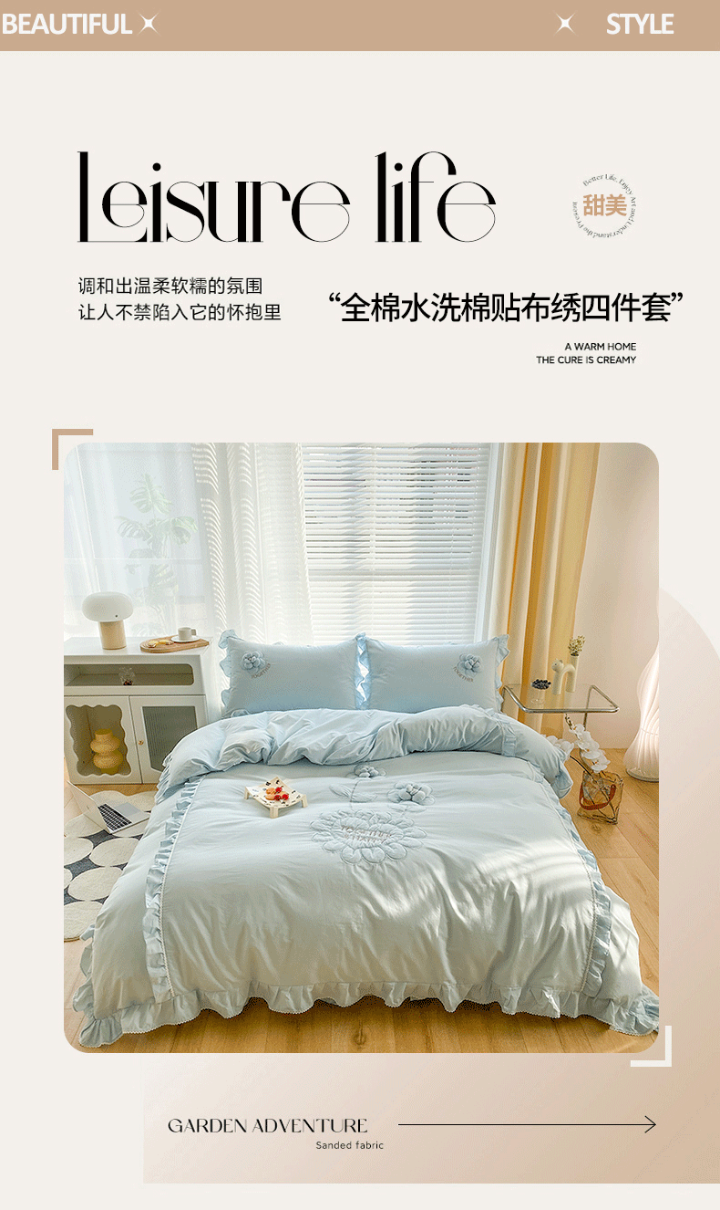 商品名称:乐嘉盈2025新款全棉水洗棉立体提花贴布绣四件套 晴空蓝