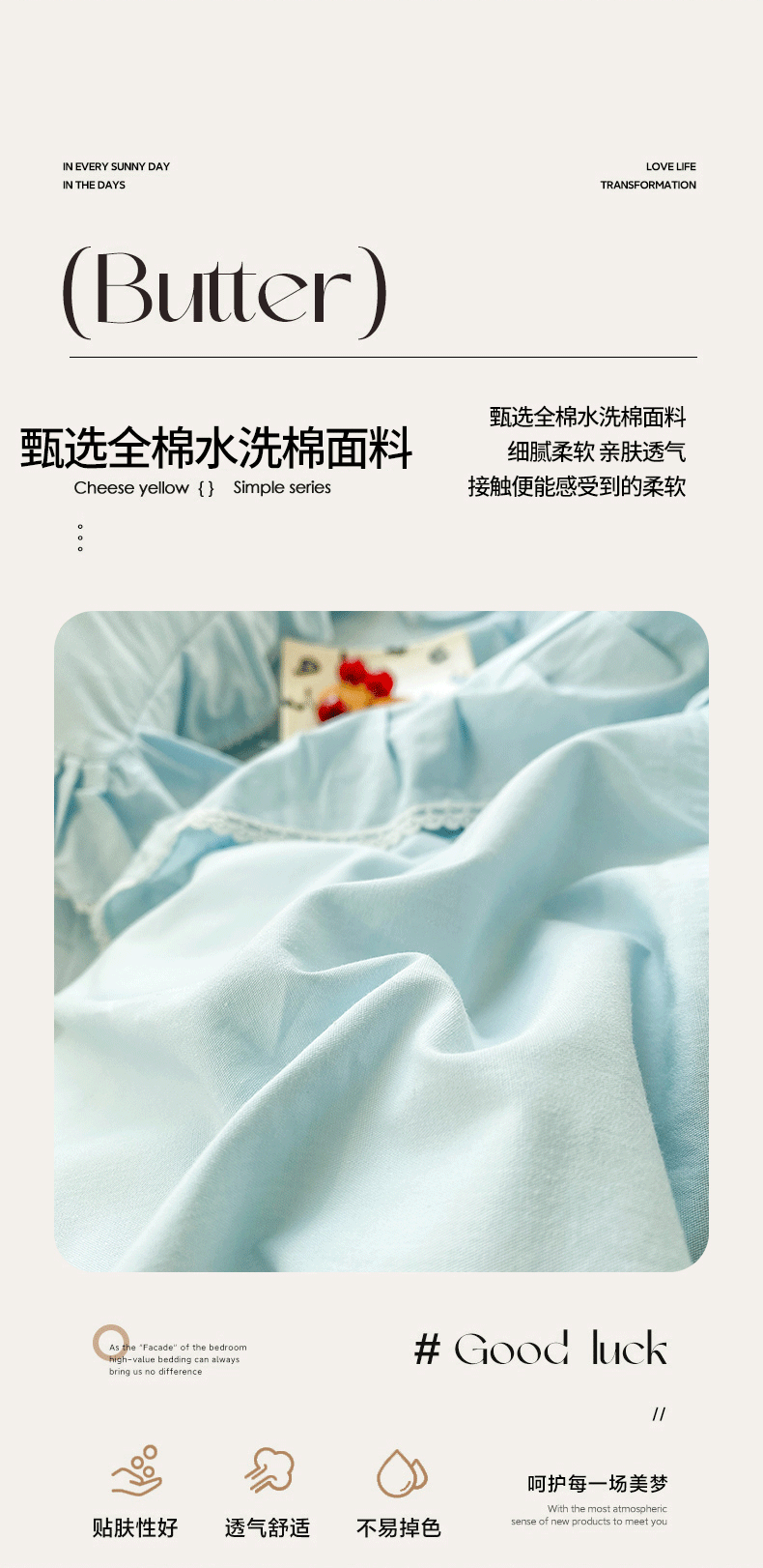 (总)乐嘉盈2025新款纯色水洗棉麻韩版花边泡泡纱床盖款四件套,粉色,紫色,绿色,蓝色