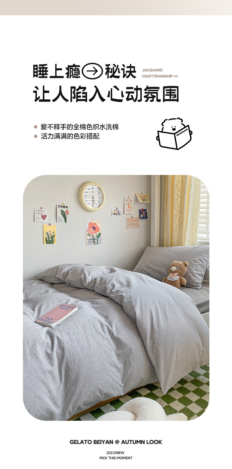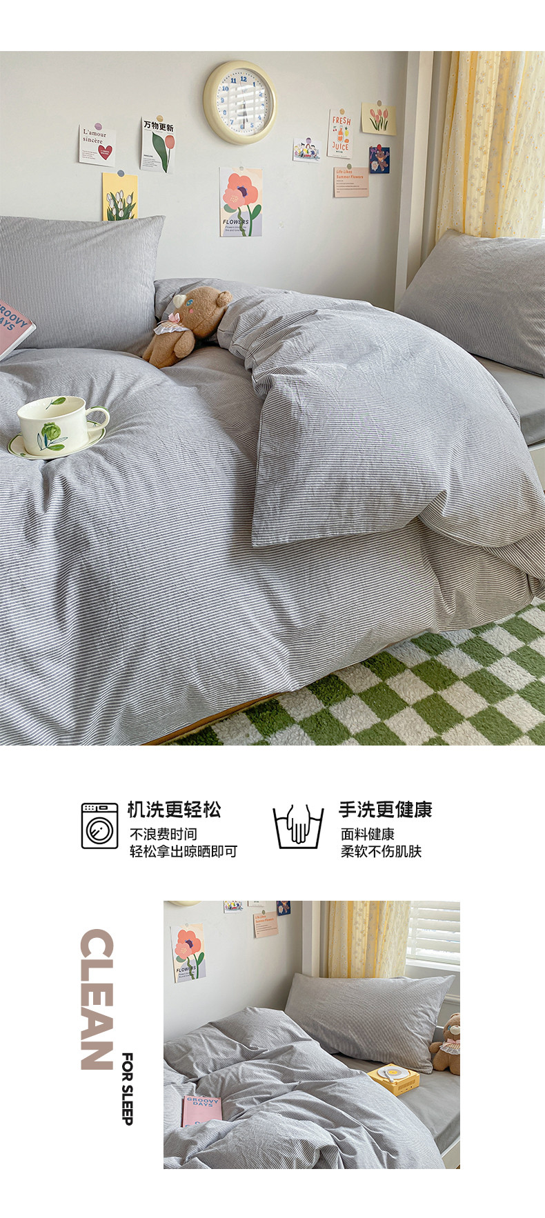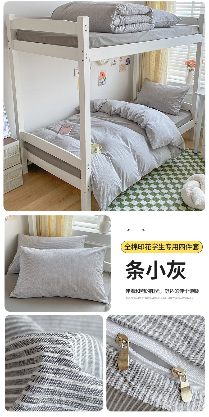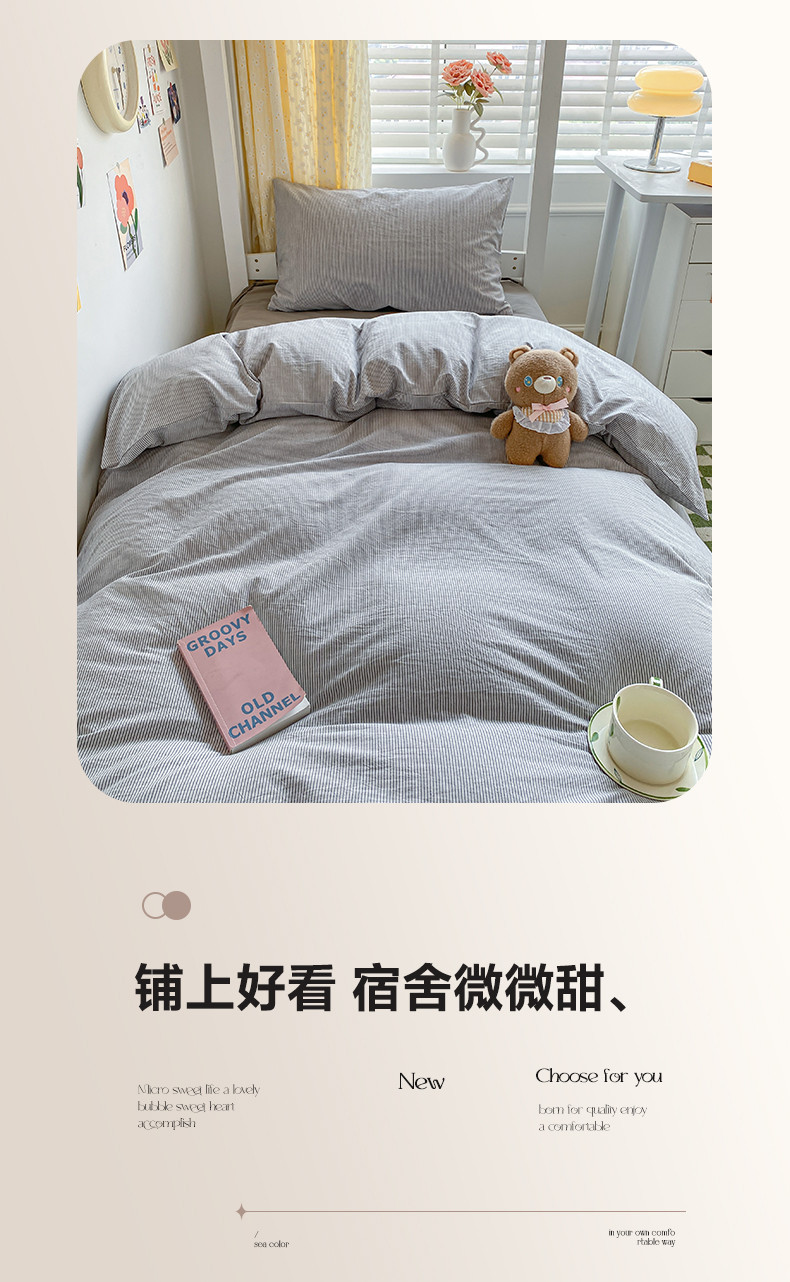 莱茵家居 2024新款色织全棉水洗棉学生床三件套 条小灰