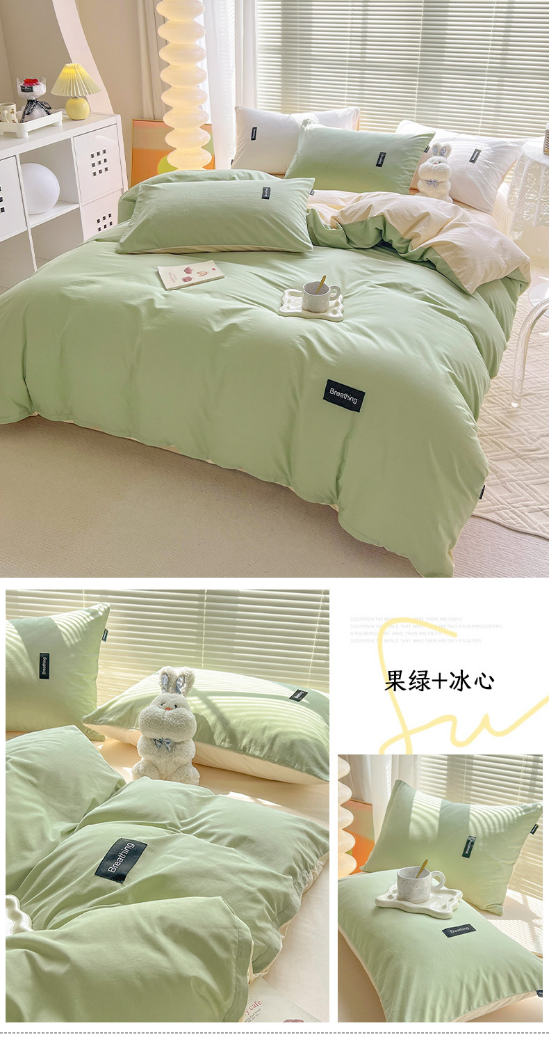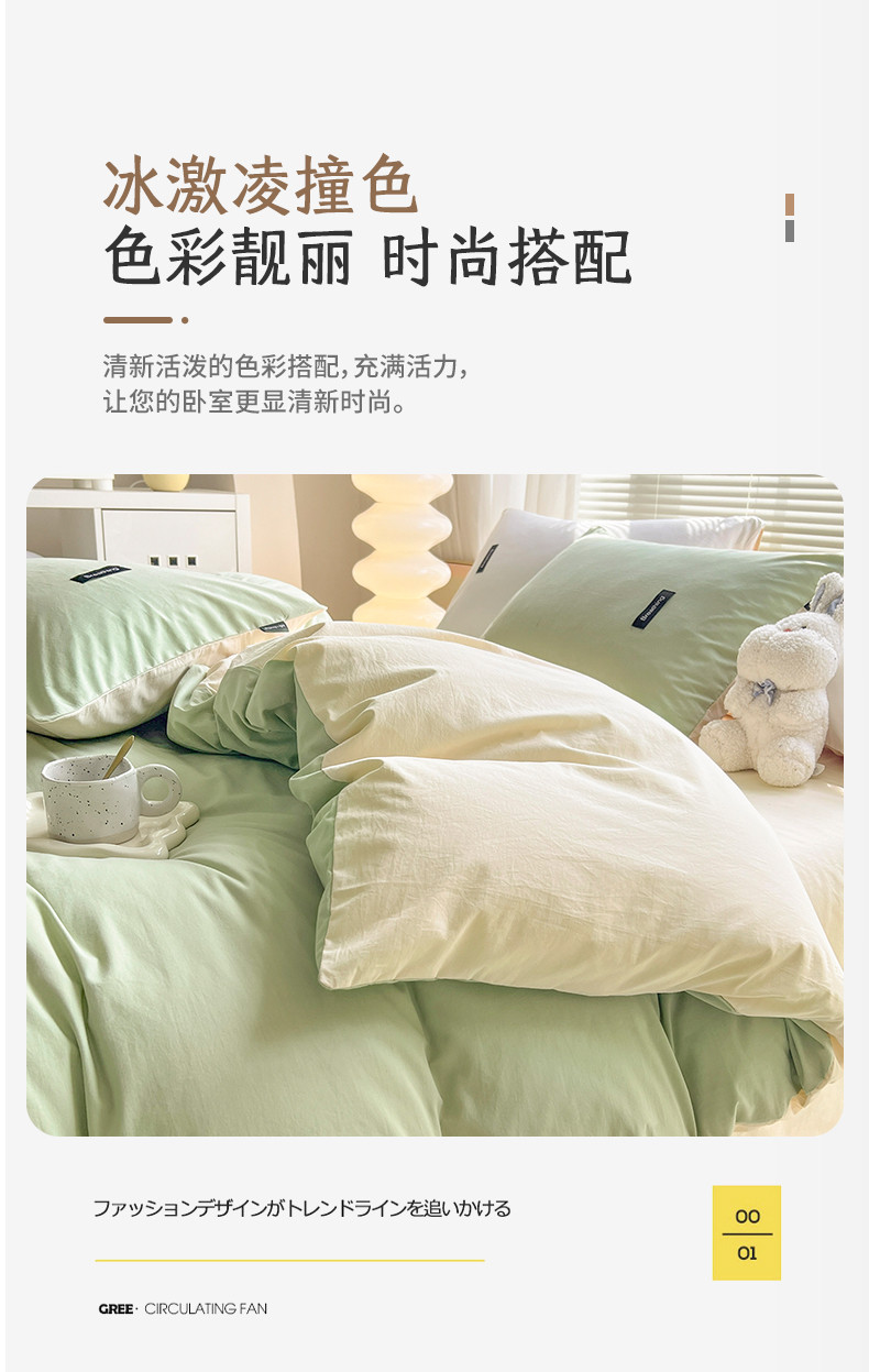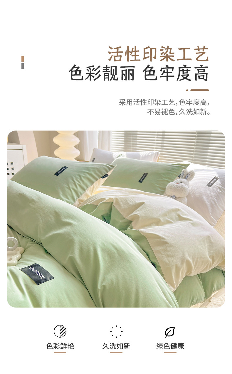 当前位置: 91家纺网 > 商品网购 > 床品套件 > 四件套 > 全棉普通四件套 > 绵庭家纺 2023新款全棉水洗棉拼色四件套 果绿+冰心