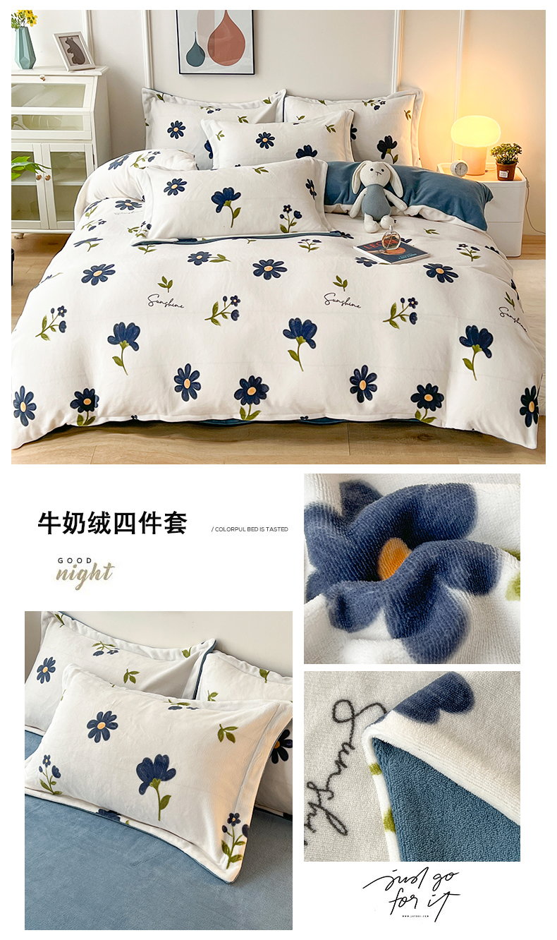 商品名称:富之航家纺 2023新款牛奶绒印花四件套 向阳花开-蓝