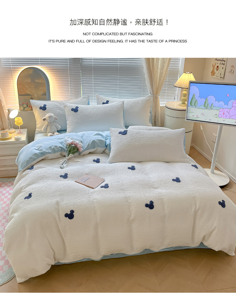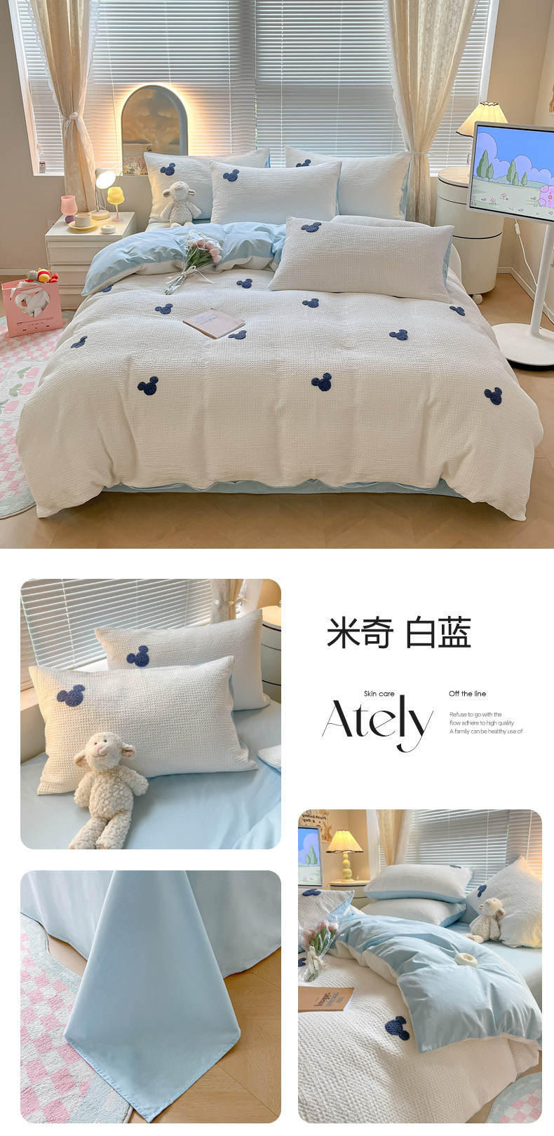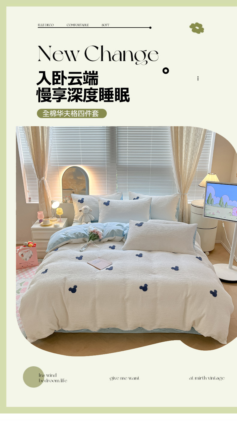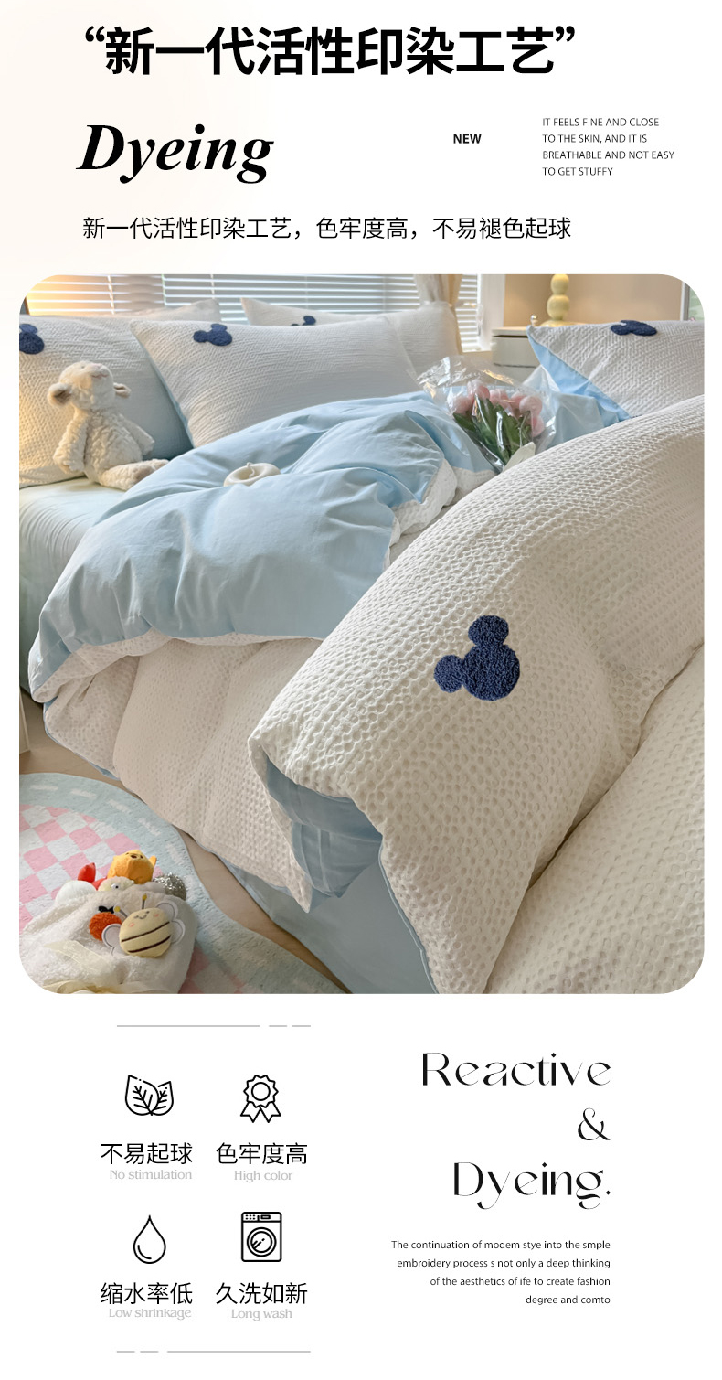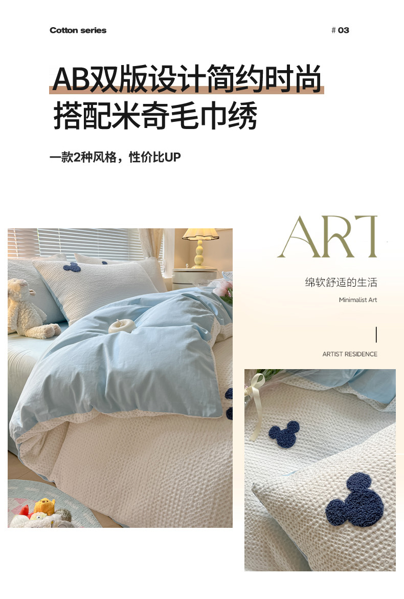 当前位置: 91家纺网 > 商品网购 > 床品套件 > 四件套 > 全棉普通四件套 > 慕尚2025华夫格全棉米奇毛巾绣四件套 米奇 白蓝