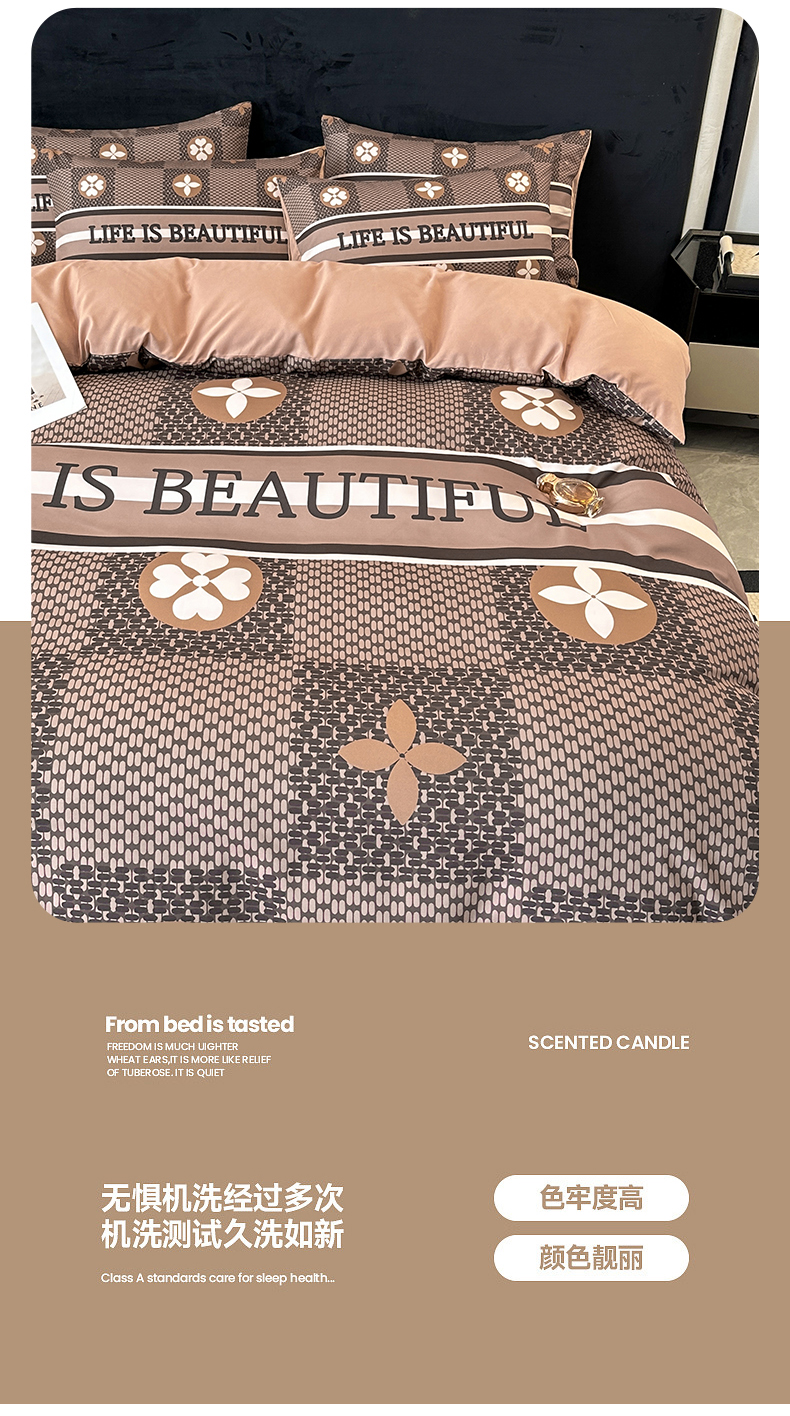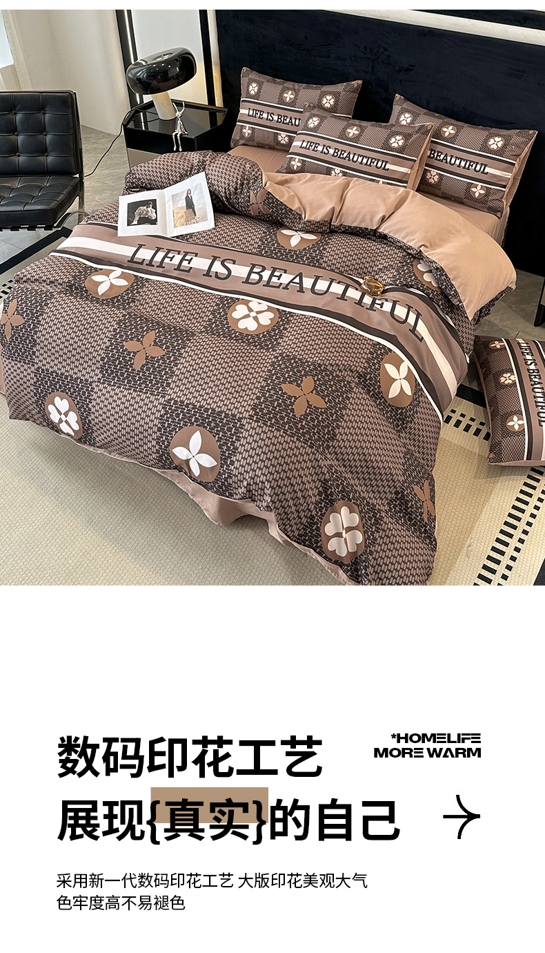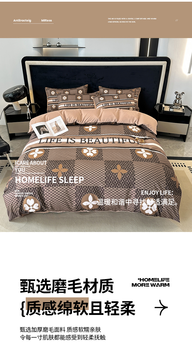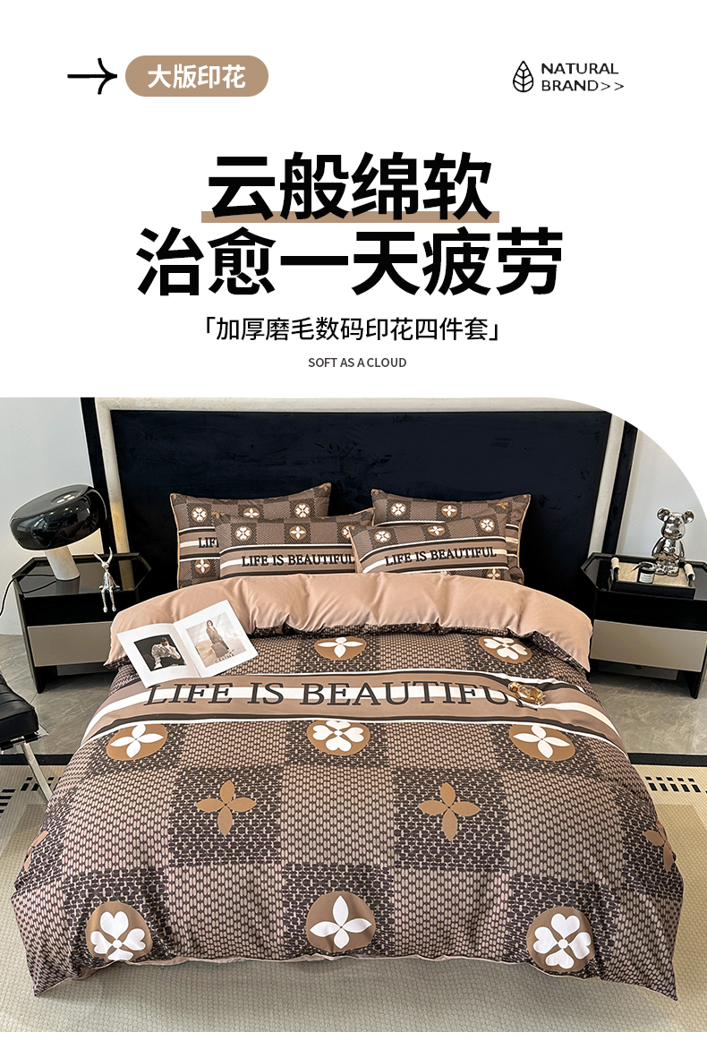 当前位置: 91家纺网 > 商品网购 > 床品套件 > 四件套 > 普通磨毛四件套 > 色鬼布艺 2023新款加厚双面磨毛数码大版印花四件套 四叶草-棕