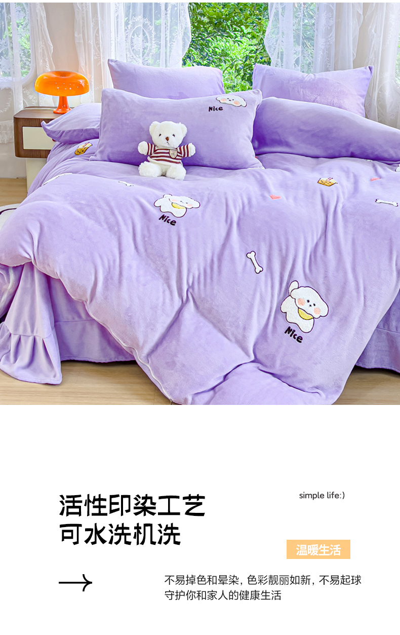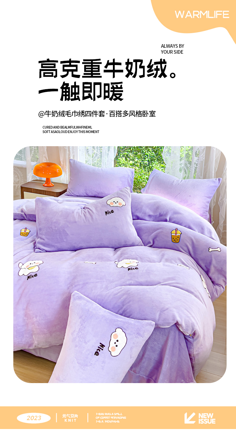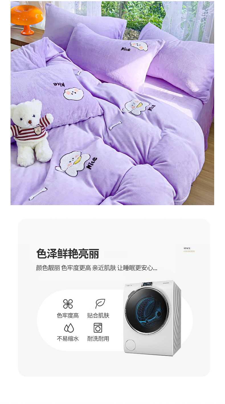 商品名称:米瑞娜 2024新款纯色毛巾绣牛奶绒四件套 皮皮狗-紫