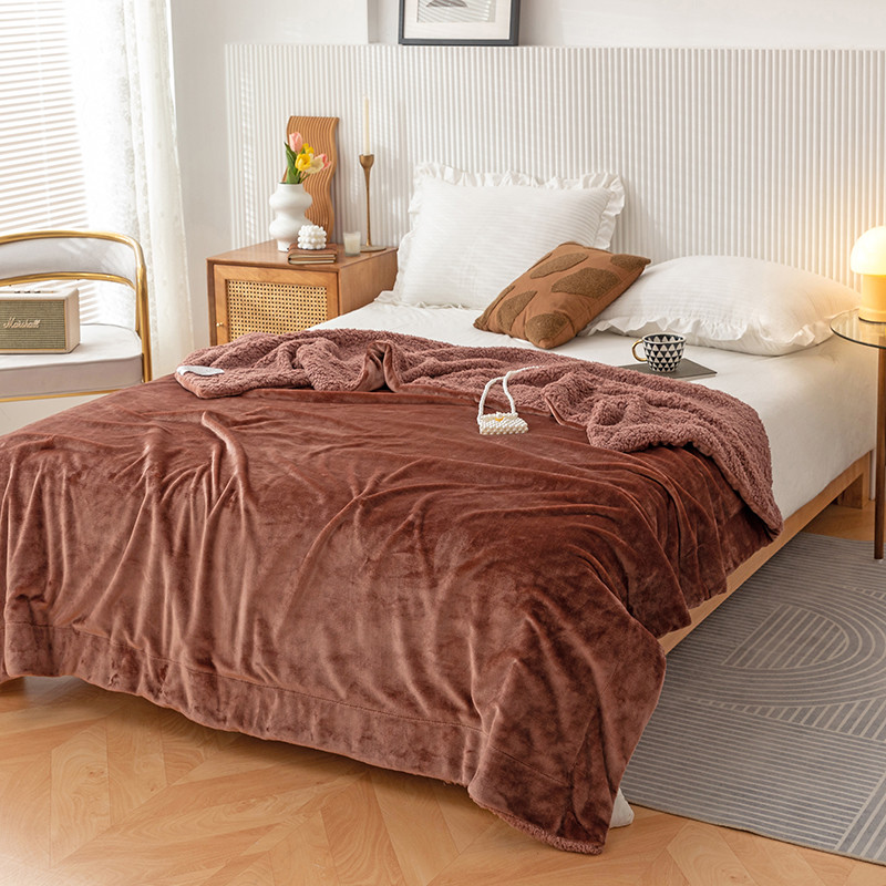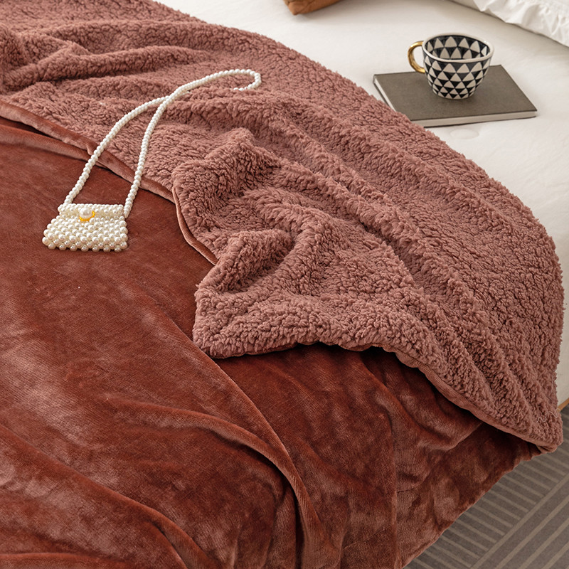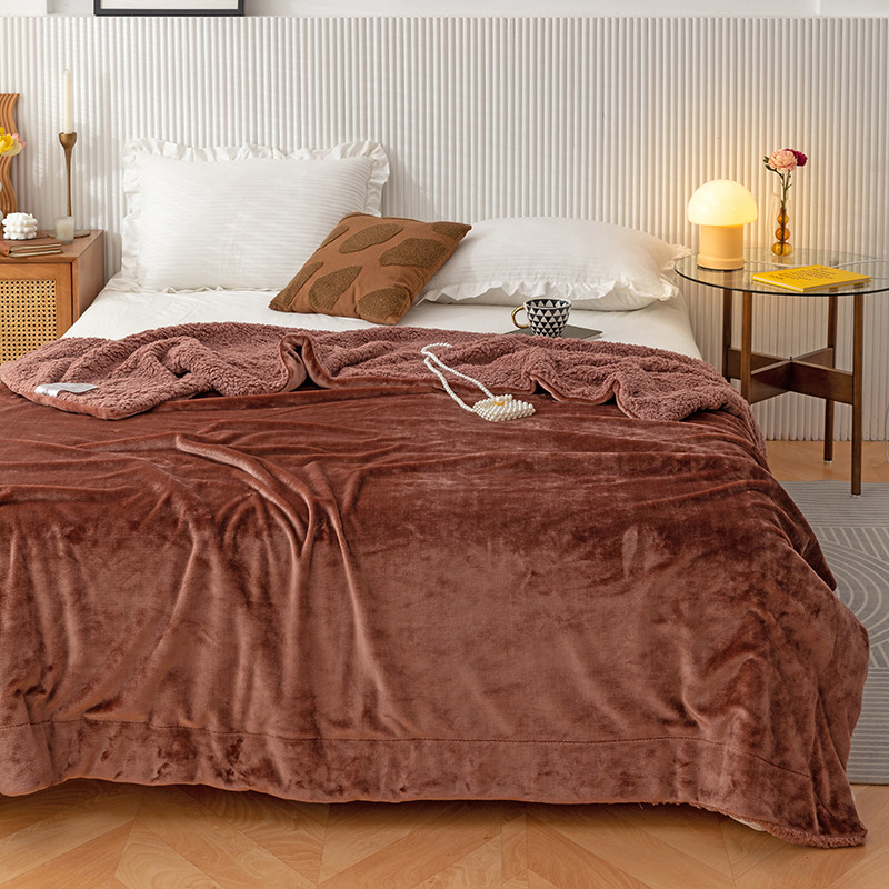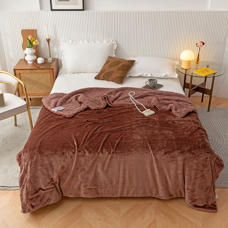 欧邦 新款爆款纯色羊羔绒双层毛毯 亚麻咖