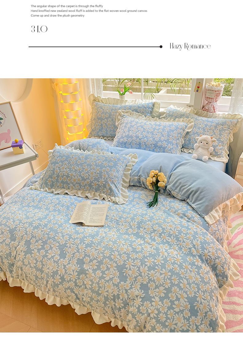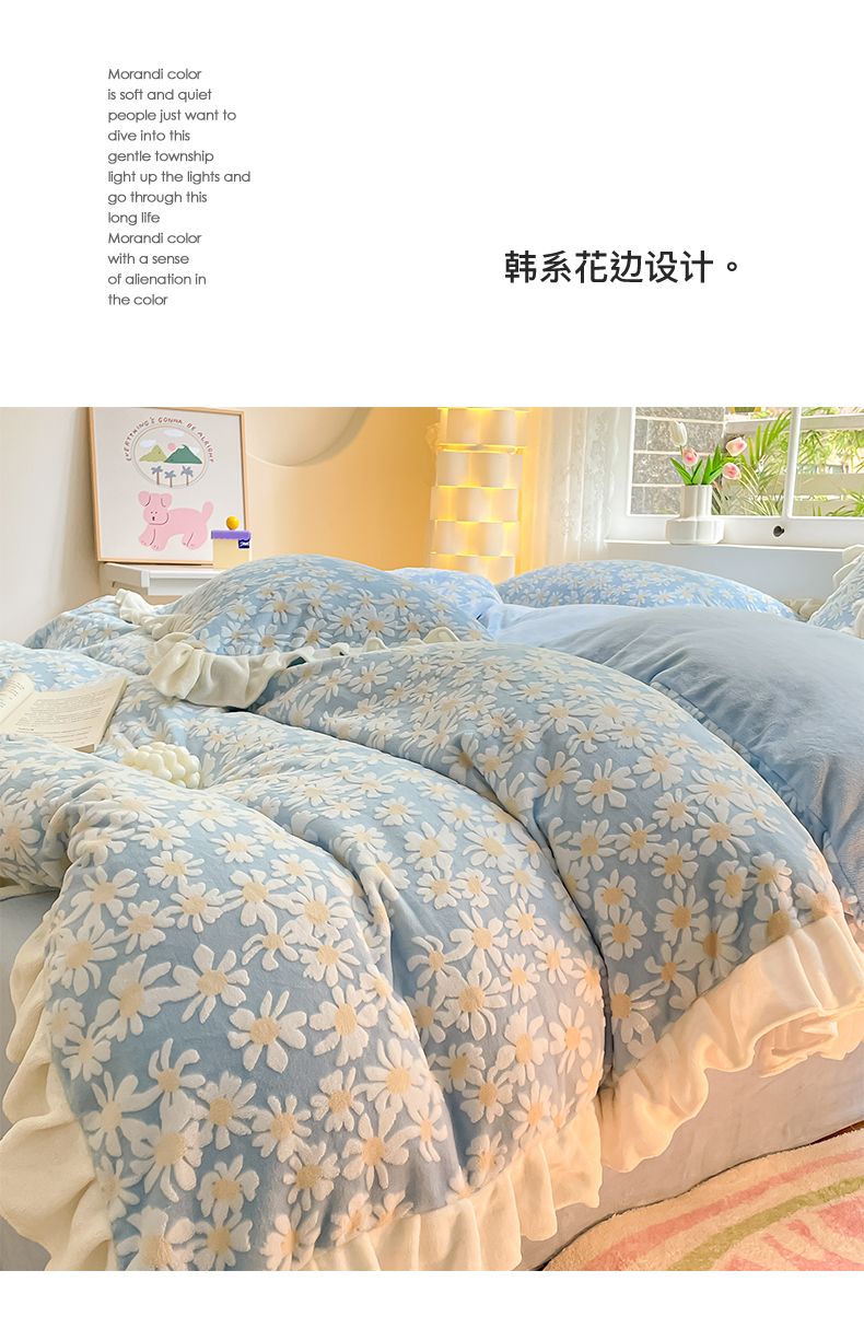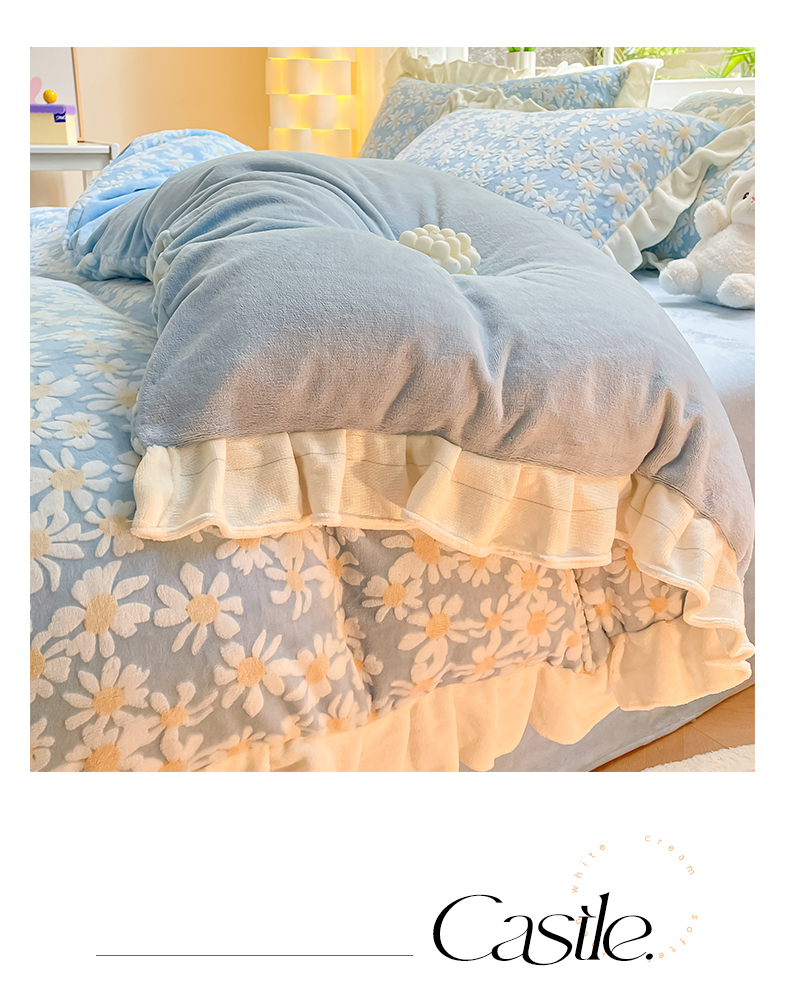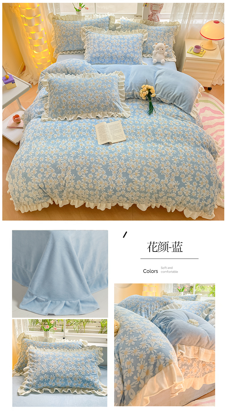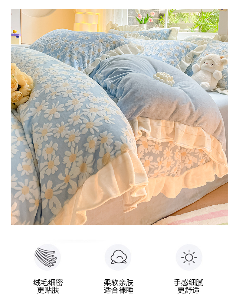 如一 2023新款直播荷叶边雕花牛奶绒吊边床单工艺四件套 法莱绒珊瑚绒套件 花颜-蓝