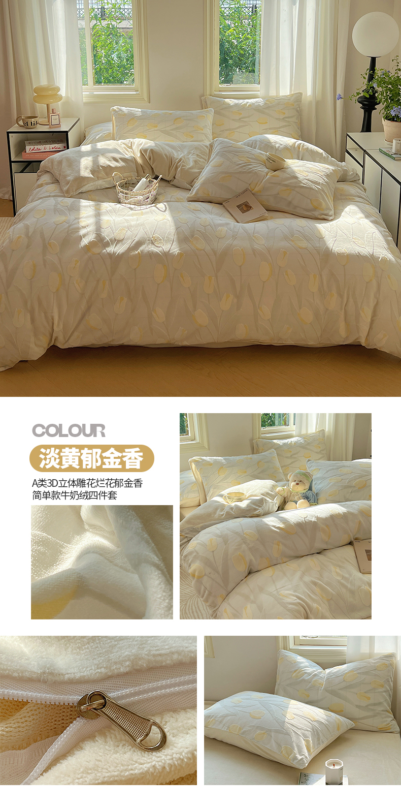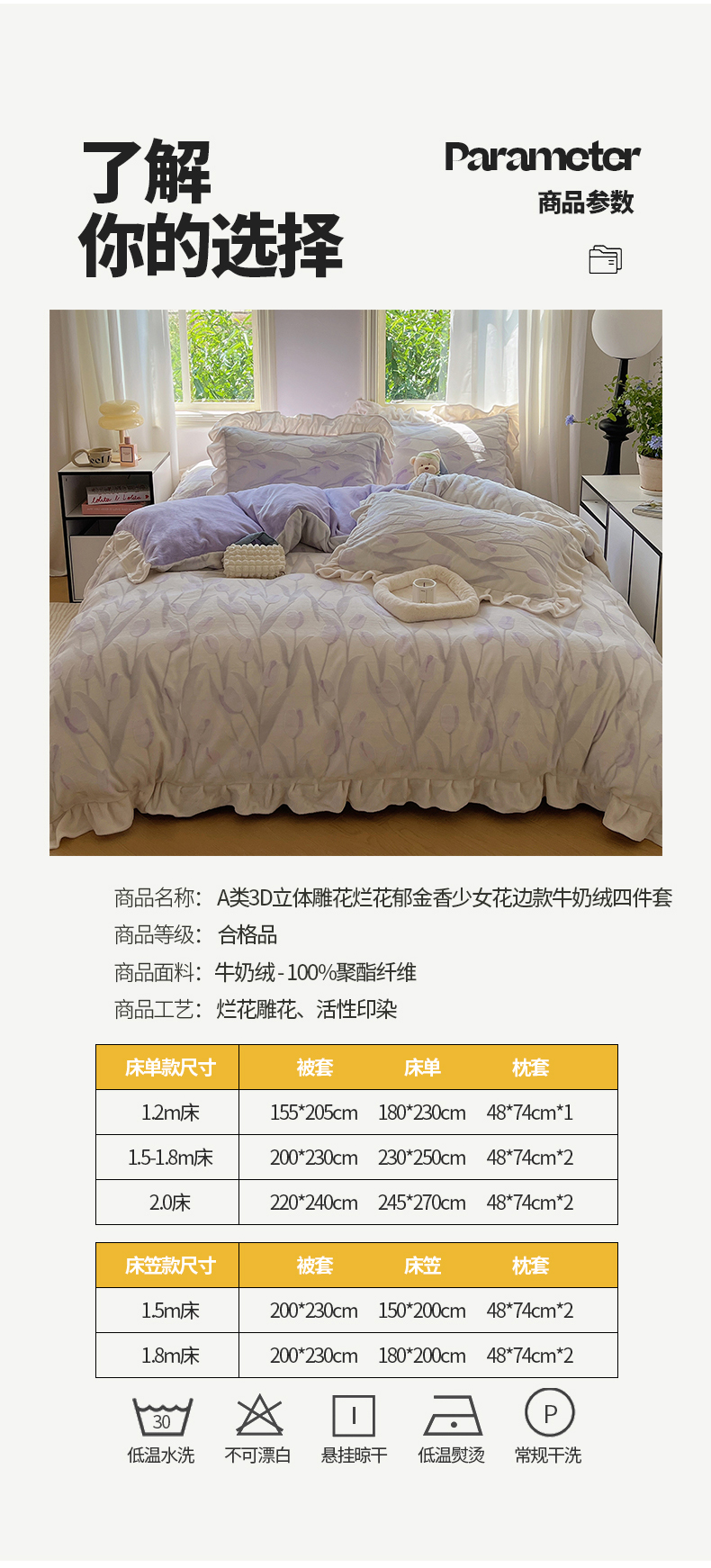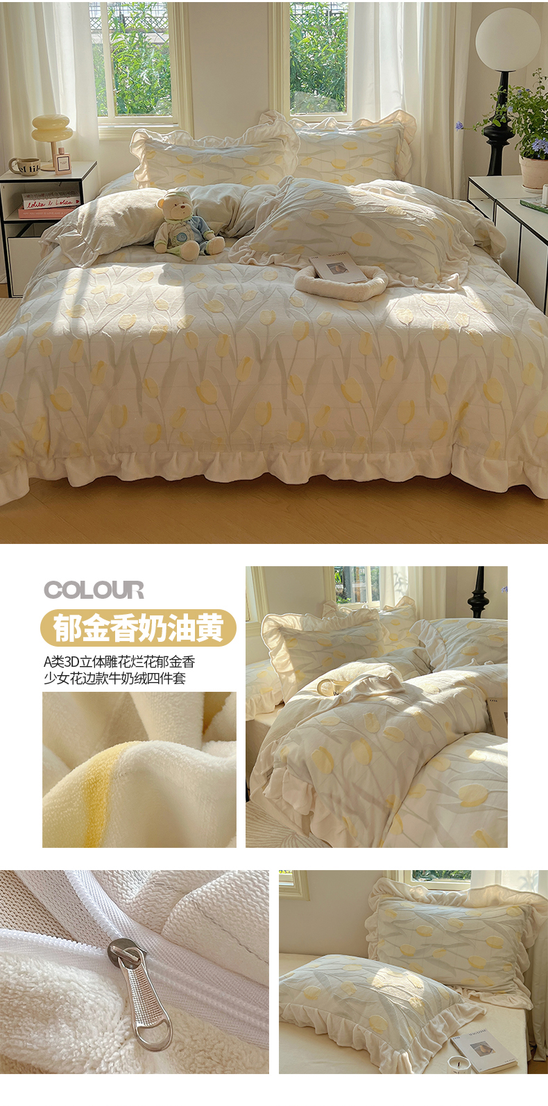 商品名称:(总)桃子家居 2023新款A类高克重230克3D立体雕花烂花提花着色郁金香少女花边款简单款牛奶绒四件套