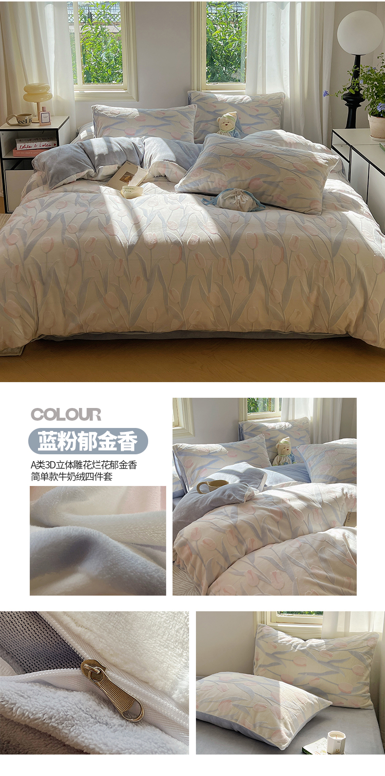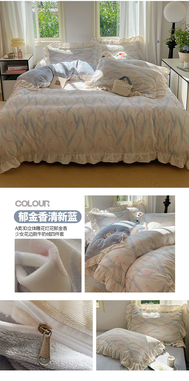 (总)桃子家居 2023新款A类高克重230克3D立体雕花烂花提花着色郁金香少女花边款简单款牛奶绒四件套