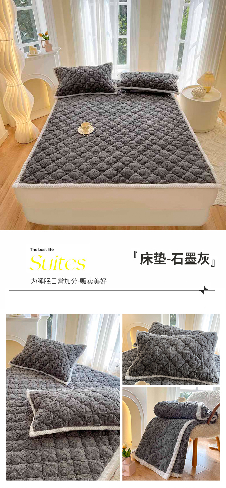 商品名称:欧邦 新款爱心款提花塔芙绒夹棉床垫榻榻米薄垫子 床垫-石墨灰