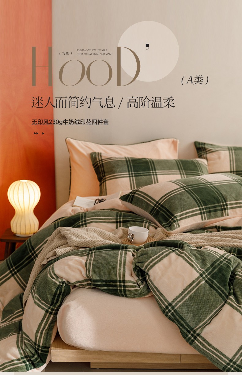当前位置: 91家纺网 > 商品网购 > 床品套件 > 四件套 > 牛奶绒四件套 > 卡巴伦 2023新款无印风230gA类全消光牛奶绒四件套 绿大格