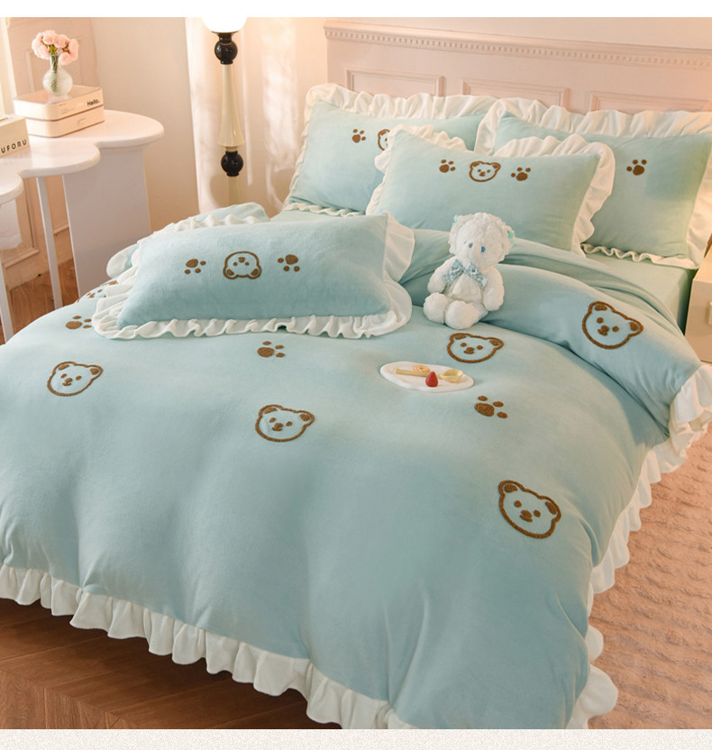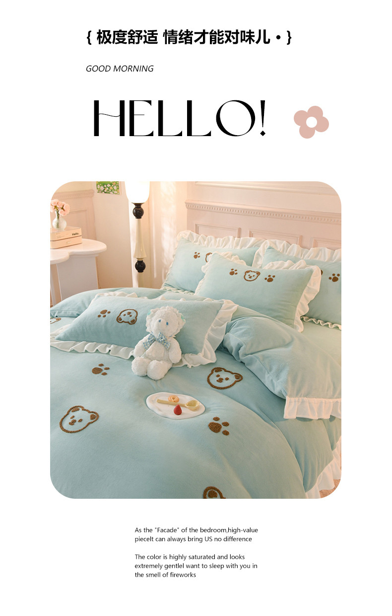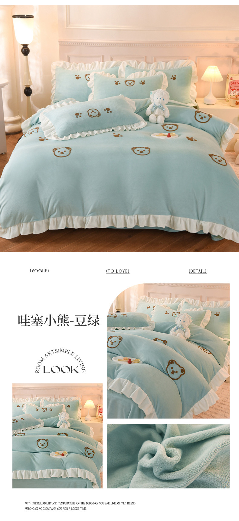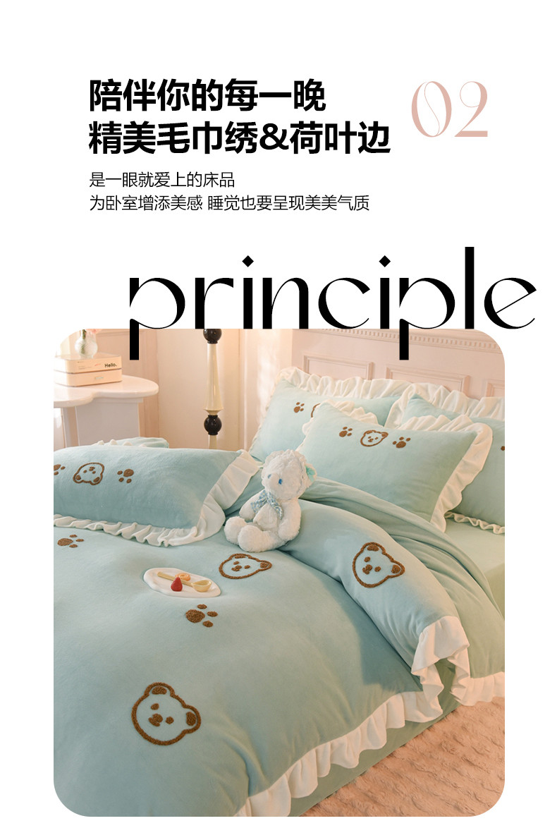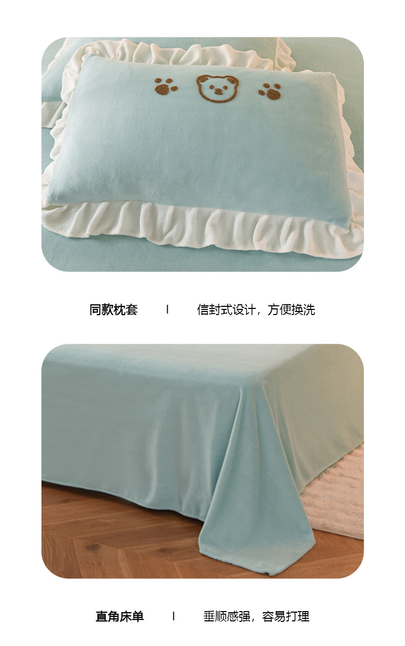 商品名称:菲儿家纺 2023新款牛奶绒毛巾绣四件套 哇塞小熊-豆绿