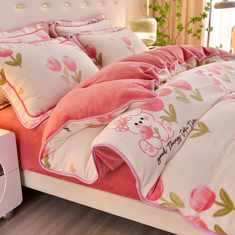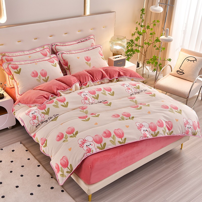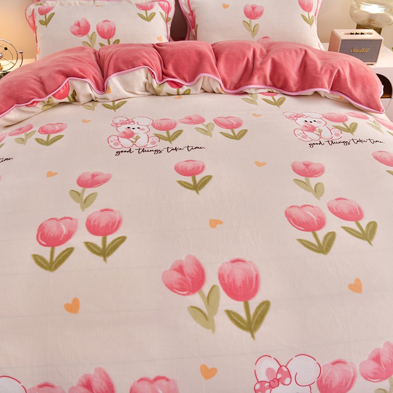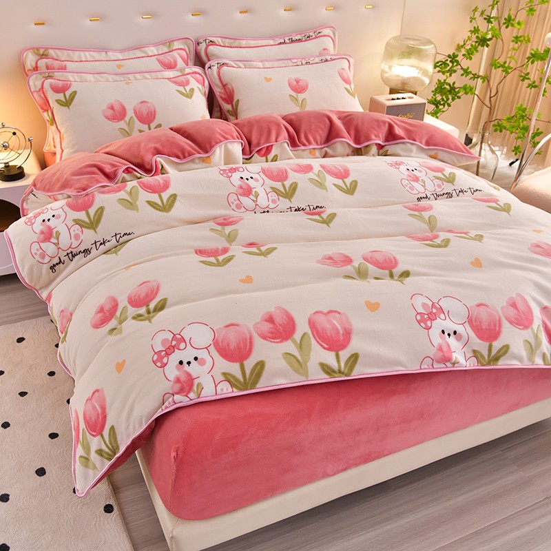 当前位置: 91家纺网 > 商品网购 > 床品套件 > 四件套 > 牛奶绒四件套 > 新款A类8.5到9斤印花牛奶绒金貂绒床裙款保暖绒四件套 花间兔-床笠款