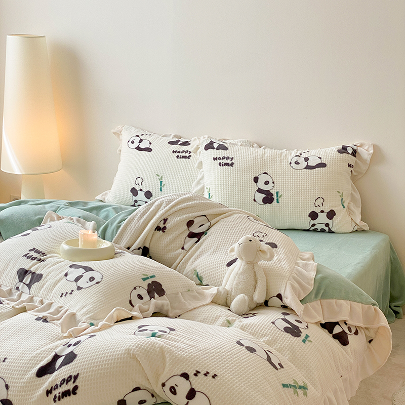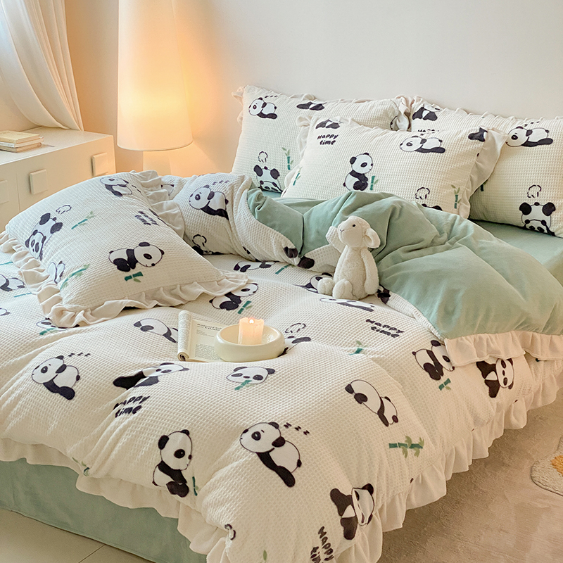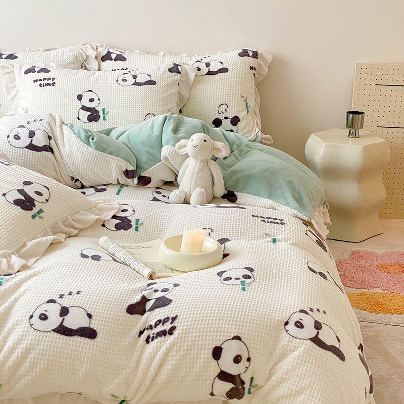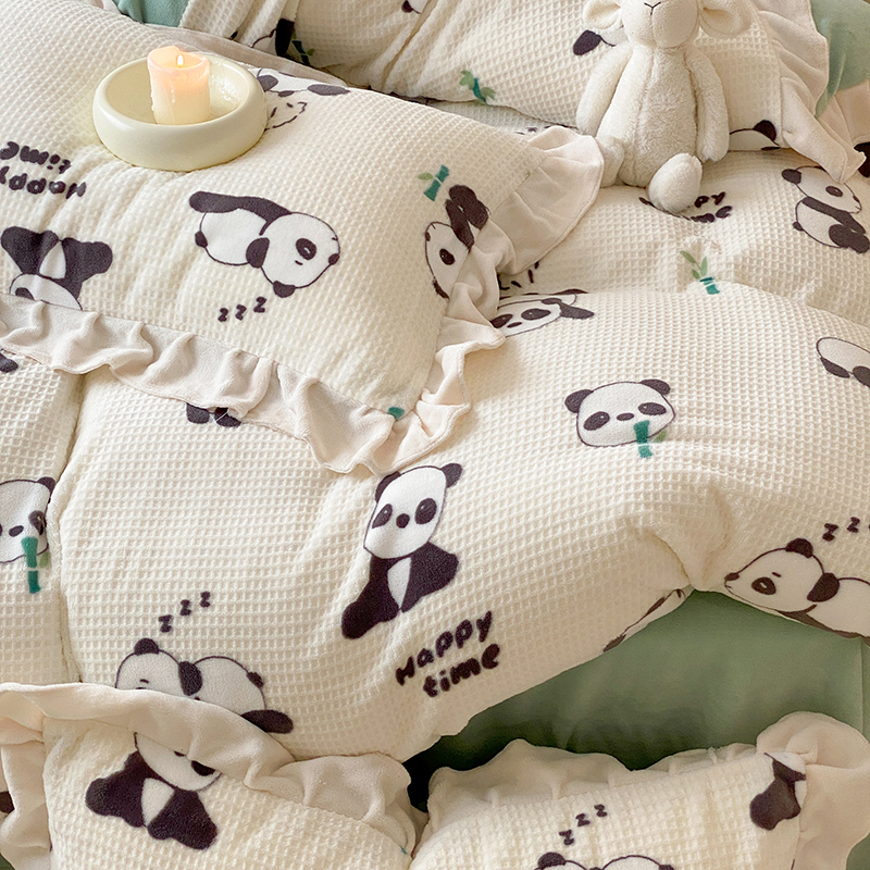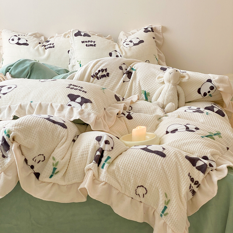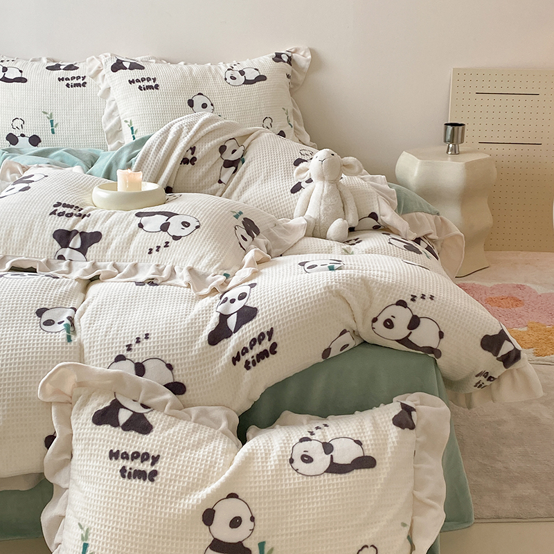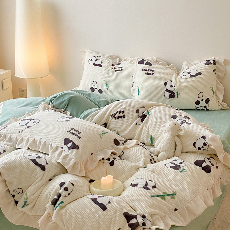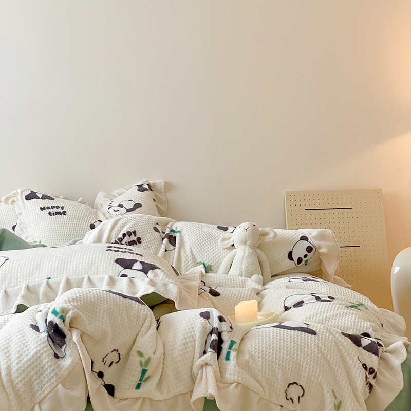 潘朵拉家纺 2023新款雕花韩式华夫格花边牛奶绒四件套 开心熊宝