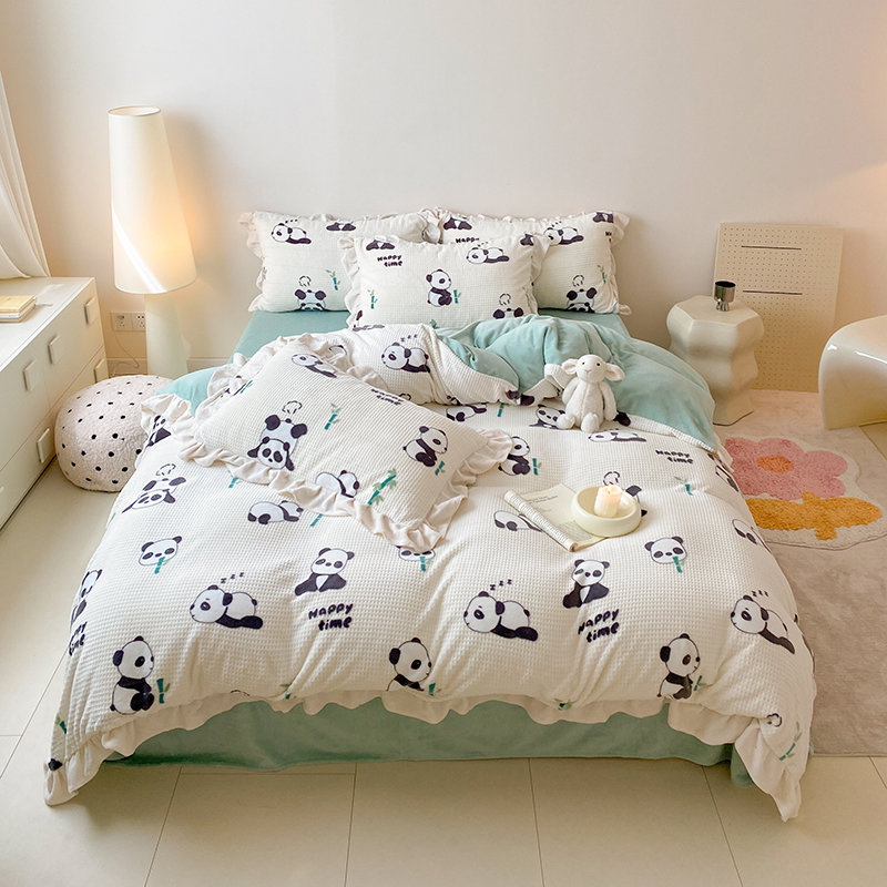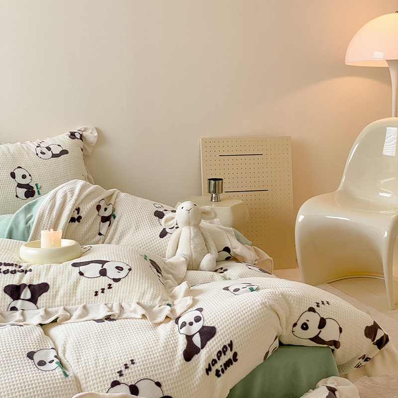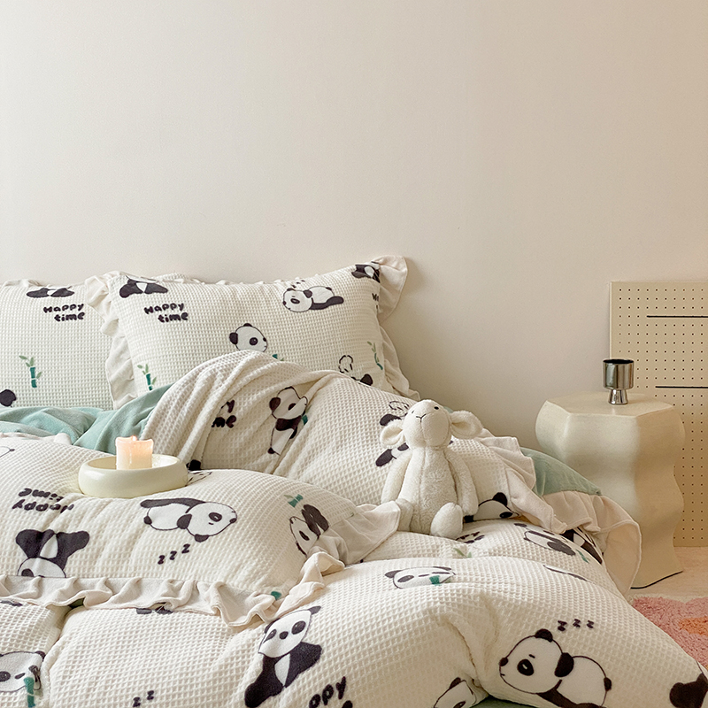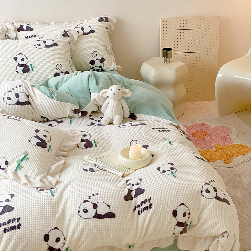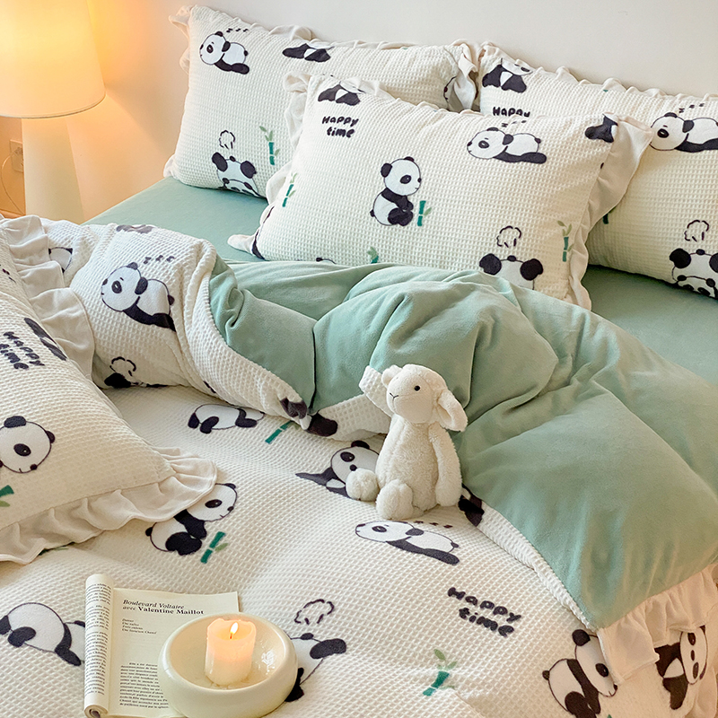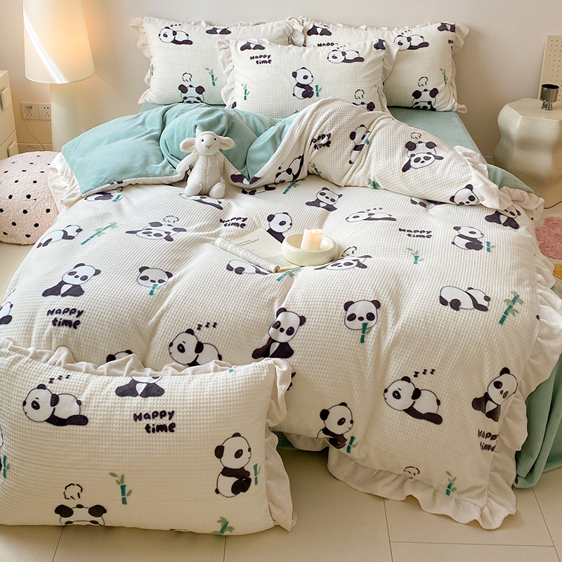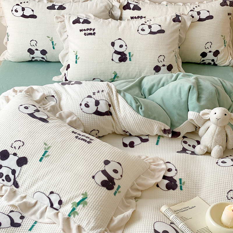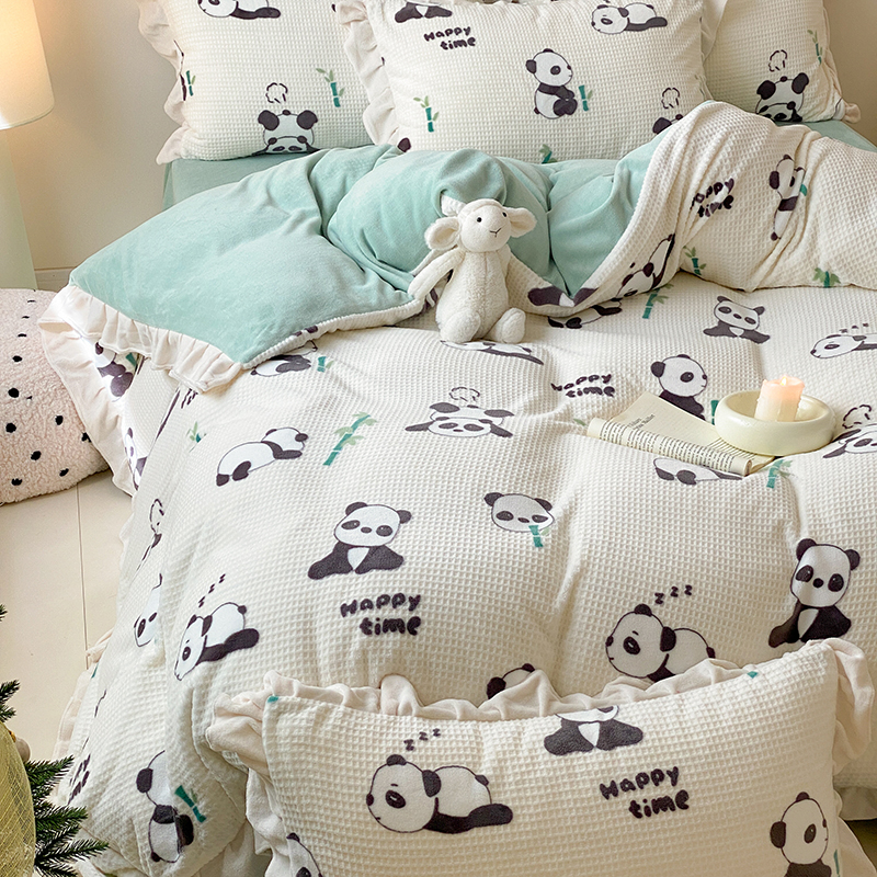 潘朵拉家纺 2023新款雕花韩式华夫格花边牛奶绒四件套 开心熊宝