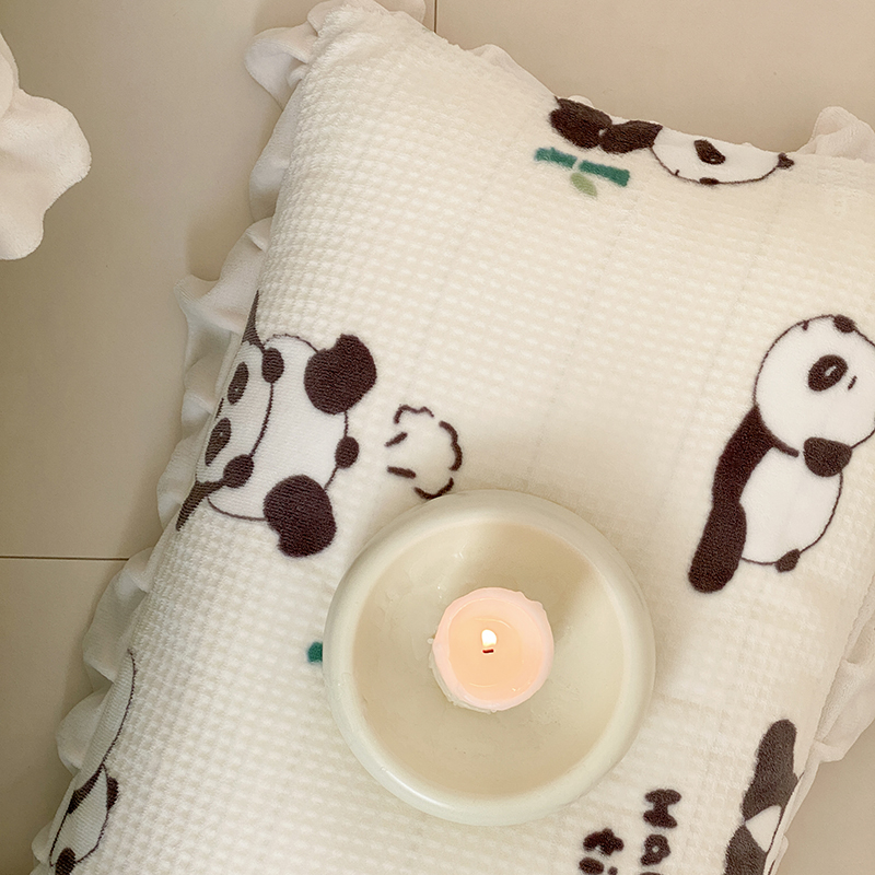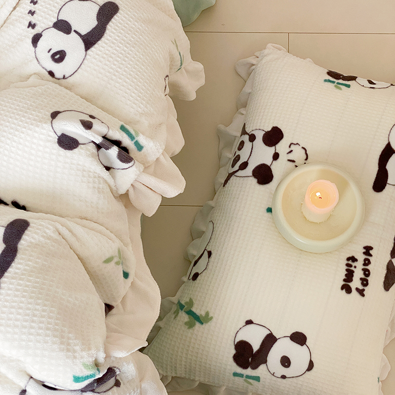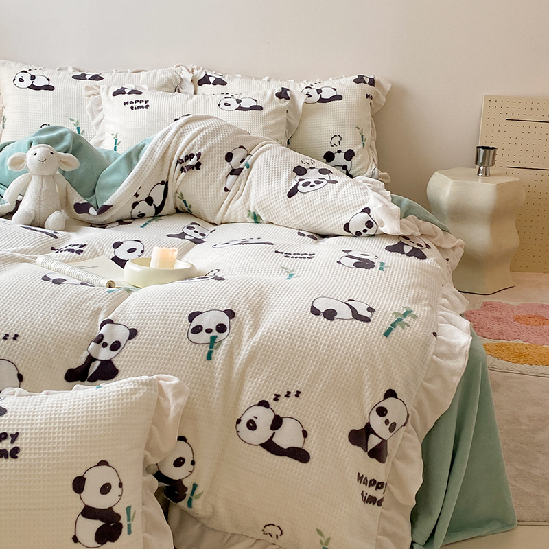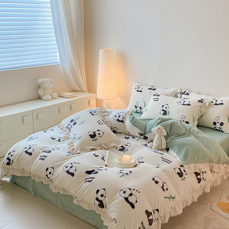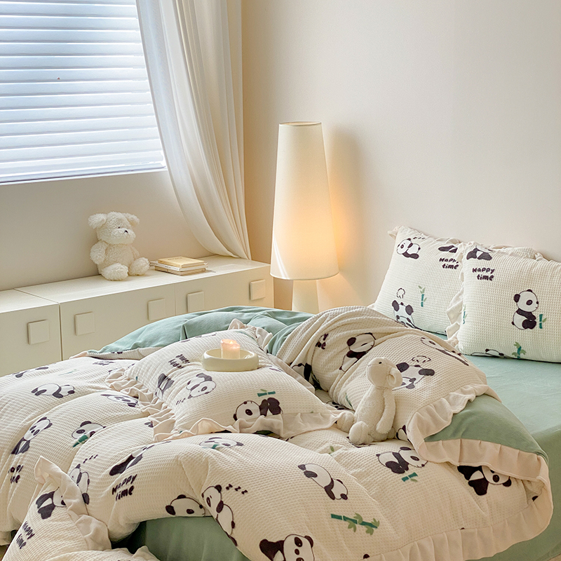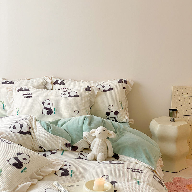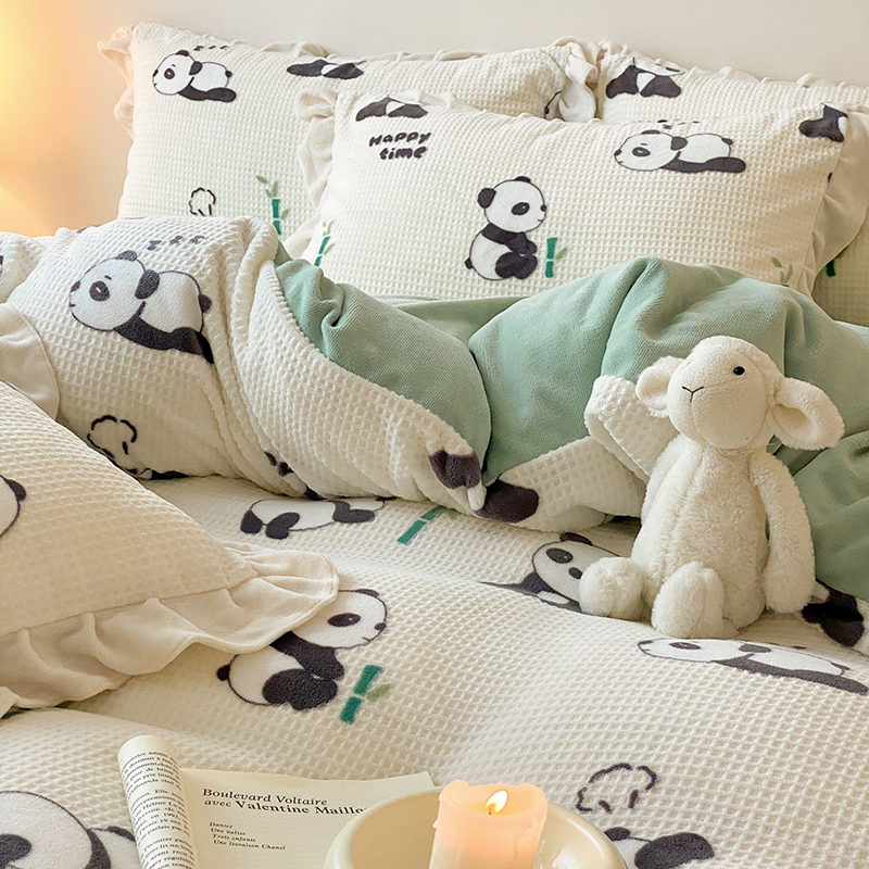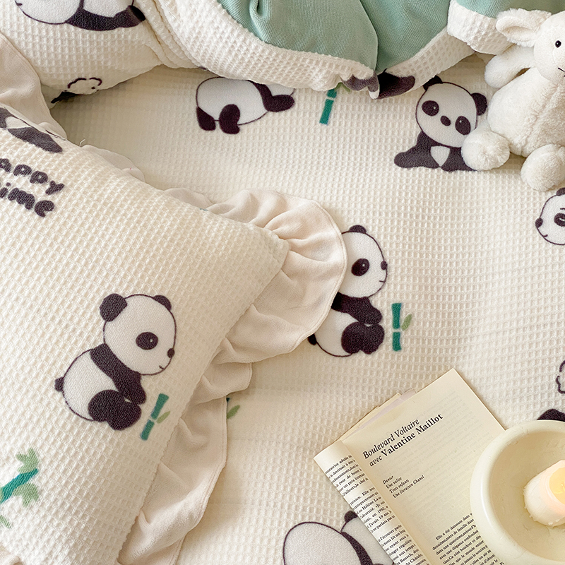 潘朵拉家纺 2023新款雕花韩式华夫格花边牛奶绒四件套 开心熊宝