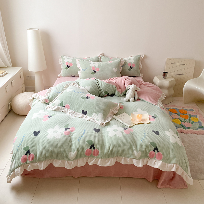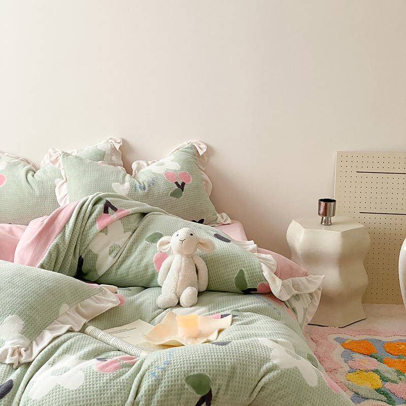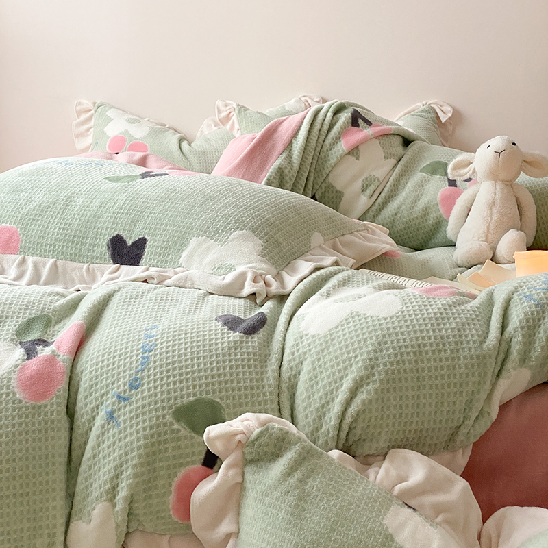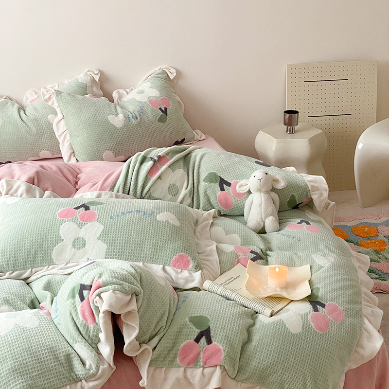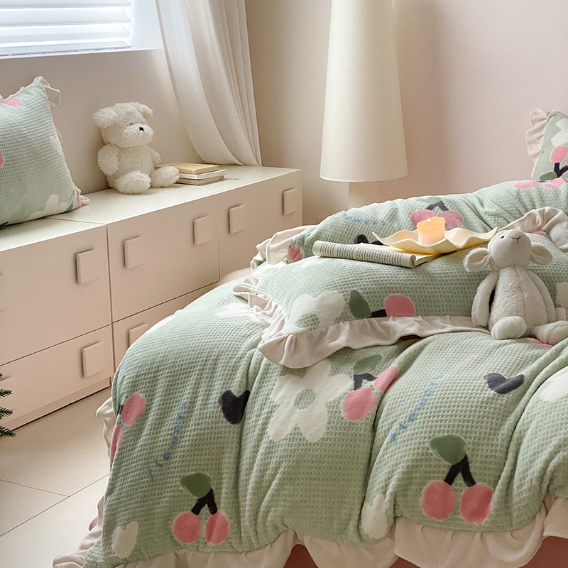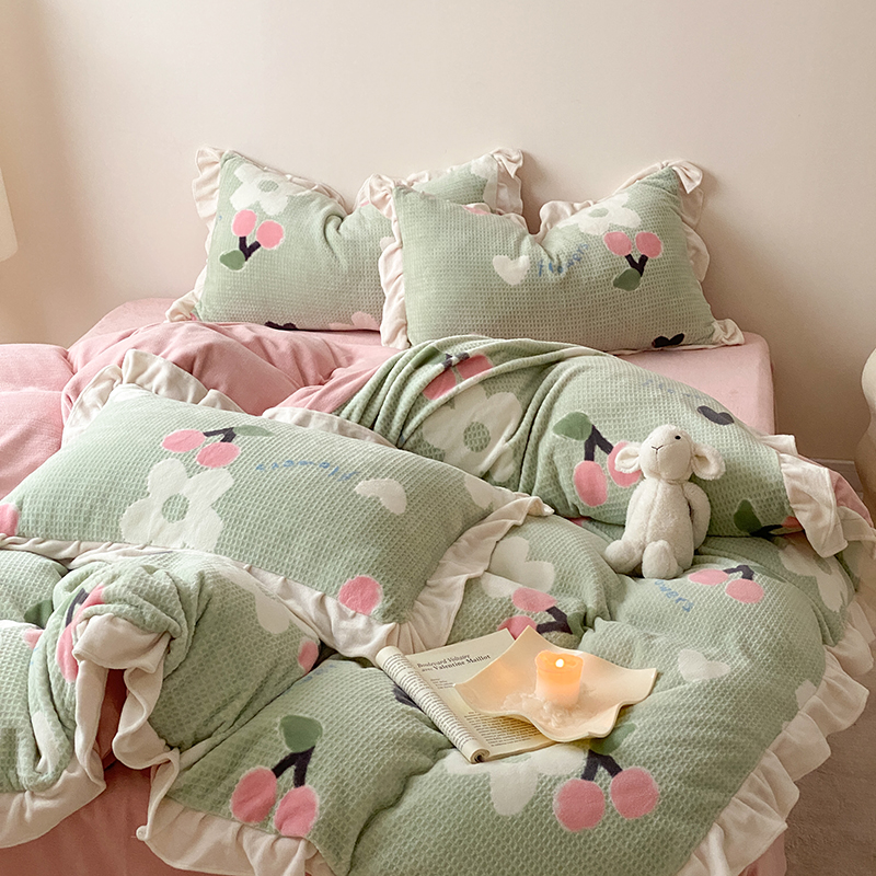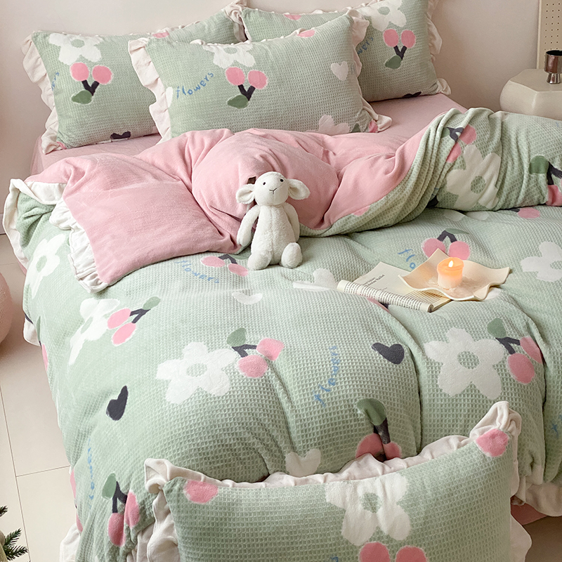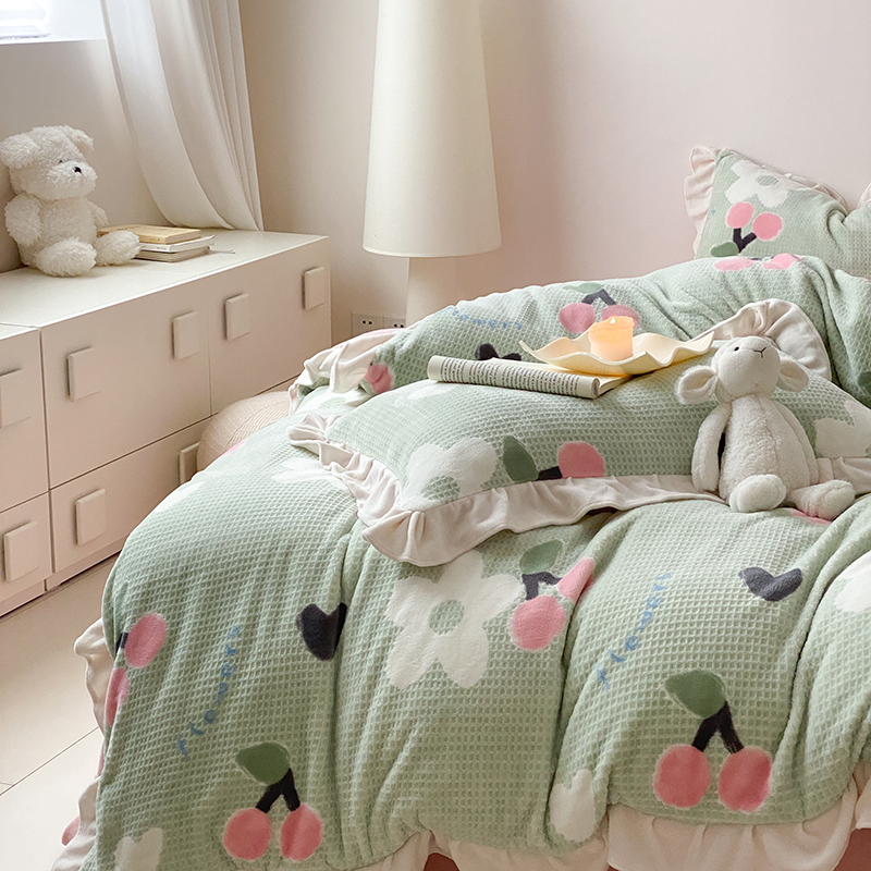 商品名称:潘朵拉家纺 2023新款雕花韩式华夫格花边牛奶绒四件套 樱樱花语(绿)