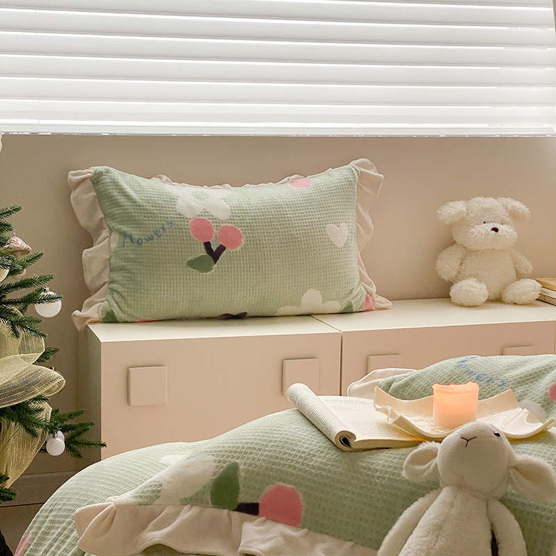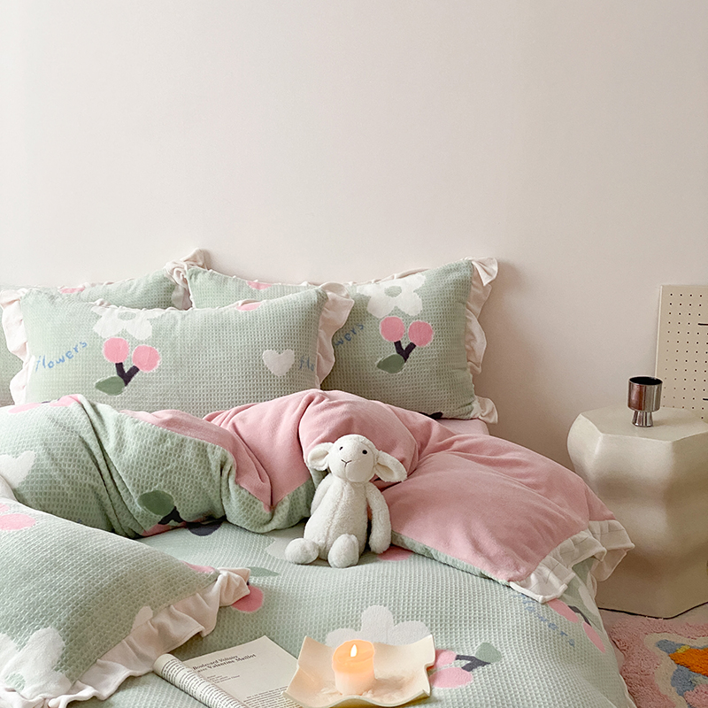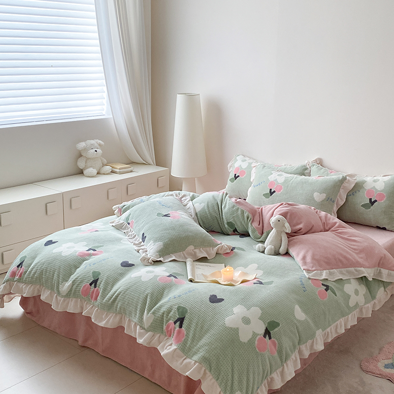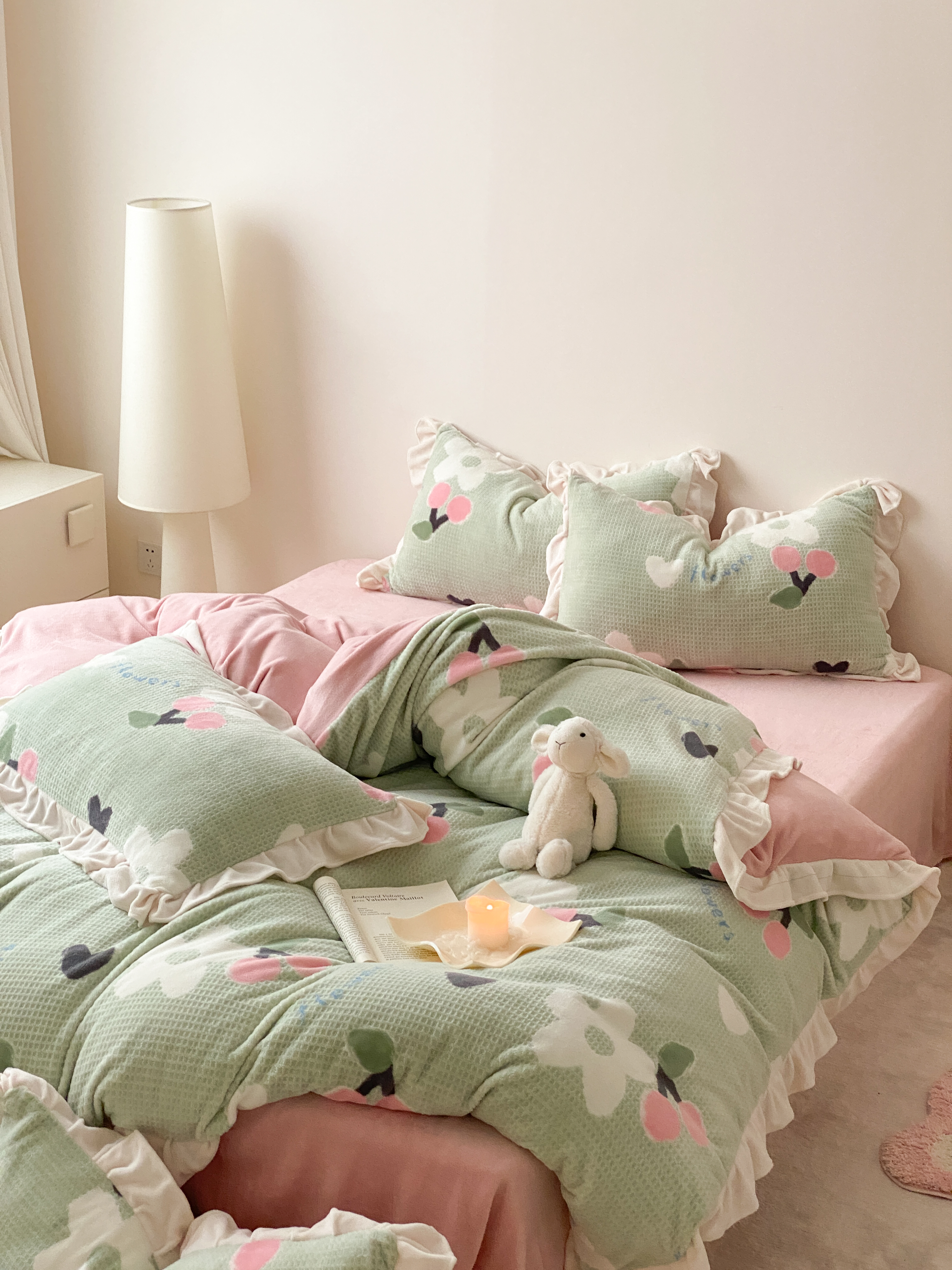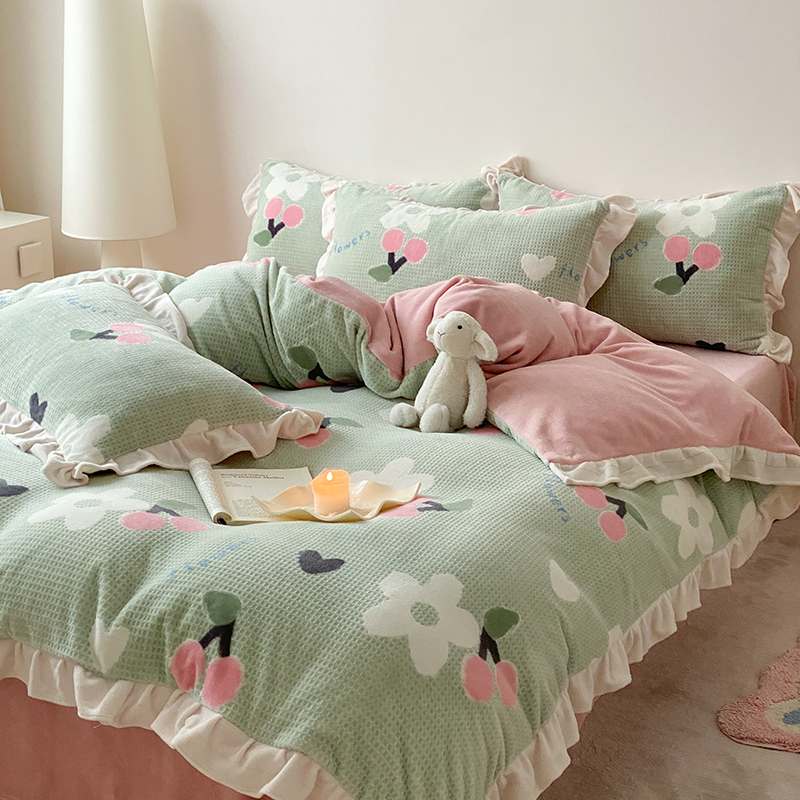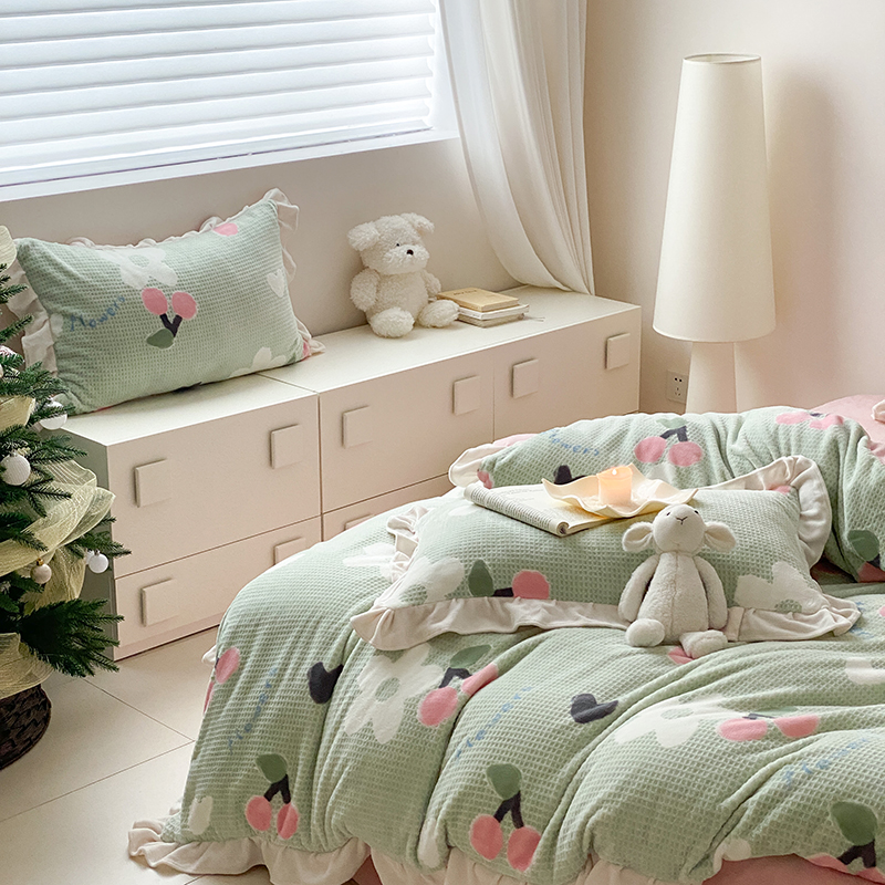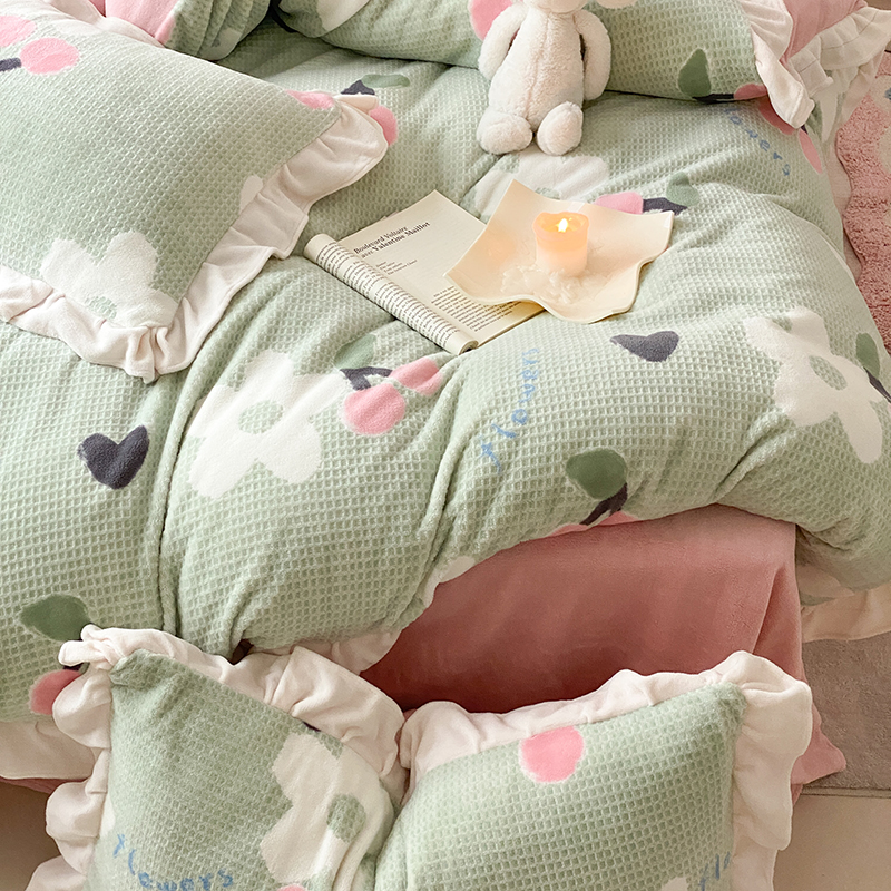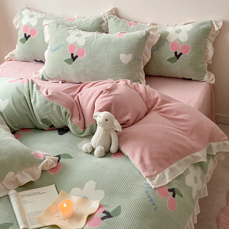 商品名称:潘朵拉家纺 2023新款雕花韩式华夫格花边牛奶绒四件套 樱樱花语(绿)