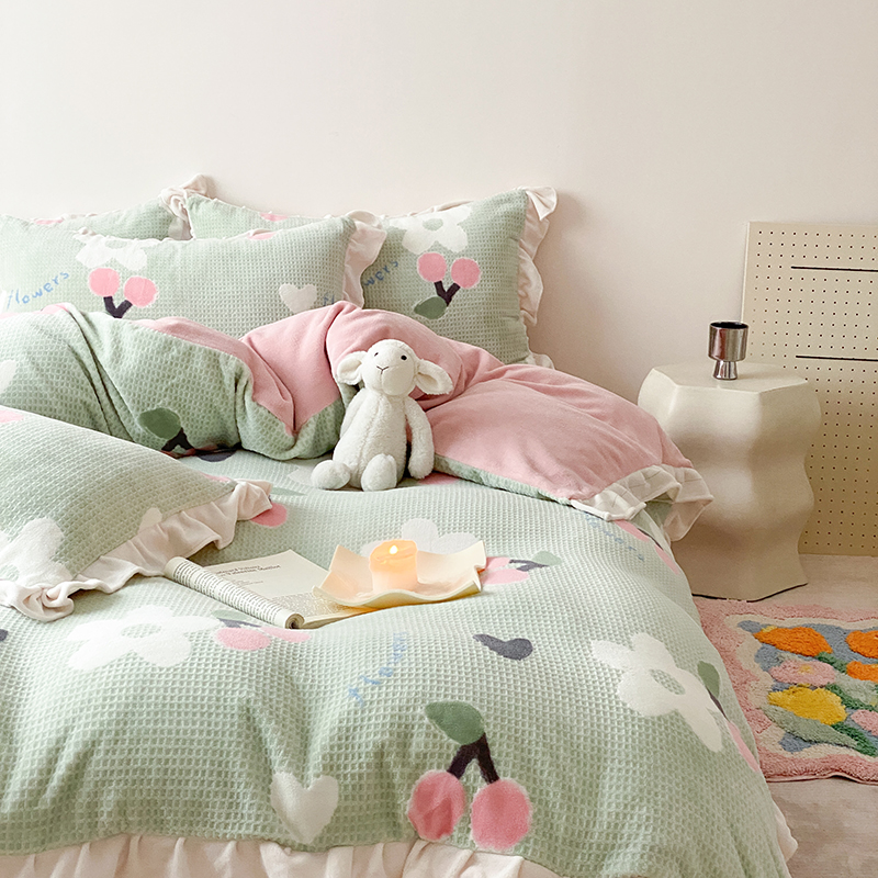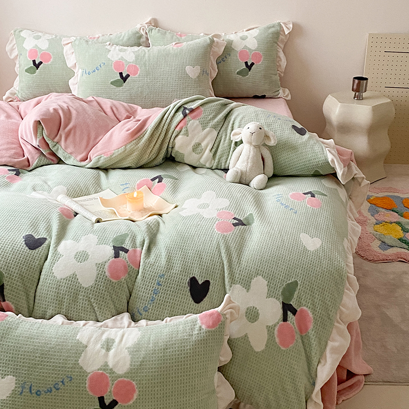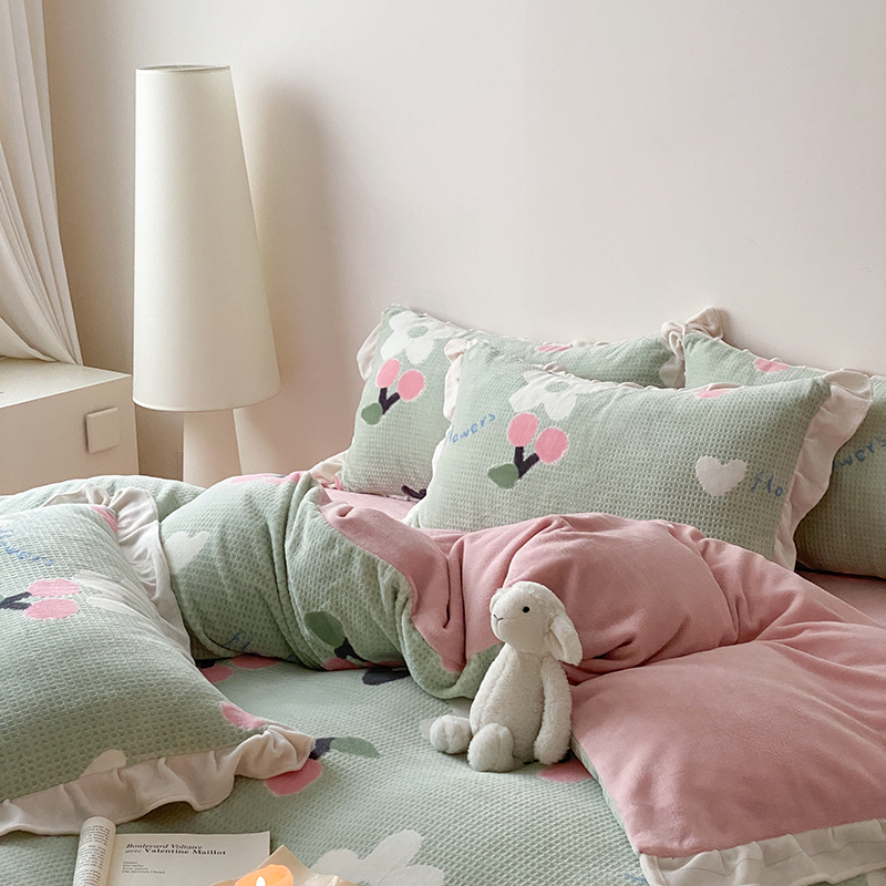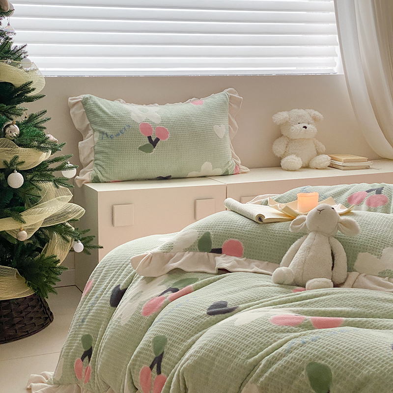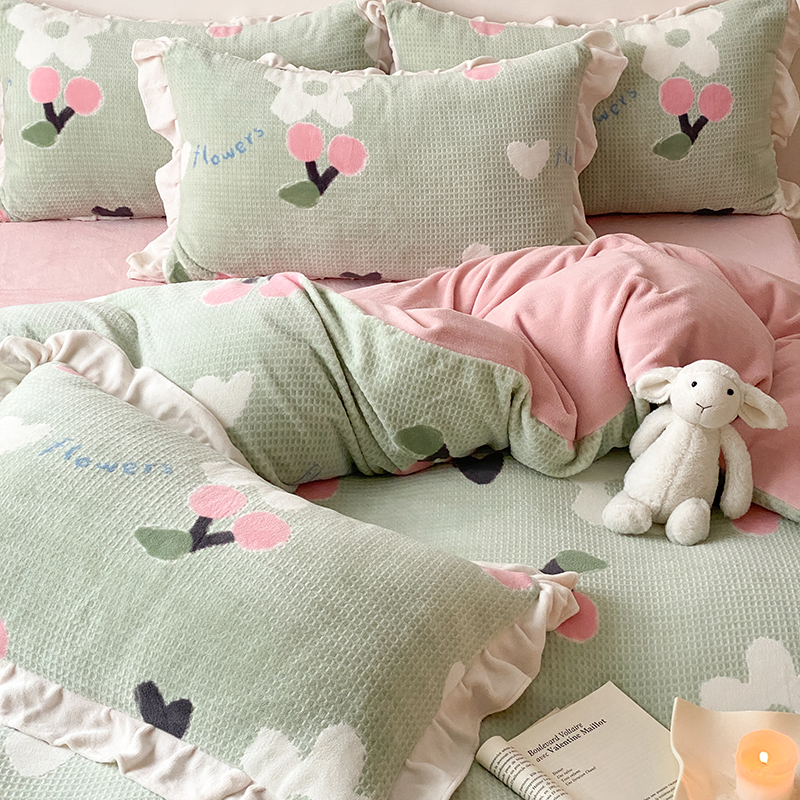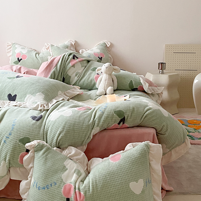 潘朵拉家纺 2023新款雕花韩式华夫格花边牛奶绒四件套 樱樱花语(绿)