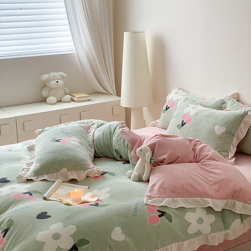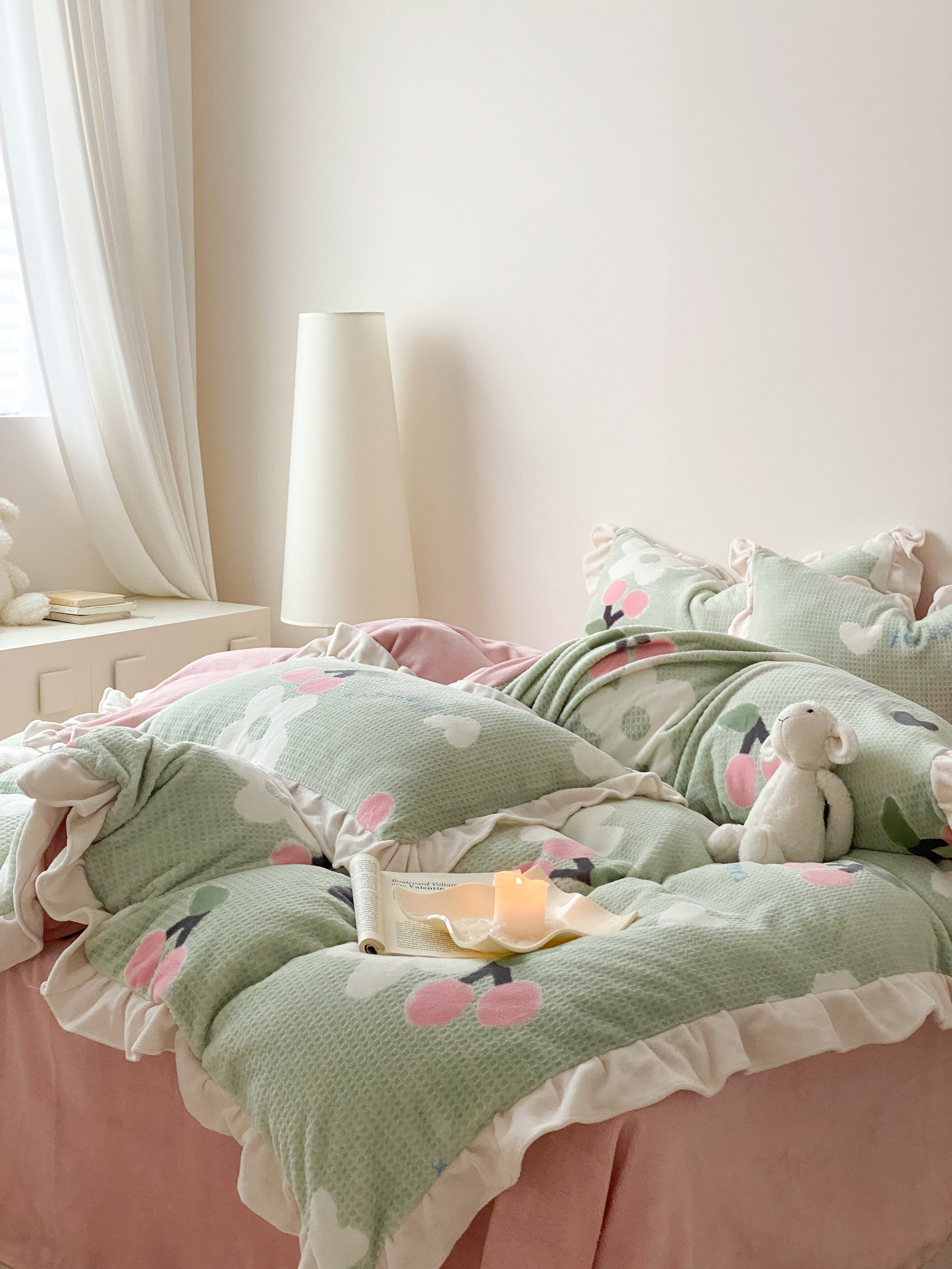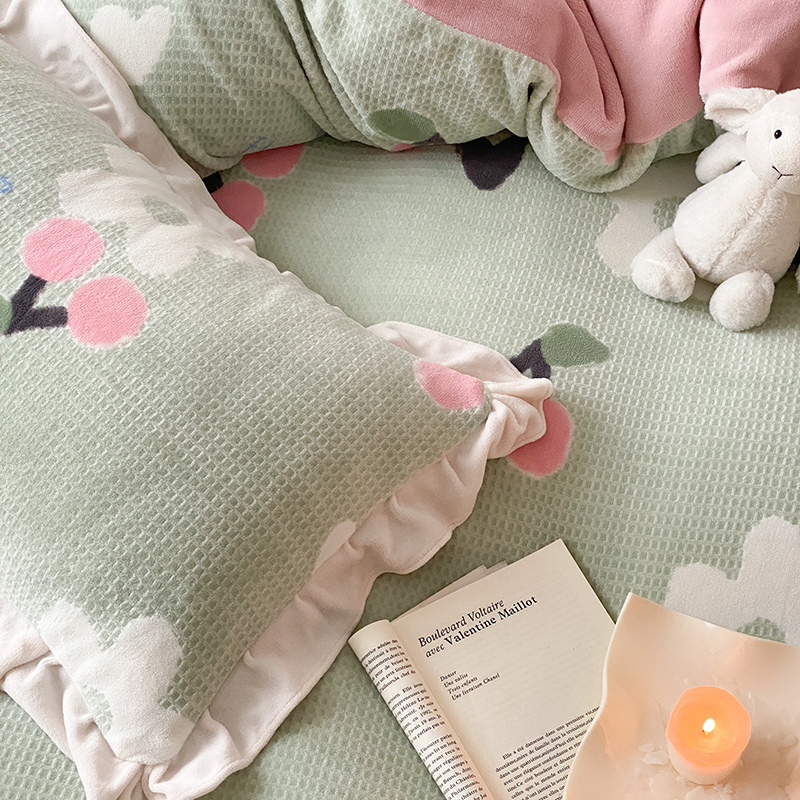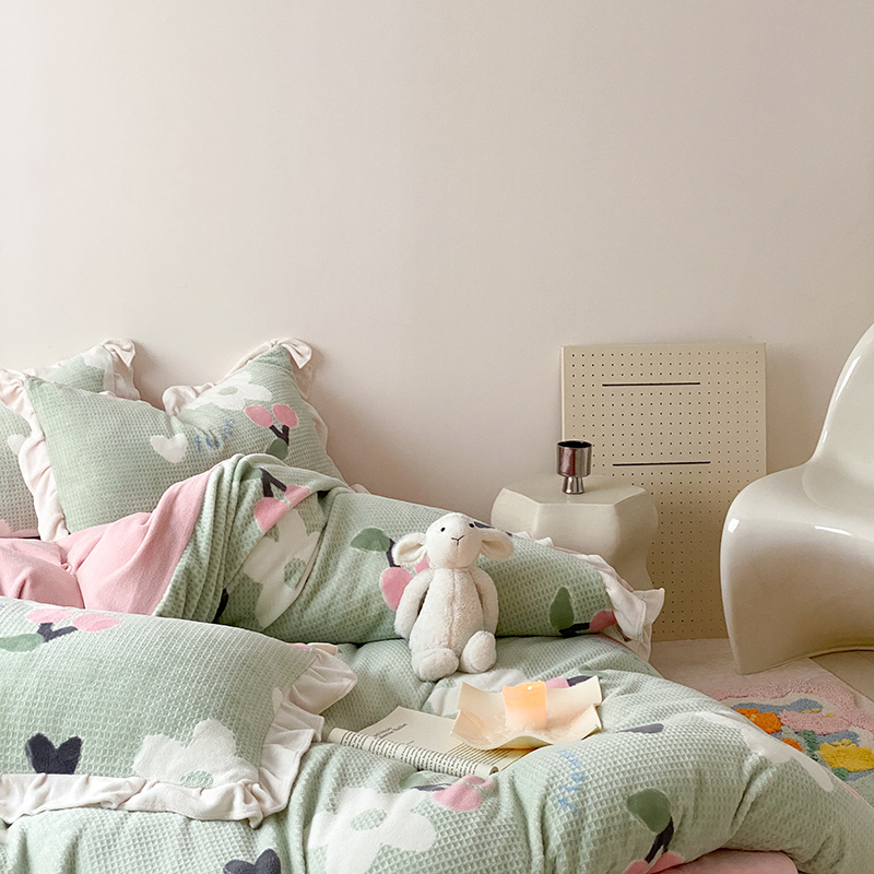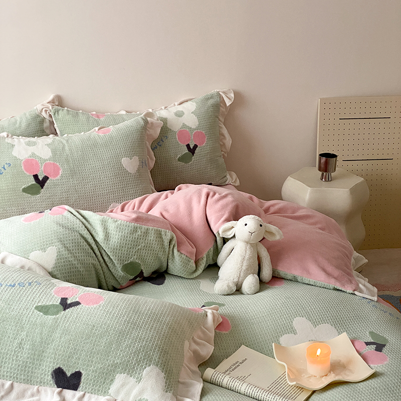 潘朵拉家纺 2023新款雕花韩式华夫格花边牛奶绒四件套 樱樱花语(绿)