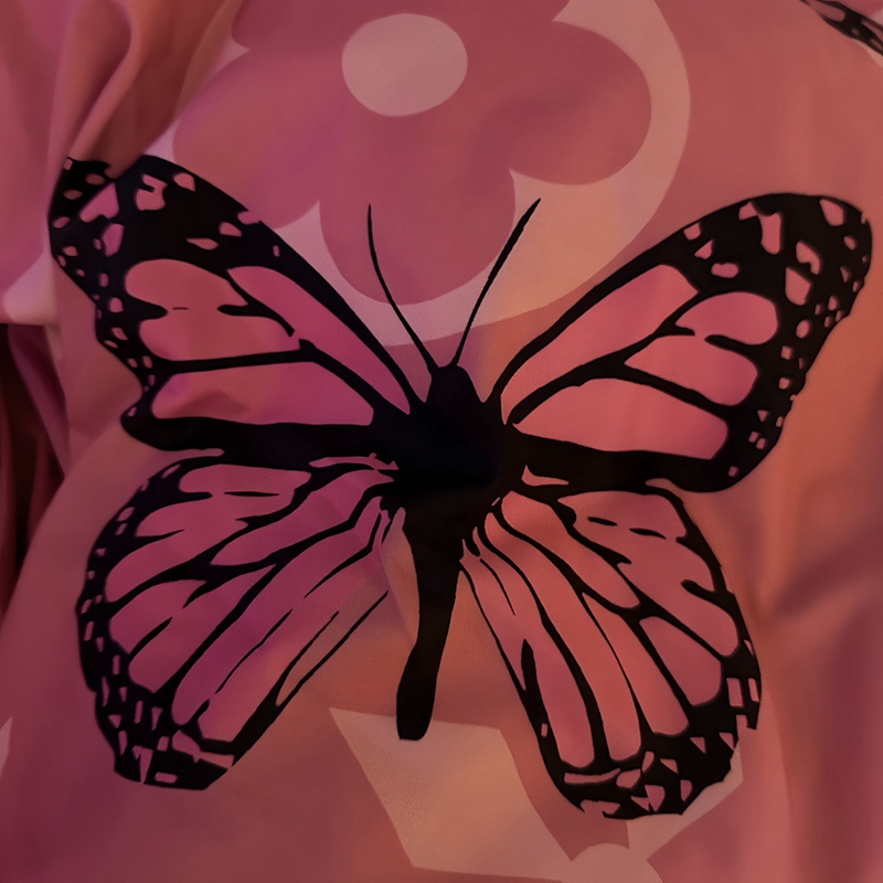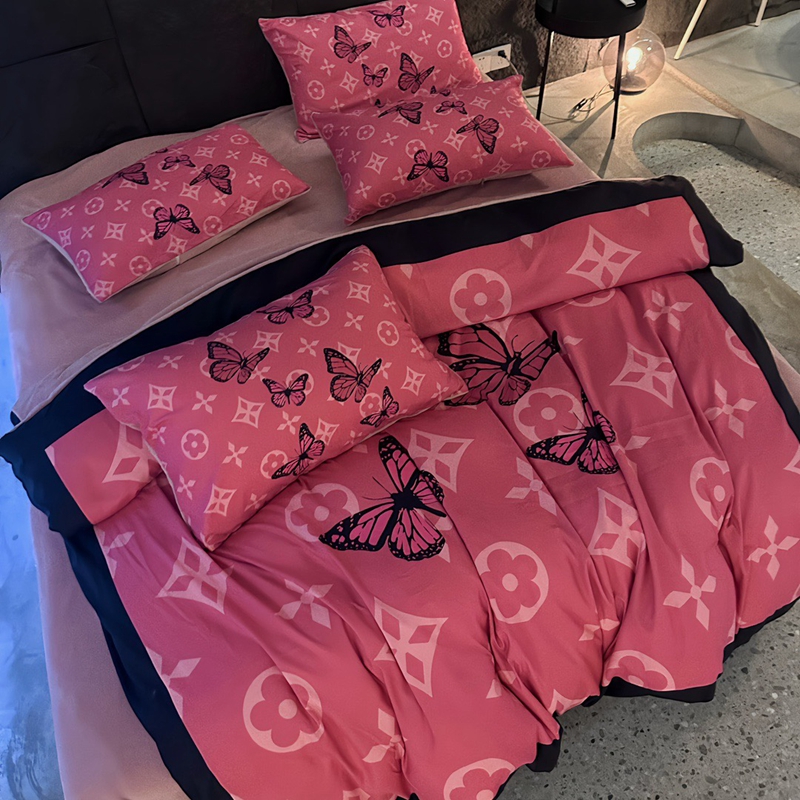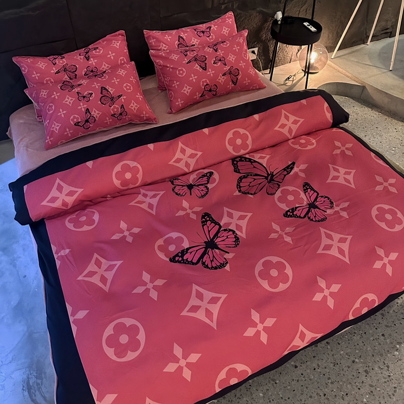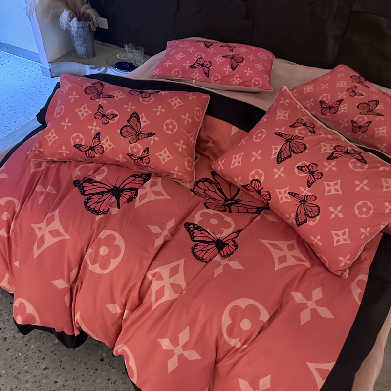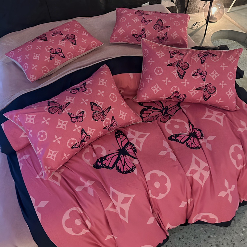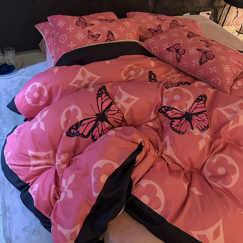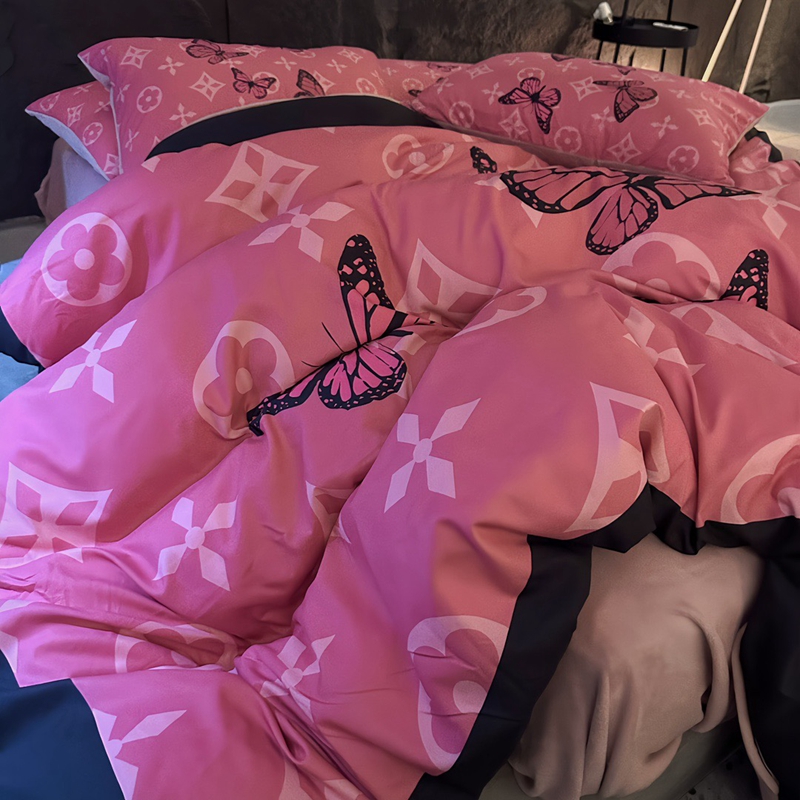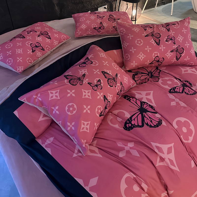 商品名称:色鬼 2023新款轻奢潮牌大牌风棉加绒四件套印花牛奶绒四件套 粉蝶