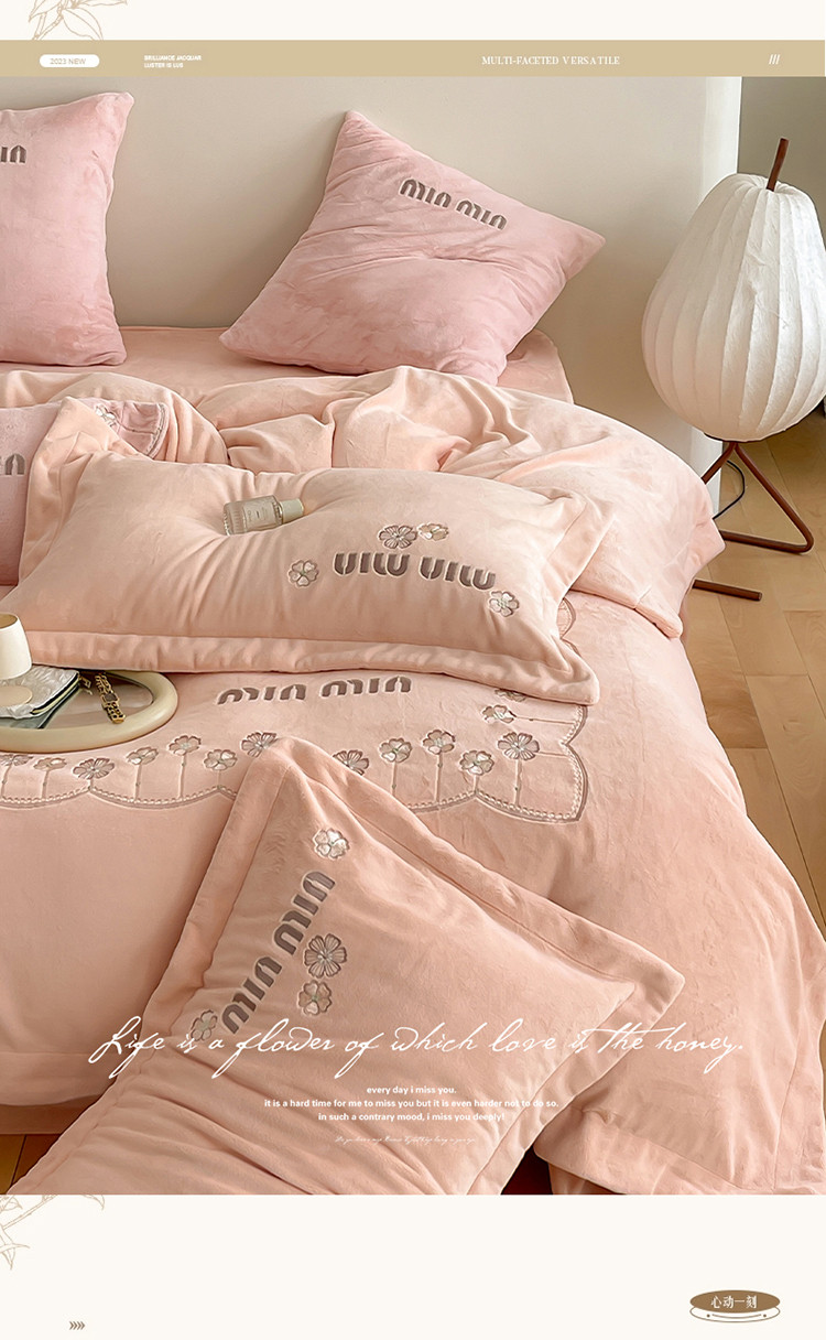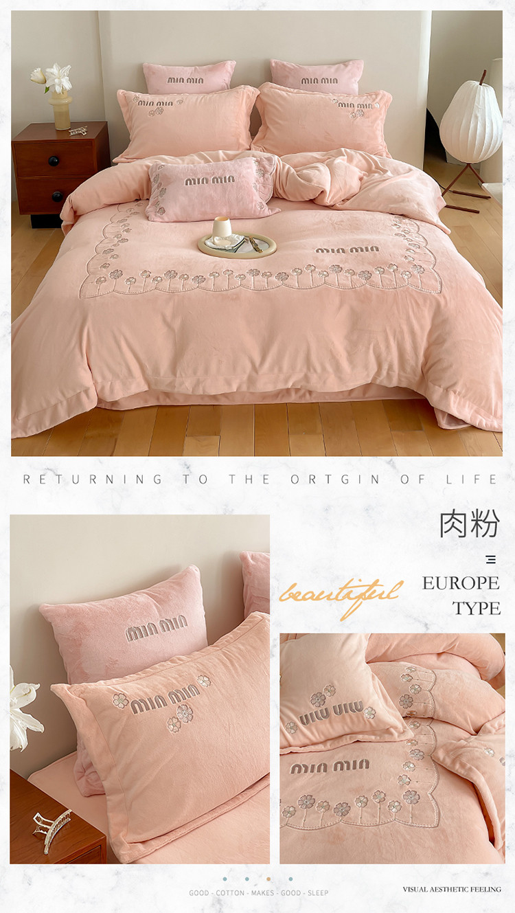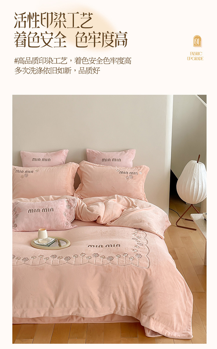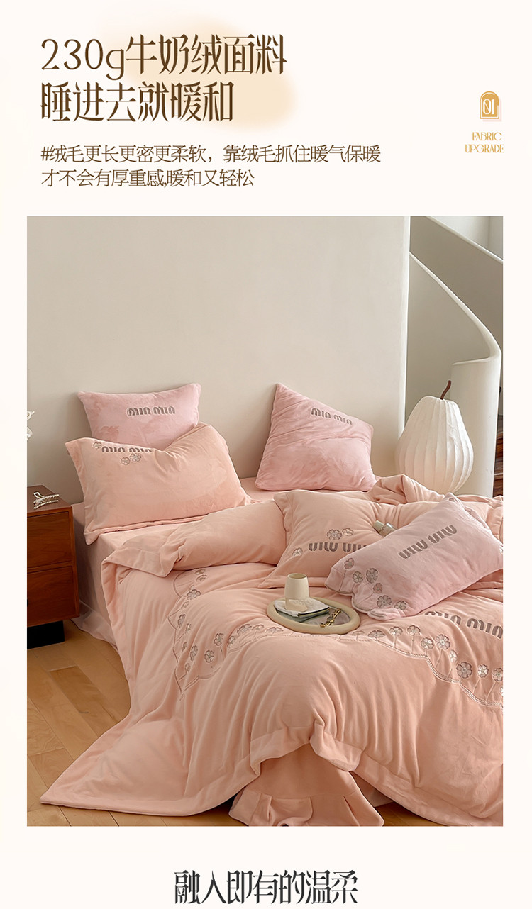 名品优仓 高克重230克牛奶绒绣花款四件套系列-林娜伊尔 林娜伊尔肉粉