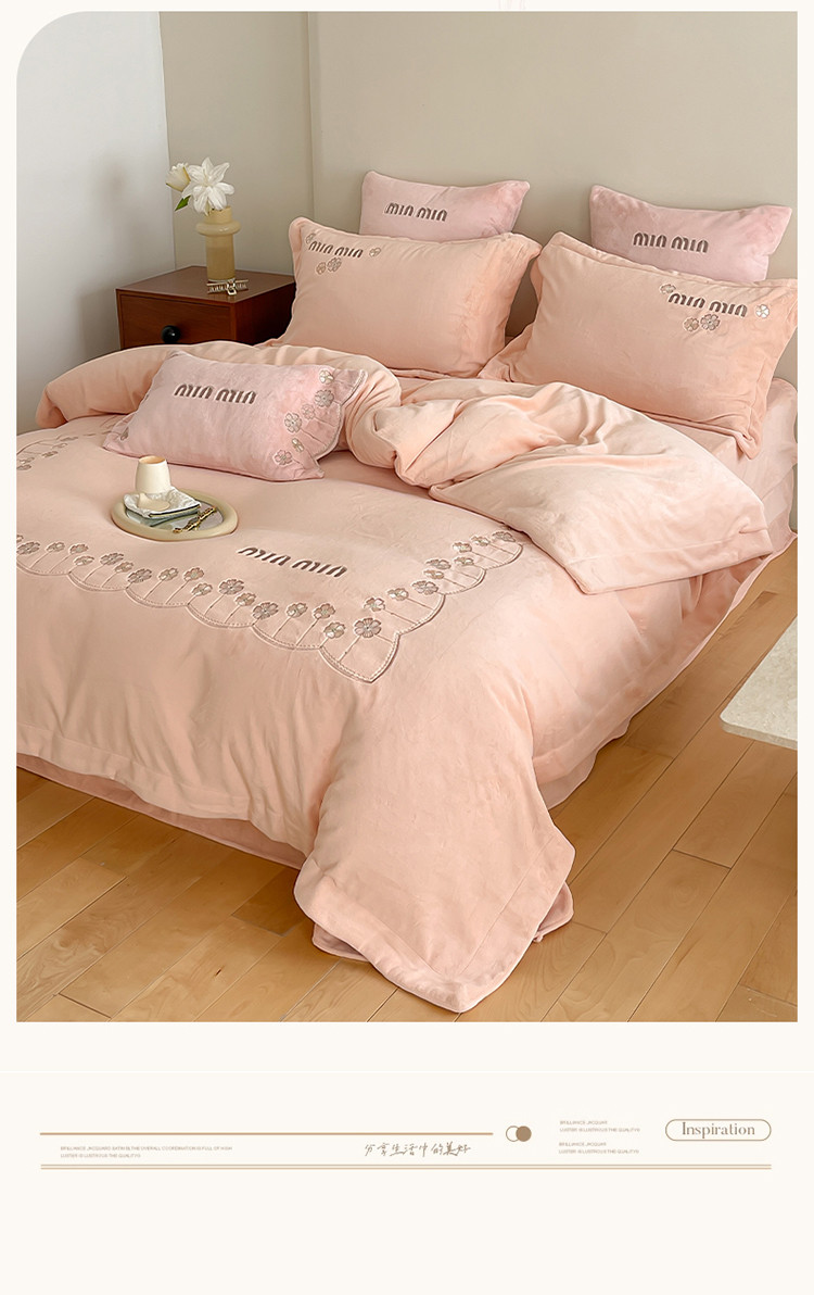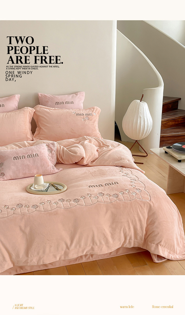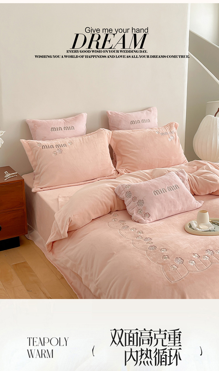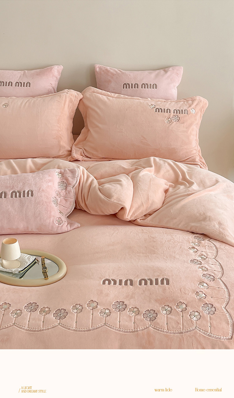 名品优仓 高克重230克牛奶绒绣花款四件套系列-林娜伊尔 林娜伊尔肉粉