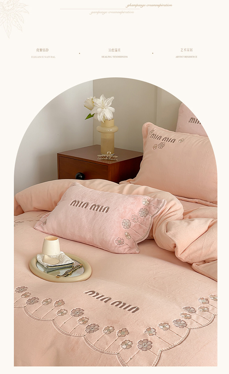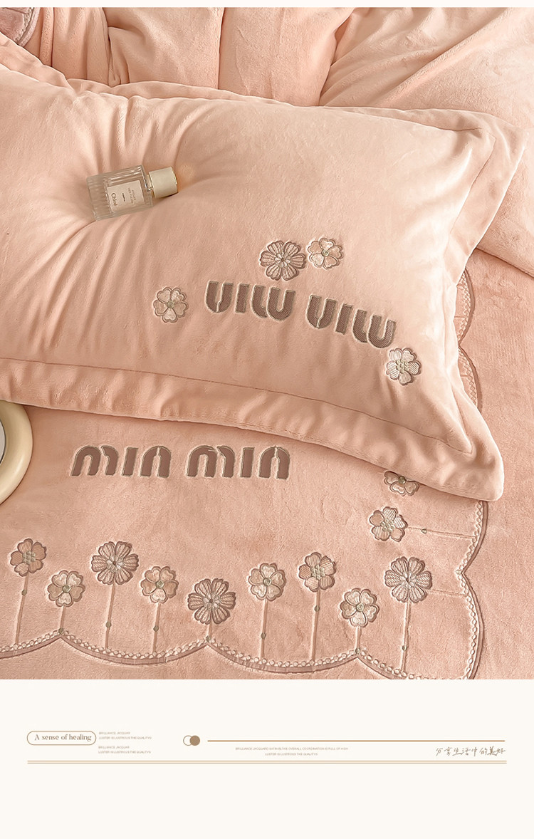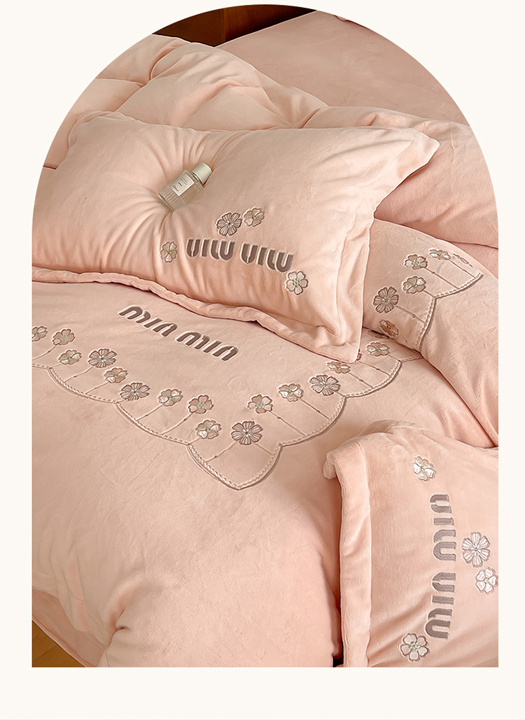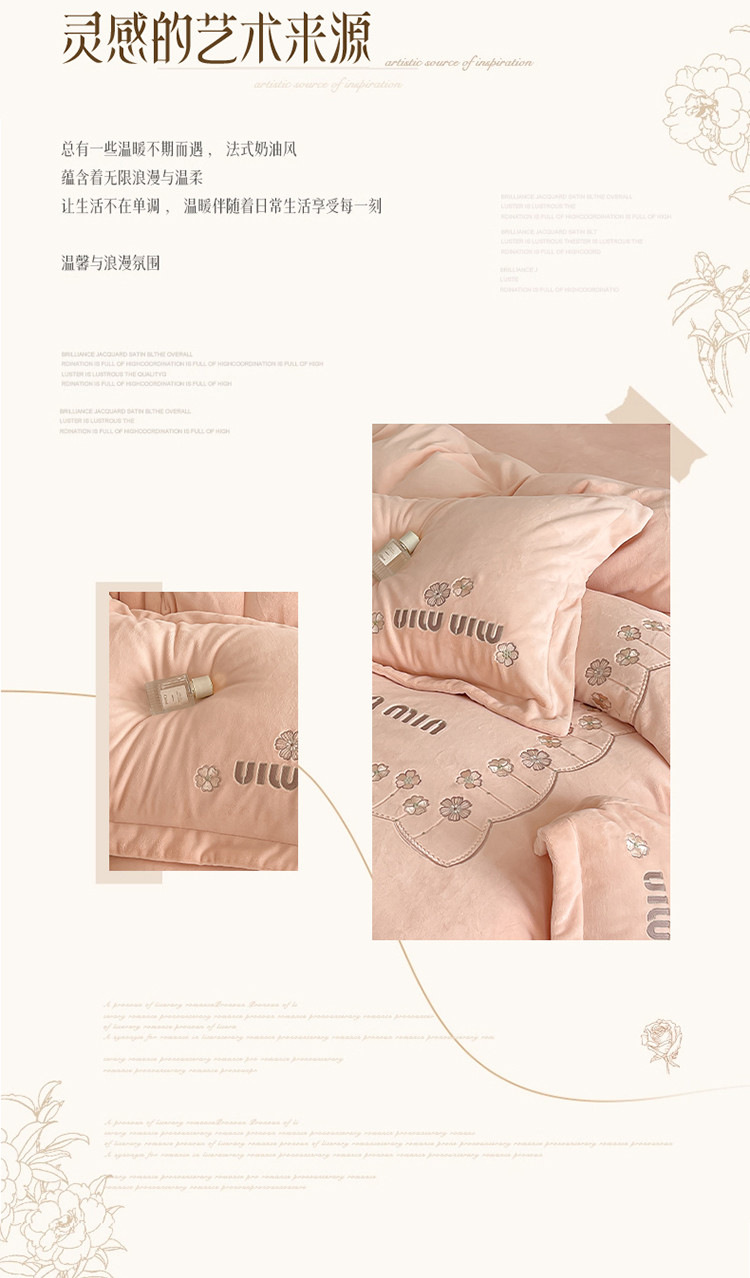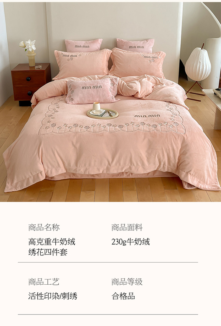 商品名称:名品优仓 高克重230克牛奶绒绣花款四件套系列-林娜伊尔 林娜伊尔肉粉