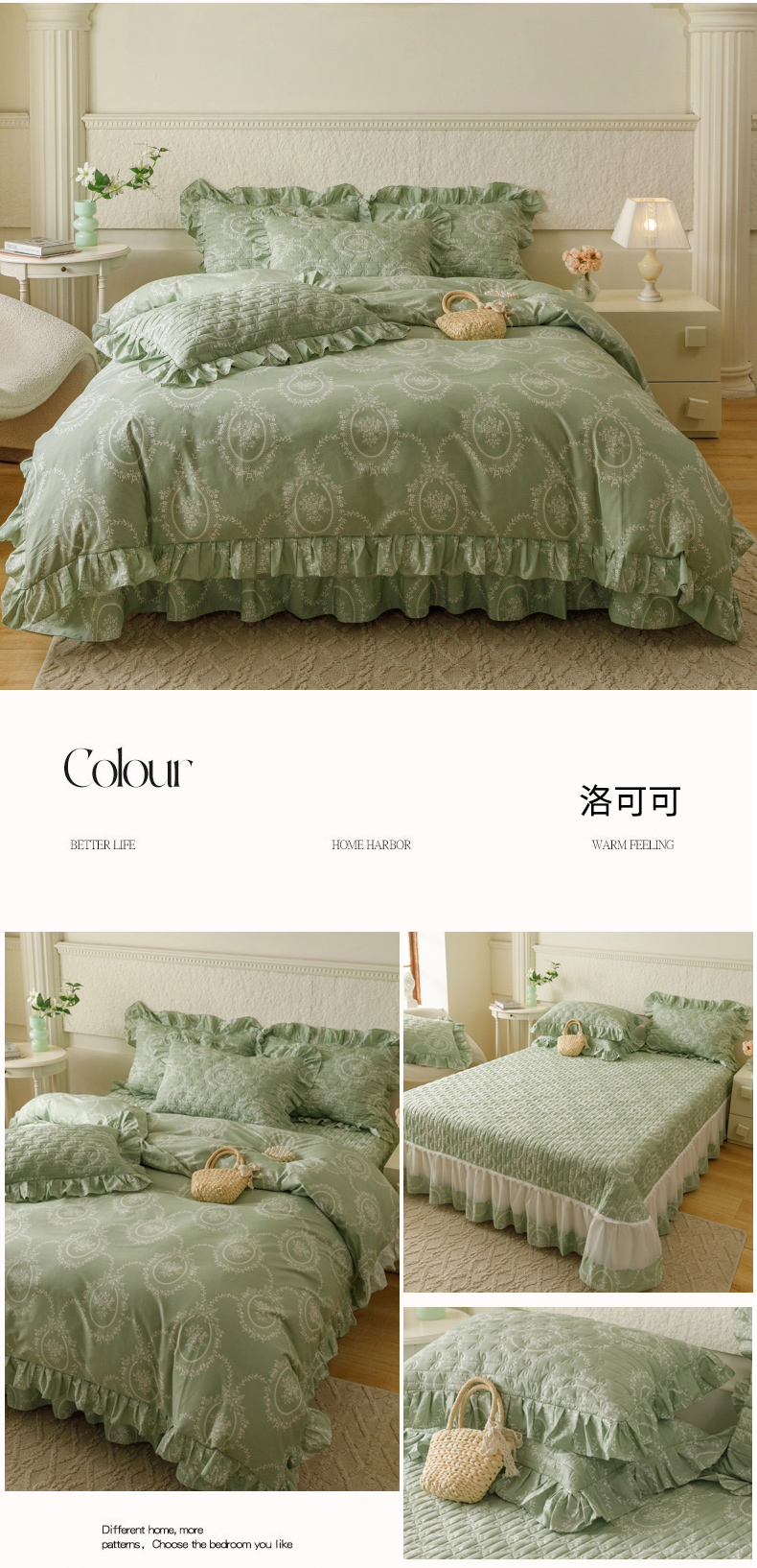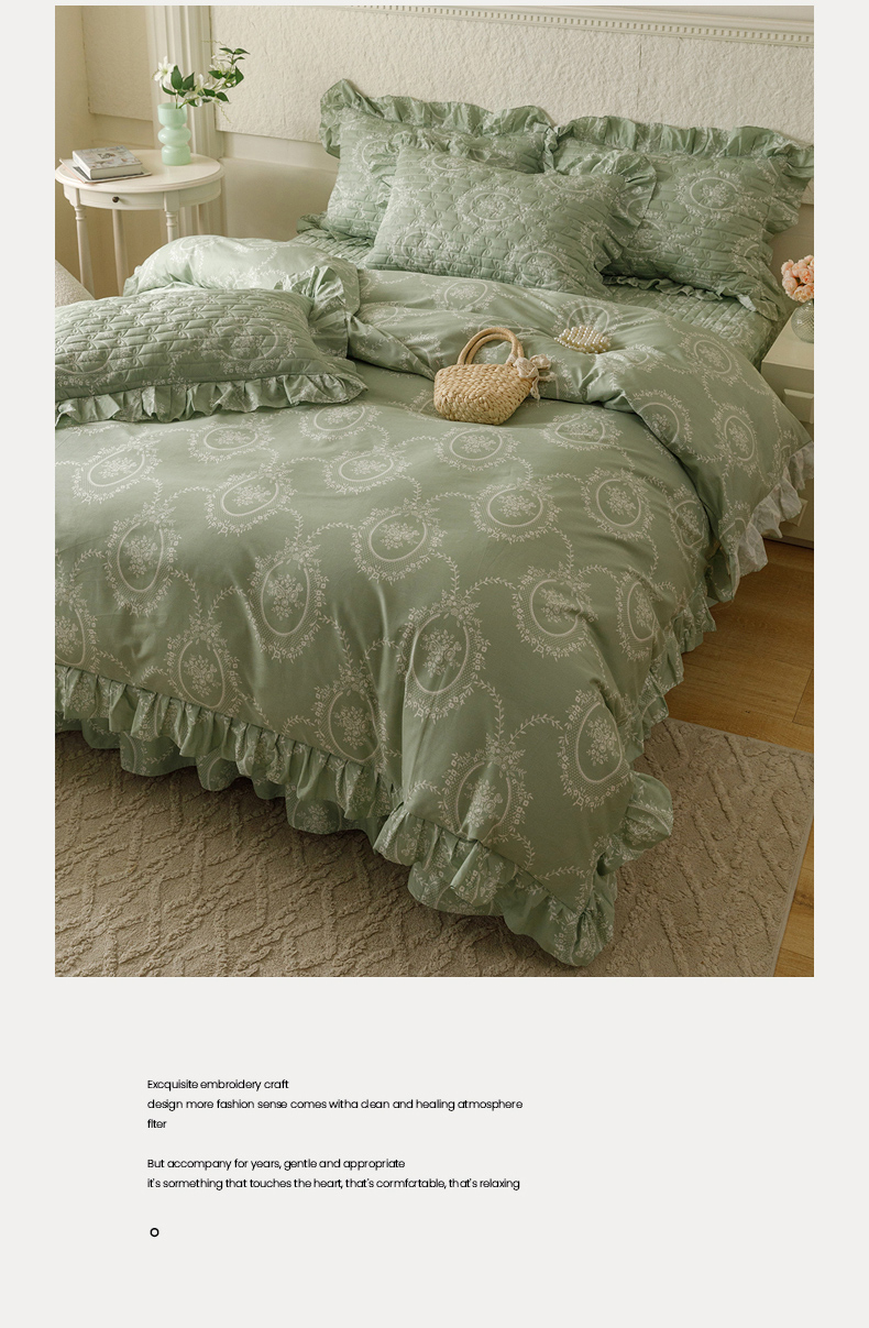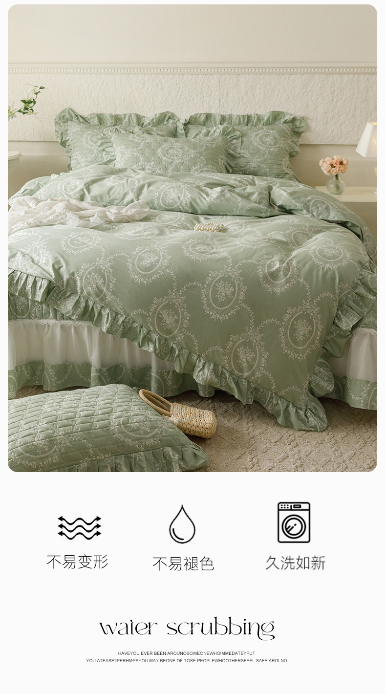 (总)胜权家纺 2025新款全棉13372法式床裙款活性印花四件套,莫妮卡-湖绿,莫妮卡-酒红