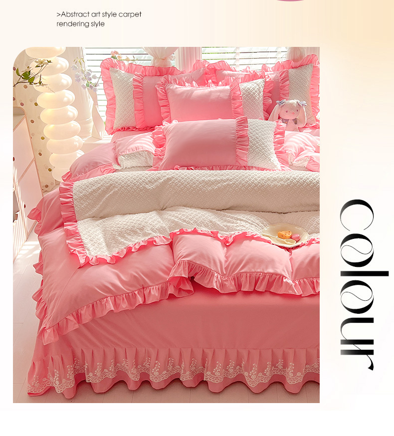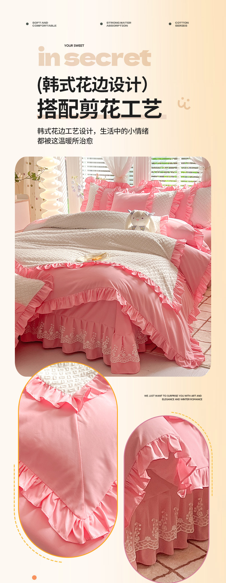 (总)芭比蔓 2024新款直播供货韩版花边款牛奶绒四件套,爱玛橙,宝石红,湖蓝,倾国粉,秋月黄,深灰,珍珠白,竹青绿