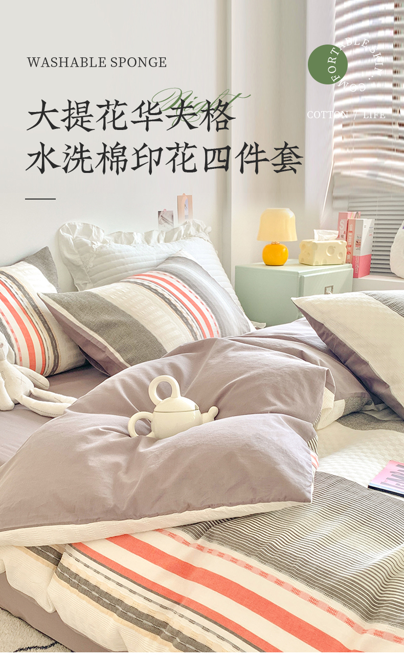 商品名称:莱茵家居 2024新款大提花华夫格水洗棉印花四件套 水洗提花-格调灰