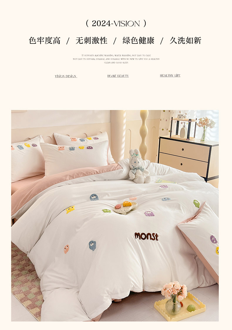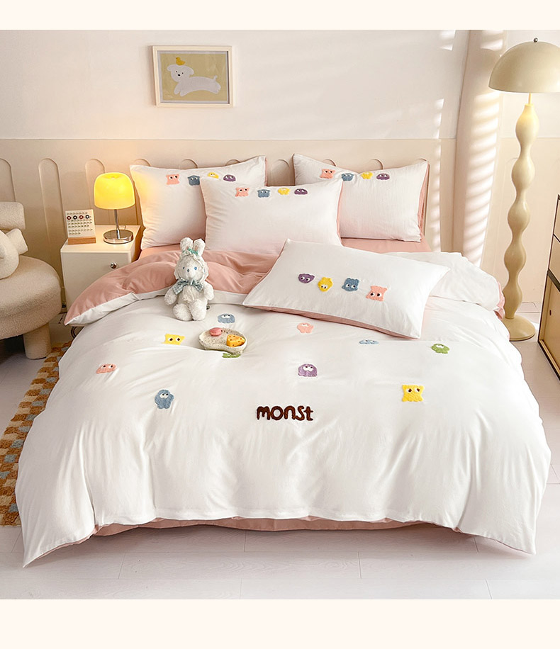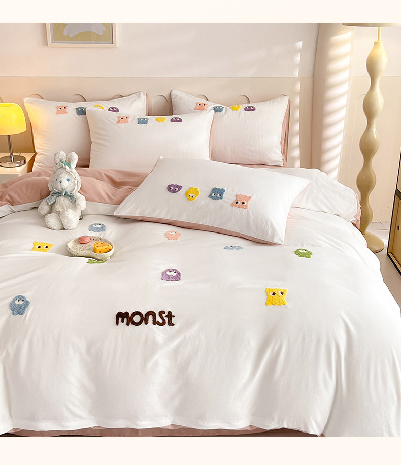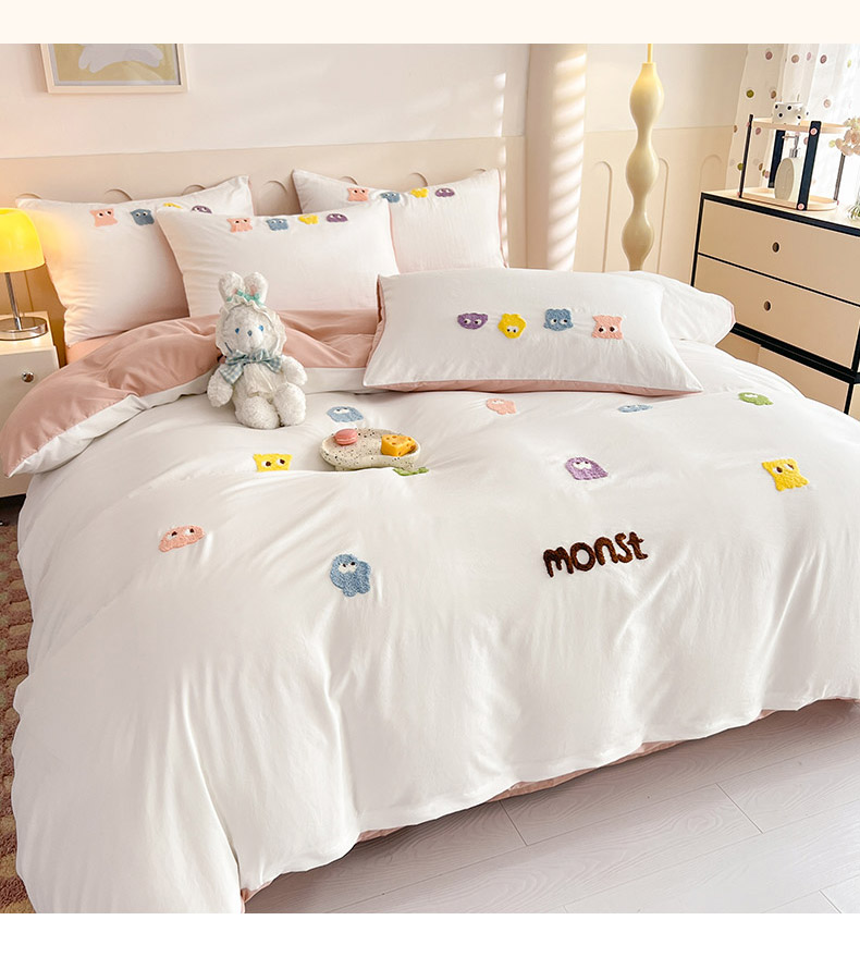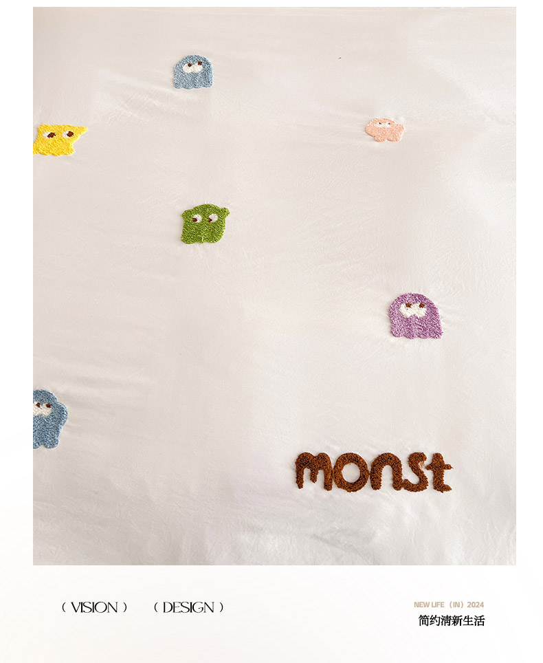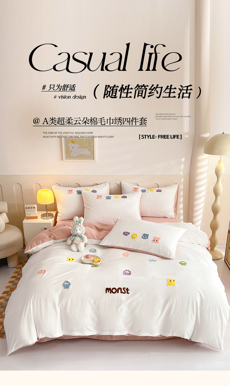 商品名称:妖妖家纺 2024新款超柔云朵棉毛巾绣四件套(小怪兽) 小怪兽奶白樱花粉