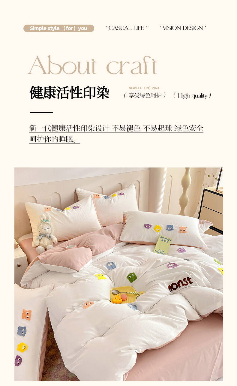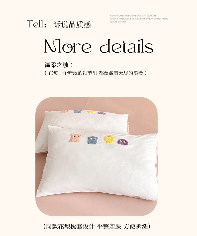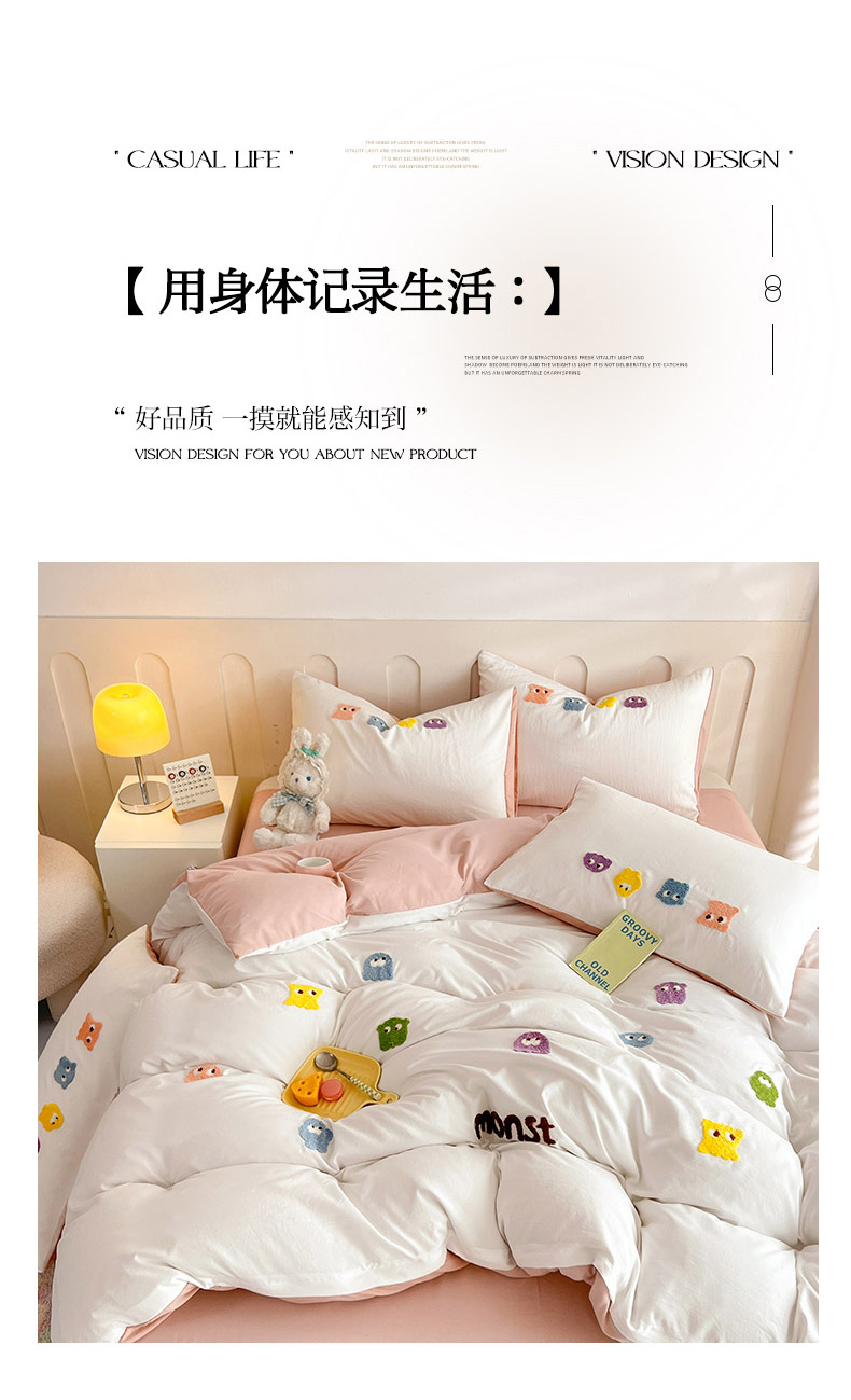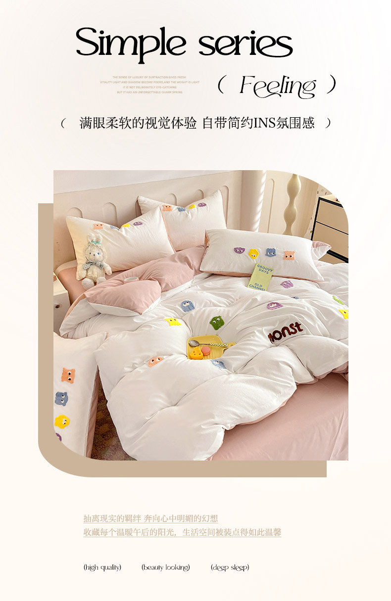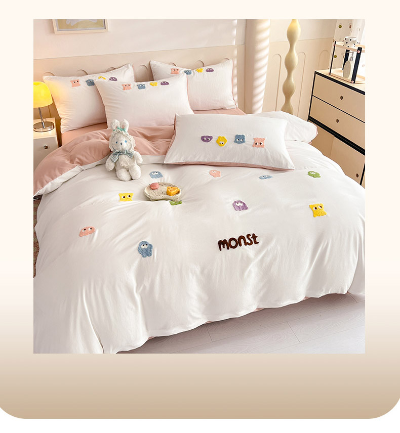 商品名称:妖妖家纺 2024新款超柔云朵棉毛巾绣四件套(小怪兽) 小怪兽奶白樱花粉