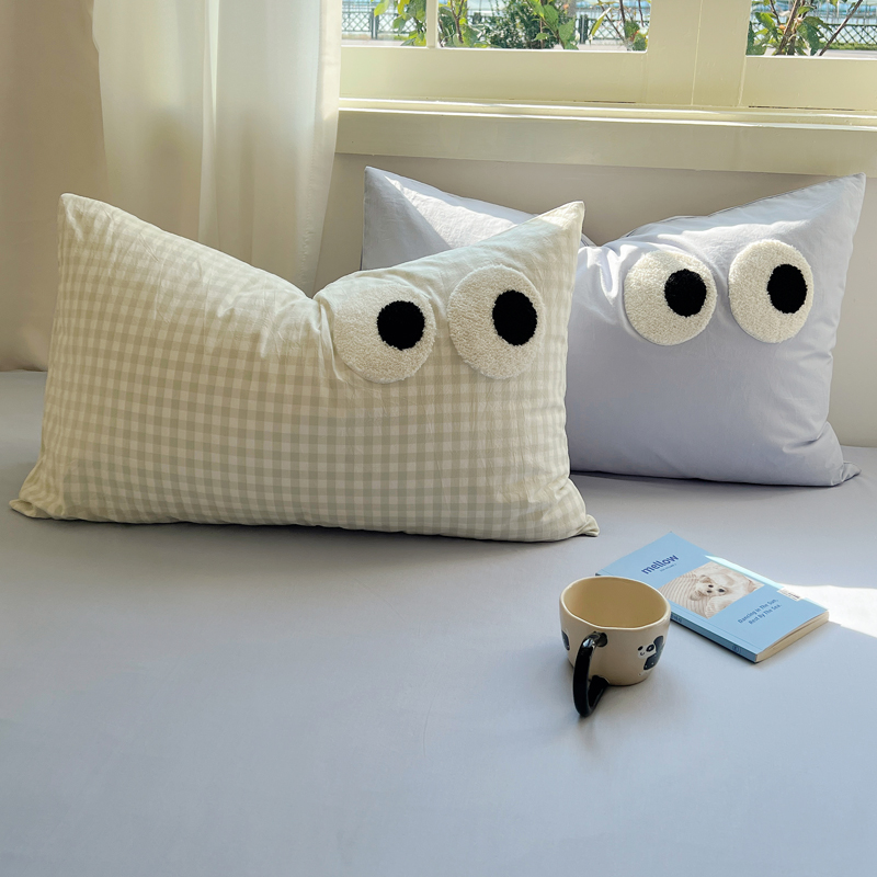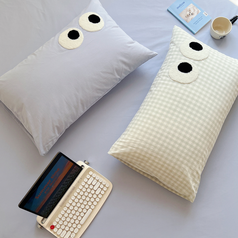 盼季家纺 2024新款萌趣毛巾绣大眼睛枕套 大眼-奶蓝+浅绿格