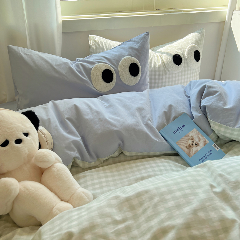 商品名称:盼季家纺 2024新款萌趣毛巾绣大眼睛枕套 大眼-奶蓝+浅绿格