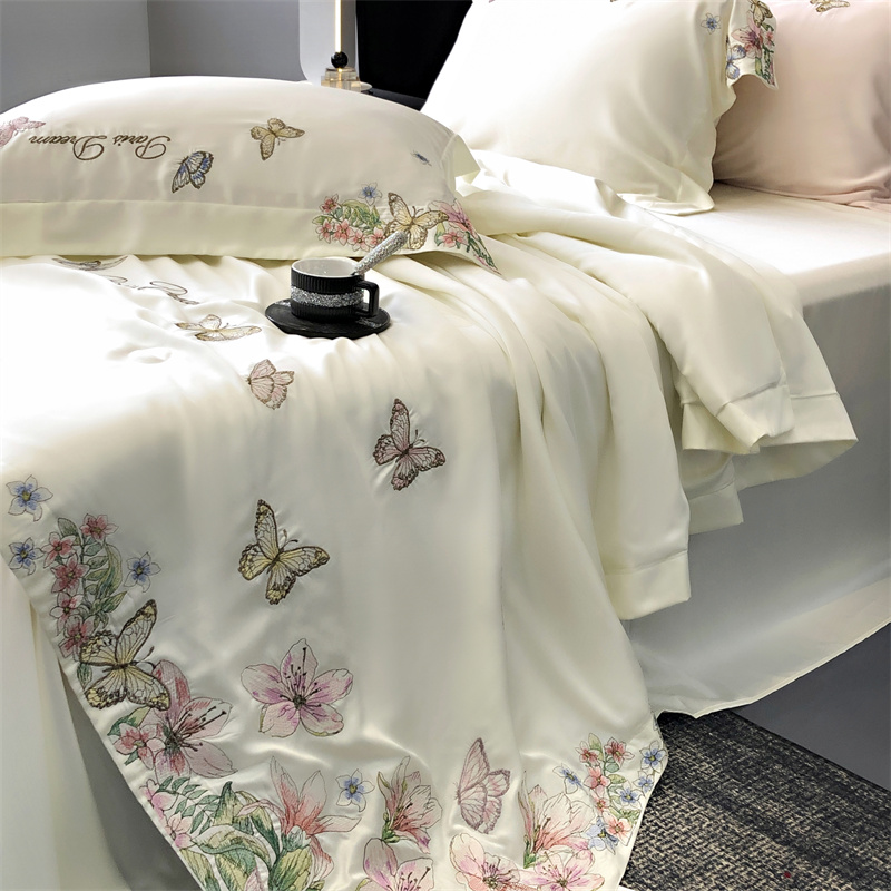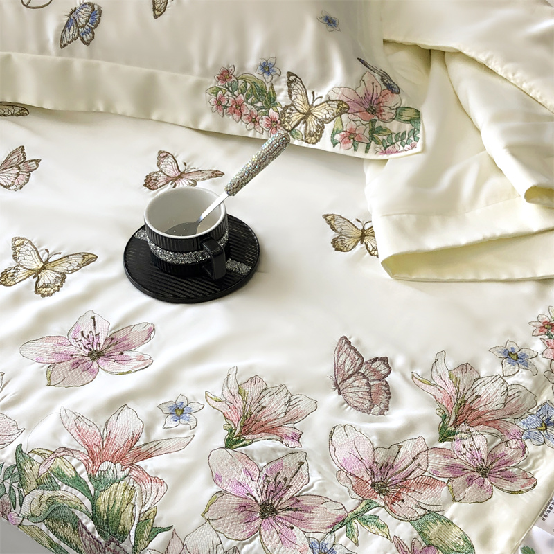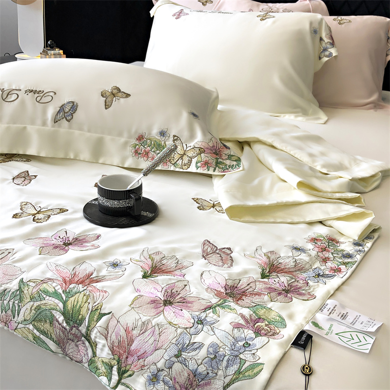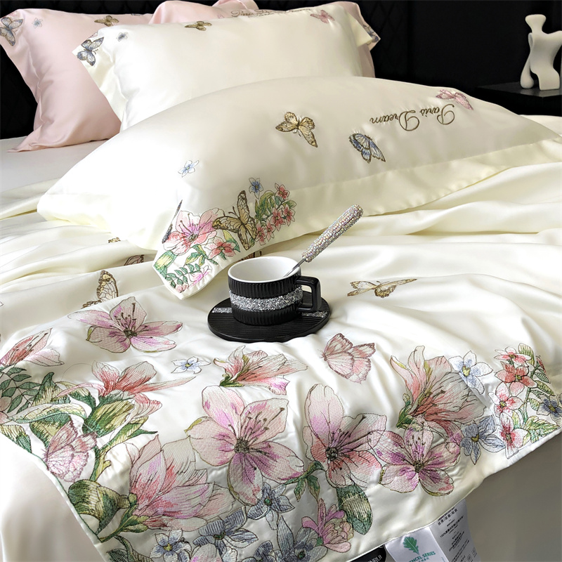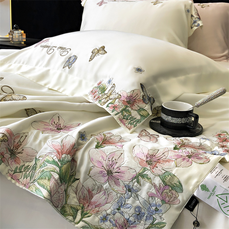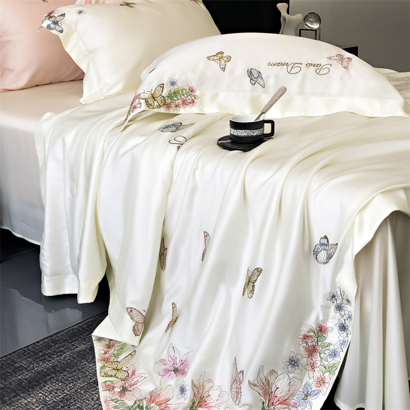商品名称:馨蕊家居 2024新款80s兰精天丝刺绣夏被四件套-蝶舞花间 蝶舞花间-元气白桃