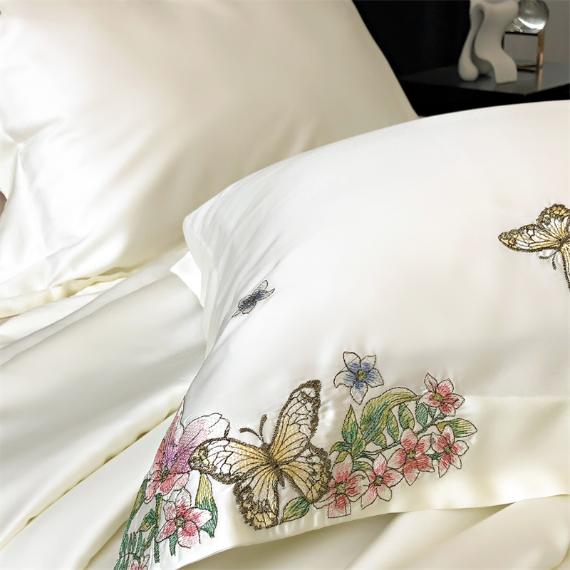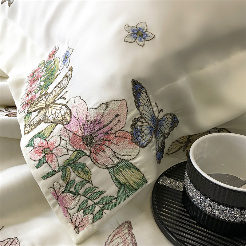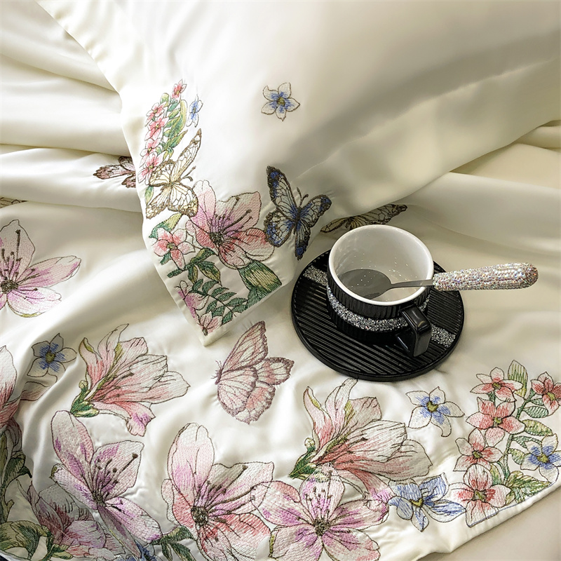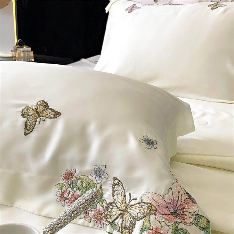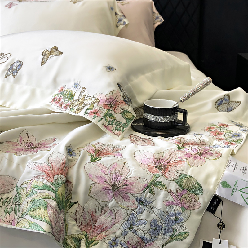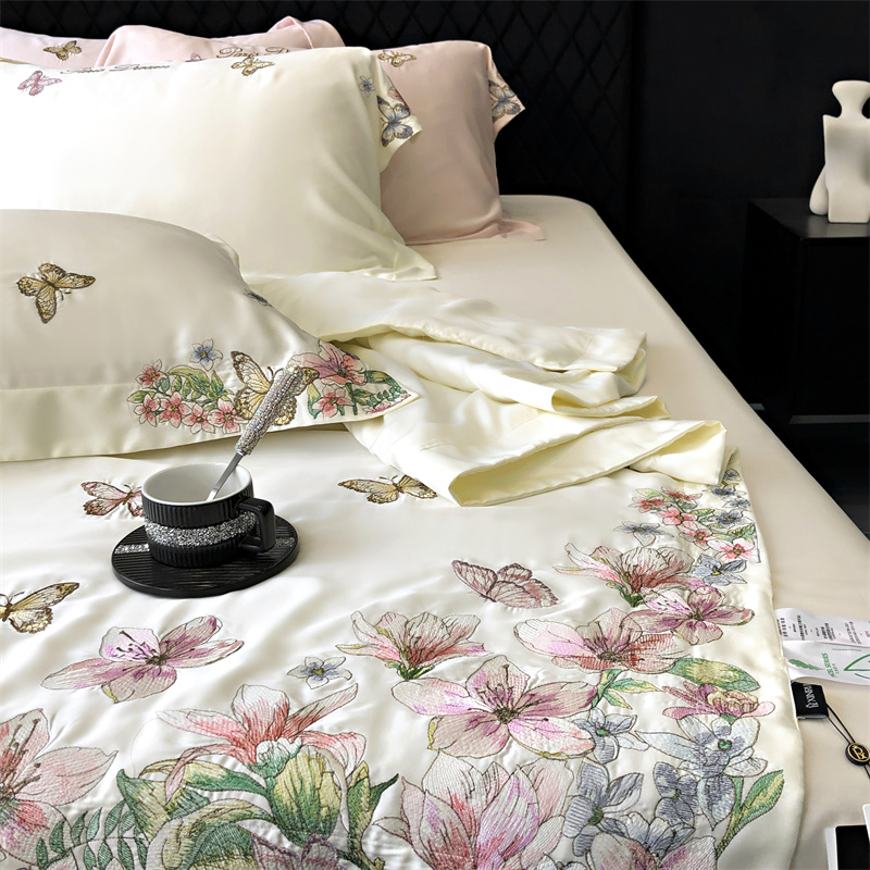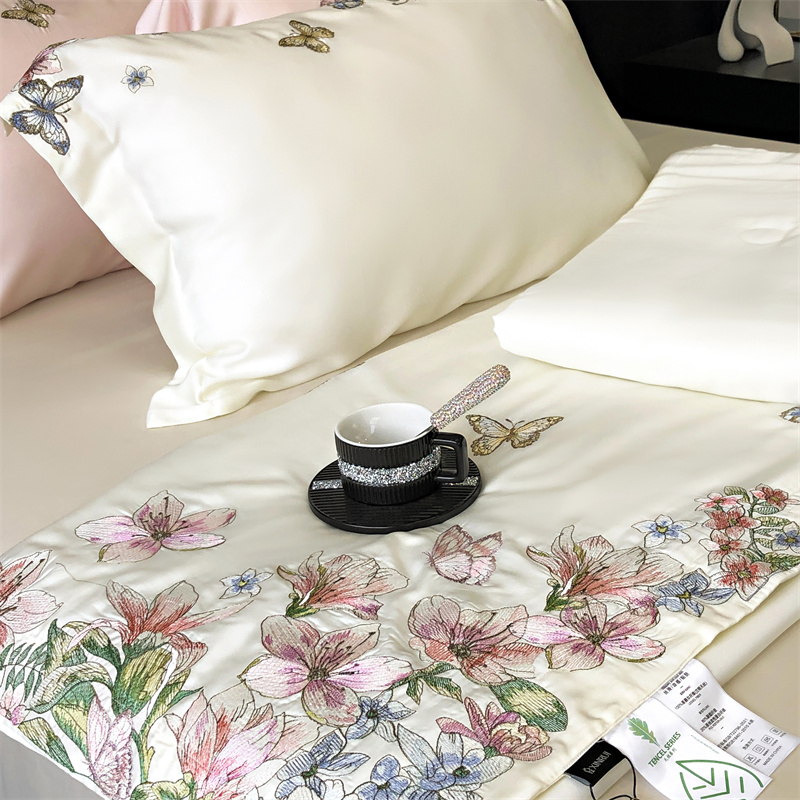 商品名称:馨蕊家居 2024新款80s兰精天丝刺绣夏被四件套-蝶舞花间 蝶舞花间-元气白桃